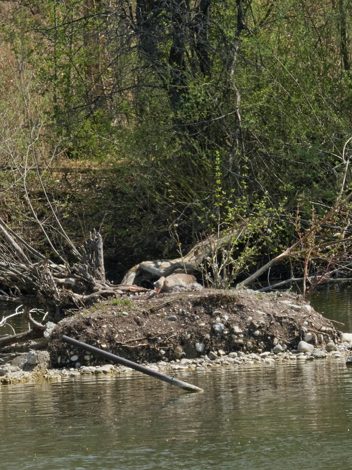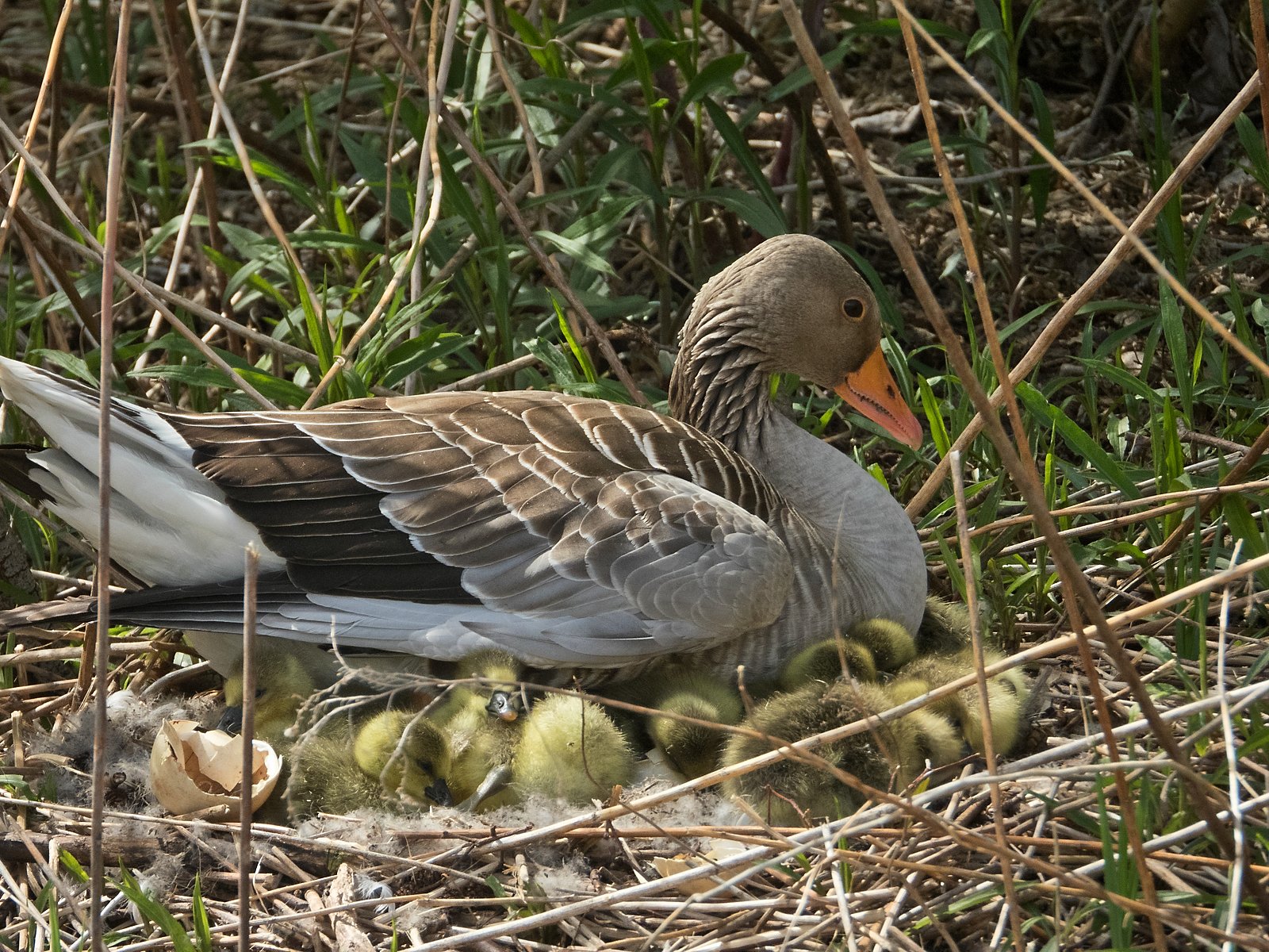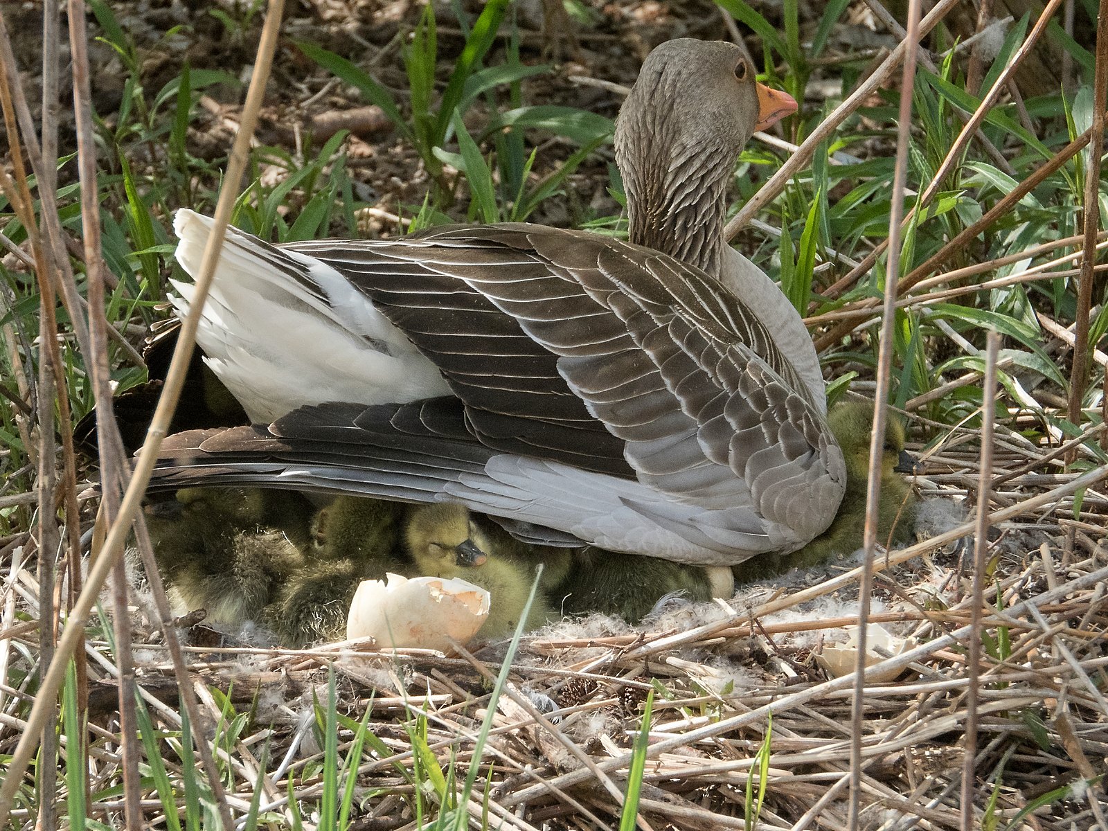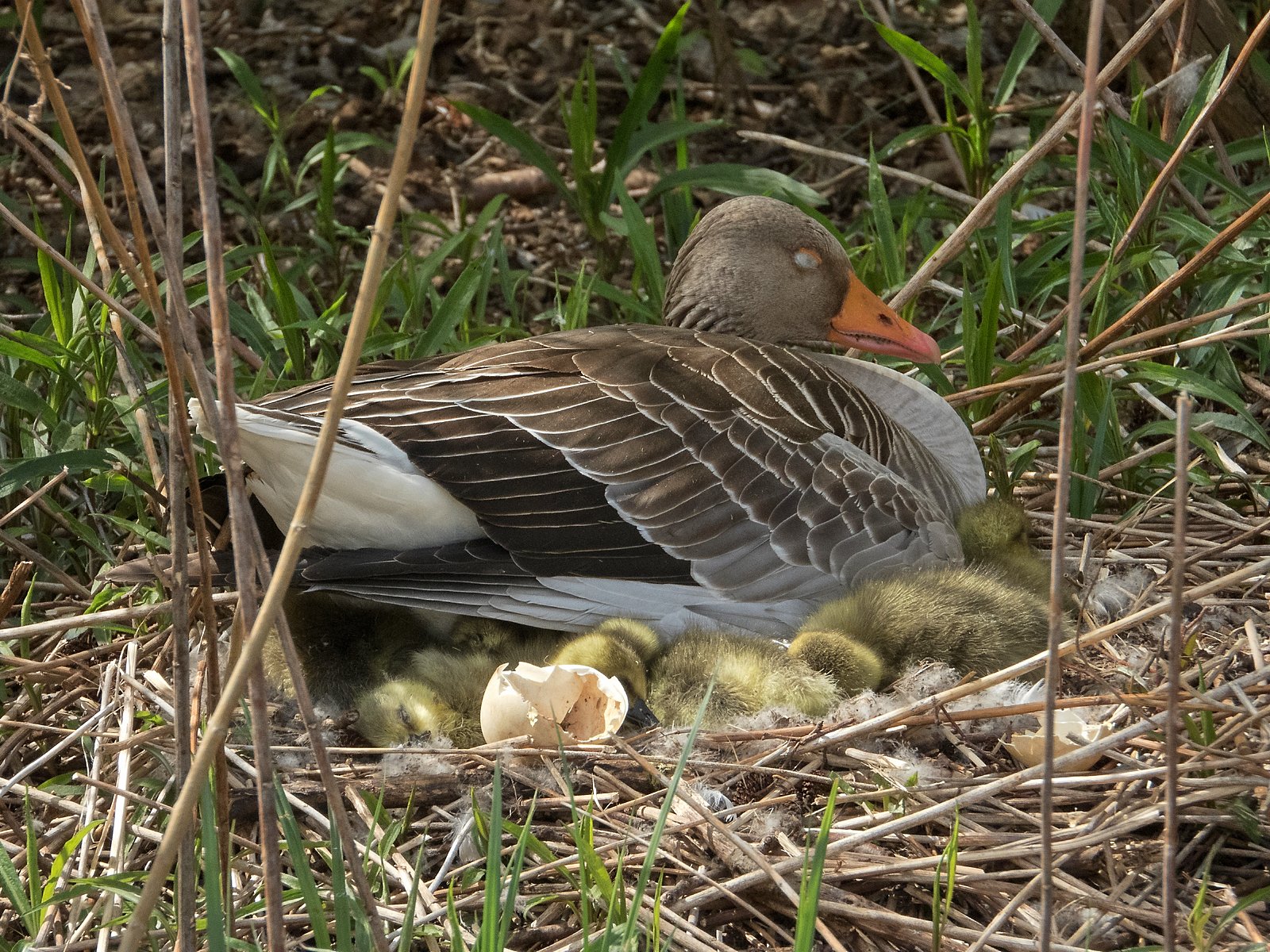 Es geht weiter im Takt mit Gösseln: Nun das zweite Nest mit Anzahl von acht Gänsekindern. Sichtbar ist jetzt nur noch ein Graugansnest im Stausee. Nach wie vor brüten drei Kanadagänse und ein Höckerschwan.