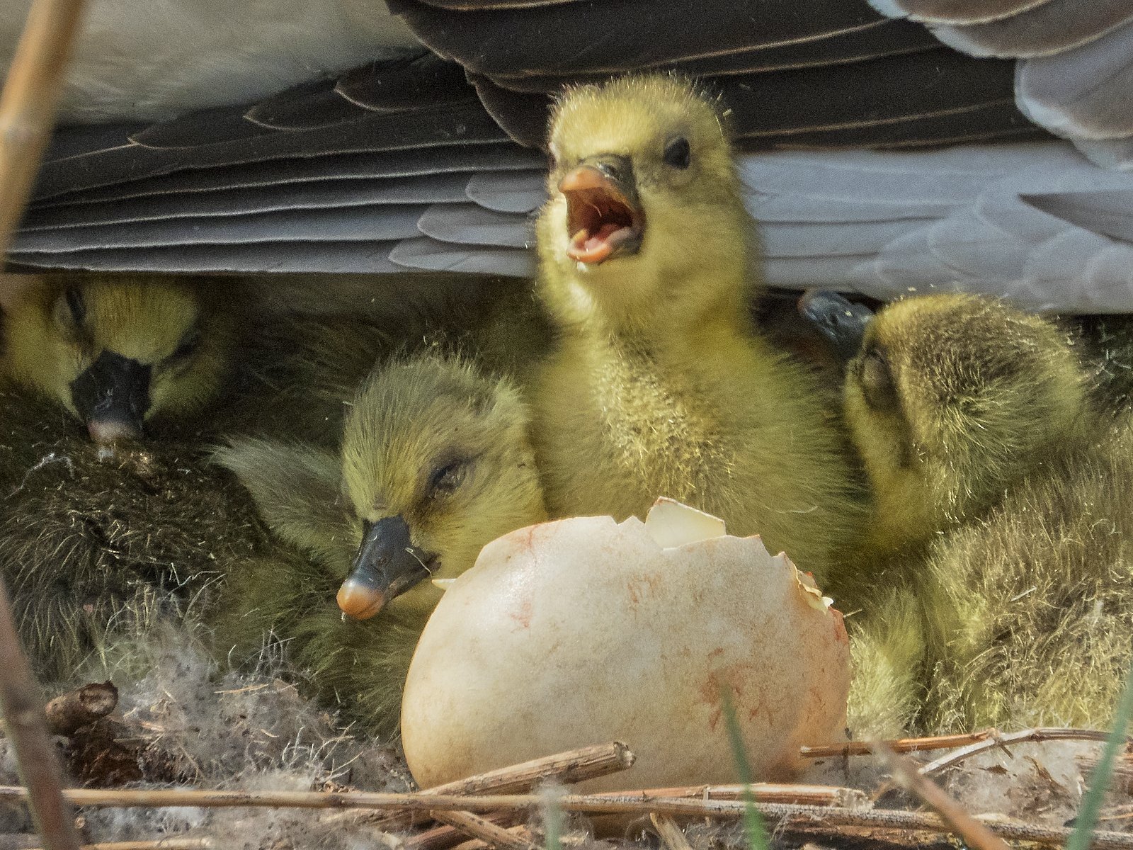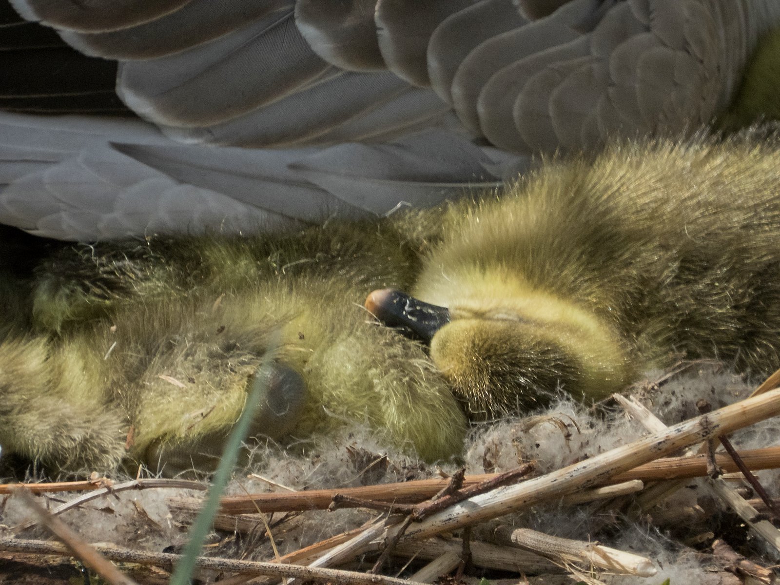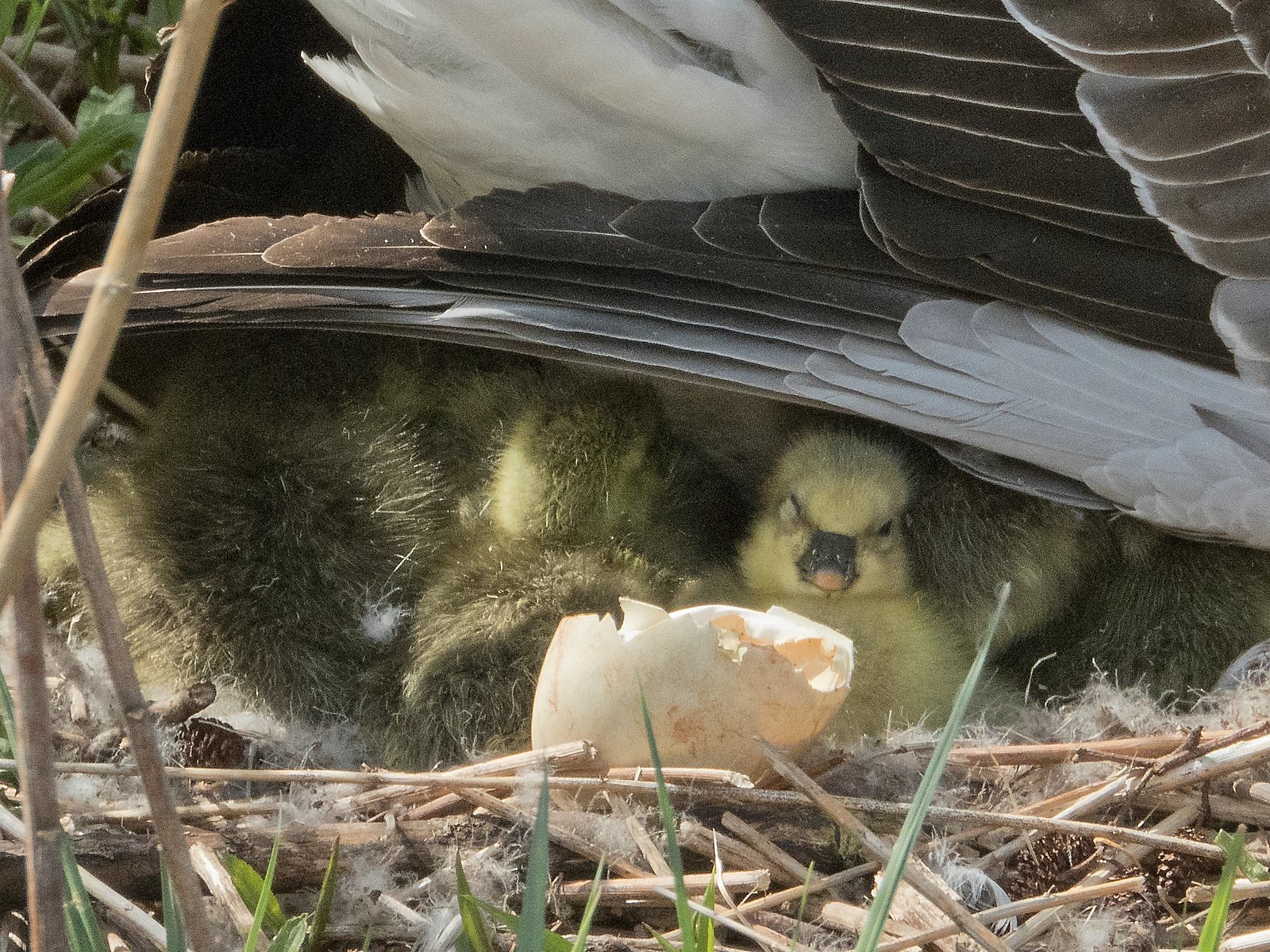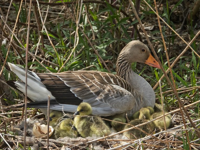 Es geht weiter im Takt mit Gösseln: Nun das zweite Nest mit Anzahl von acht Gänsekindern. Sichtbar ist jetzt nur noch ein Graugansnest im Stausee. Nach wie vor brüten drei Kanadagänse und ein Höckerschwan.