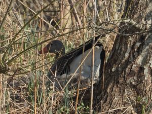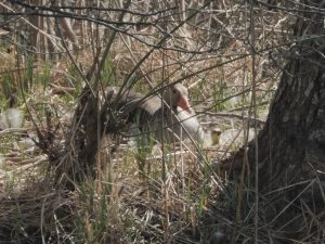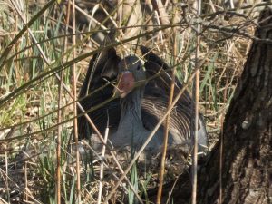 Bislang schlüpften, wie berichtet, zumindest bei drei Graugansfamilien Gössel. Derzeit sind acht Graugansnester besetzt. Die Feststellungen können sich natürlich immer nur auf die entdeckten Nester und Familien beziehen. Neben dem Schwanenpaar brüten noch zwei Kanadagänse, das dritte Kanadaganspaar lässt sich noch Zeit. Das Graugans-Gössel-Nest von gestern, 4. April, wurde heute von einer Graugans aufgesucht, geprüft und offenbar für gut befunden als neuer Nistplatz. Zeitweise wurde die Gans allerdings von anderen Graugänsen in der Nähe verjagt: