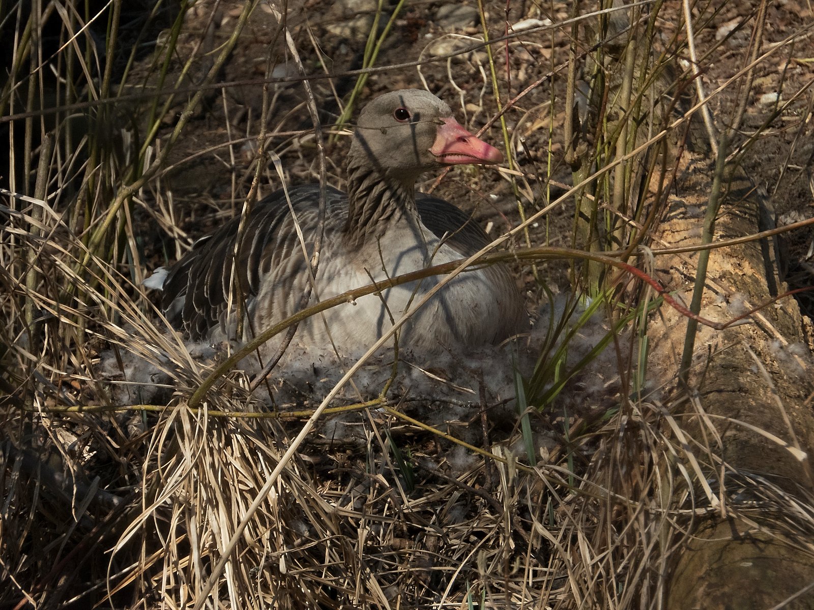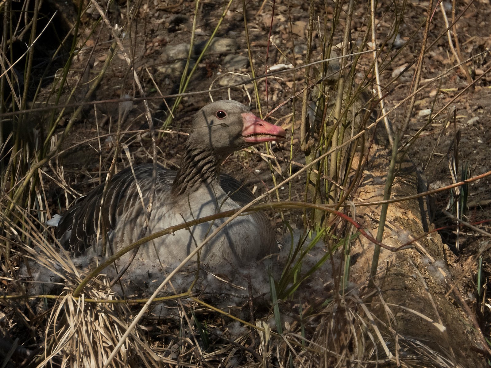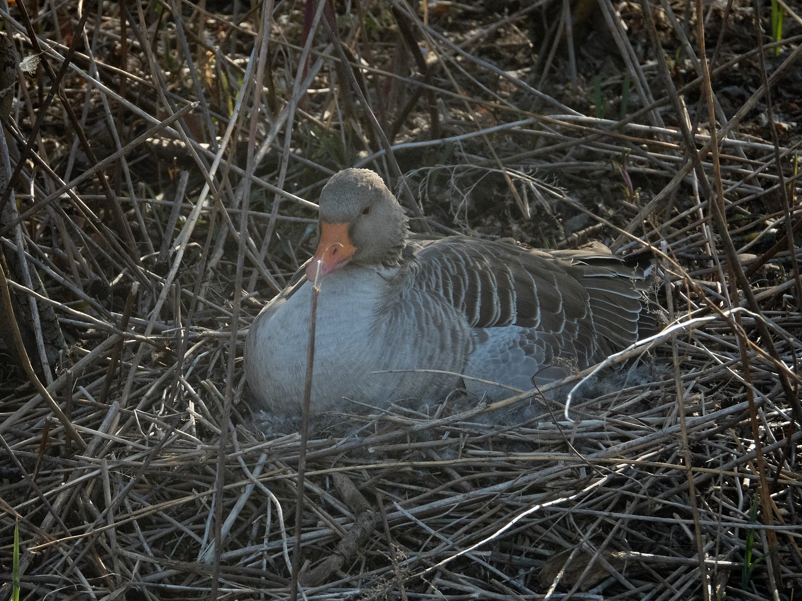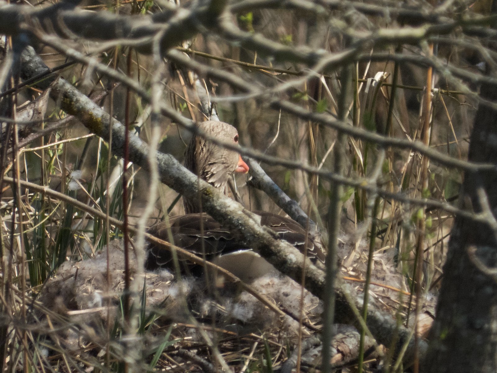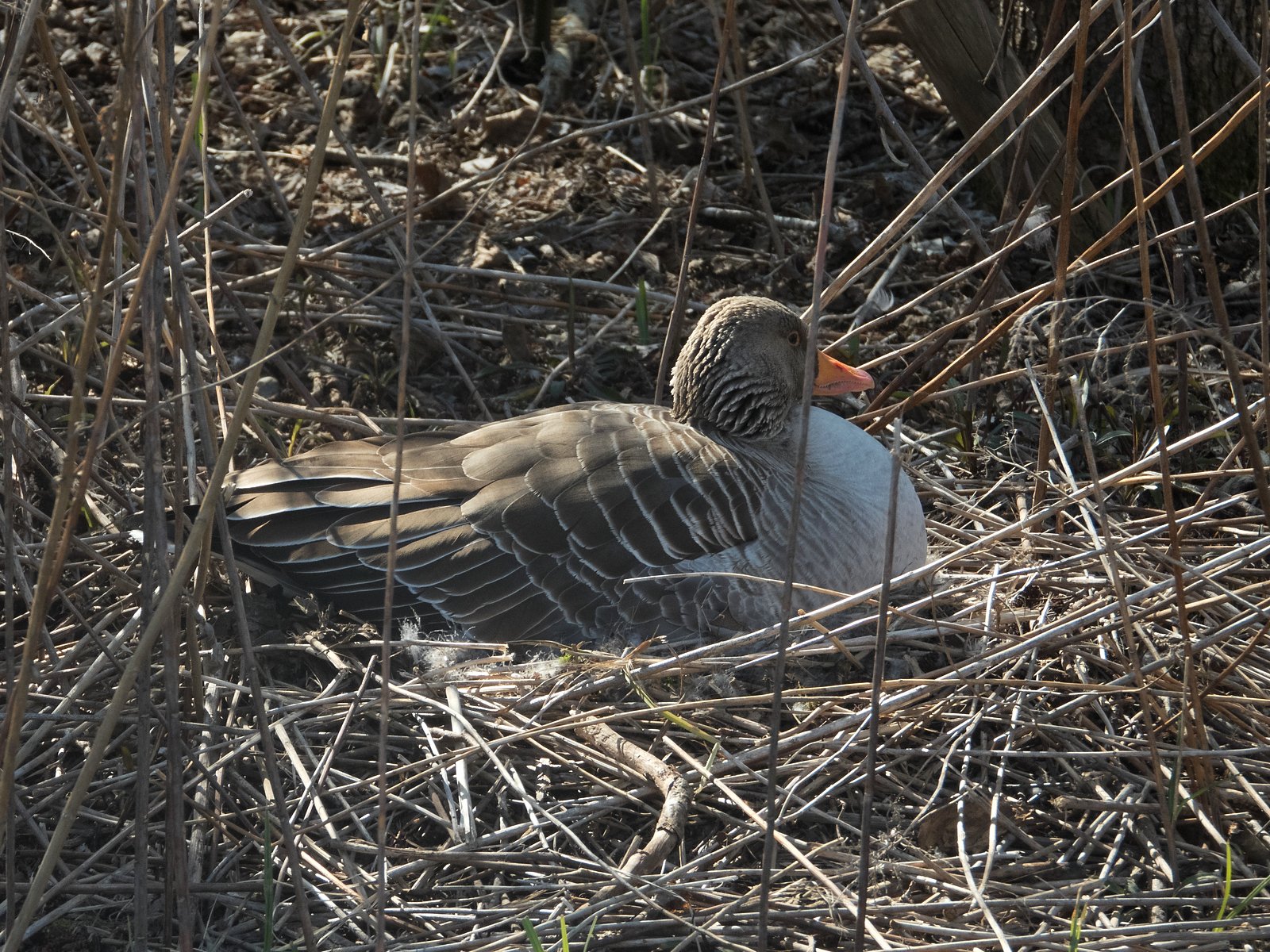 Bislang schlüpften, wie berichtet, zumindest bei drei Graugansfamilien Gössel. Derzeit sind acht Graugansnester besetzt. Die Feststellungen können sich natürlich immer nur auf die entdeckten Nester und Familien beziehen. Neben dem Schwanenpaar brüten noch zwei Kanadagänse, das dritte Kanadaganspaar lässt sich noch Zeit. Das Graugans-Gössel-Nest von gestern, 4. April, wurde heute von einer Graugans aufgesucht, geprüft und offenbar für gut befunden als neuer Nistplatz. Zeitweise wurde die Gans allerdings von anderen Graugänsen in der Nähe verjagt:
