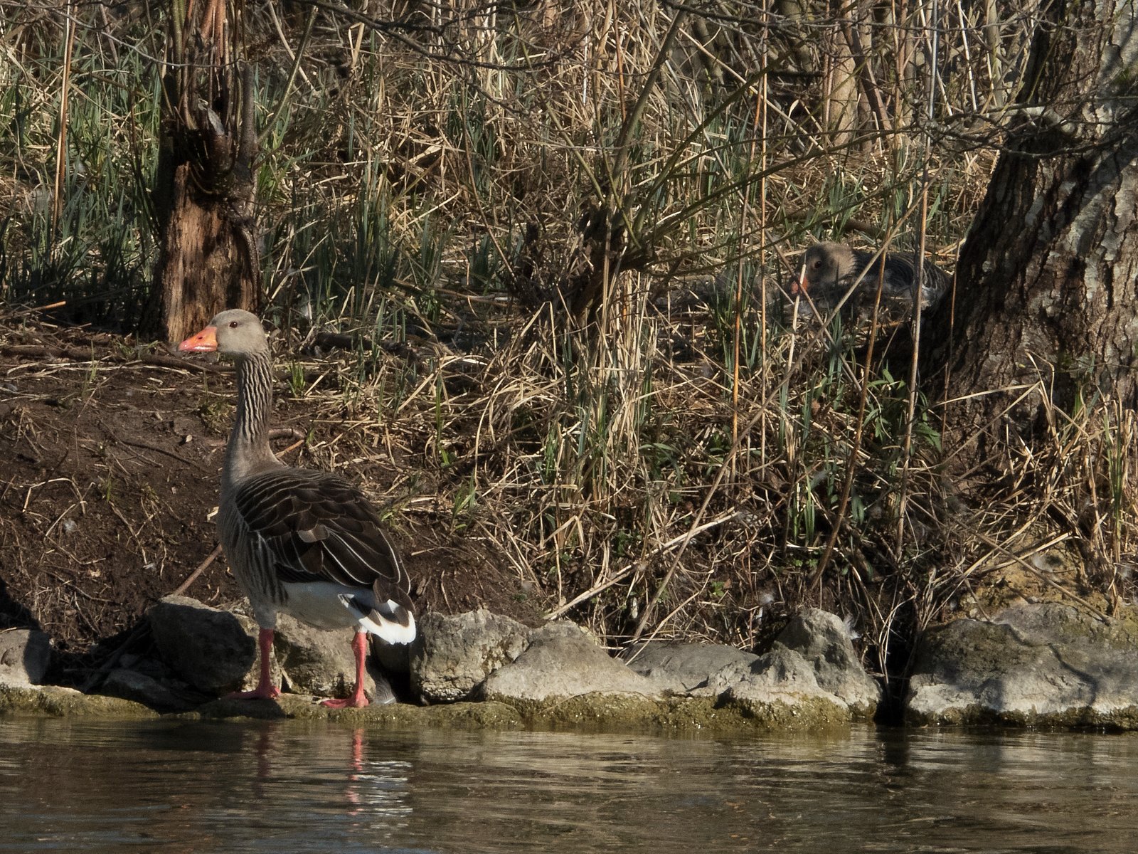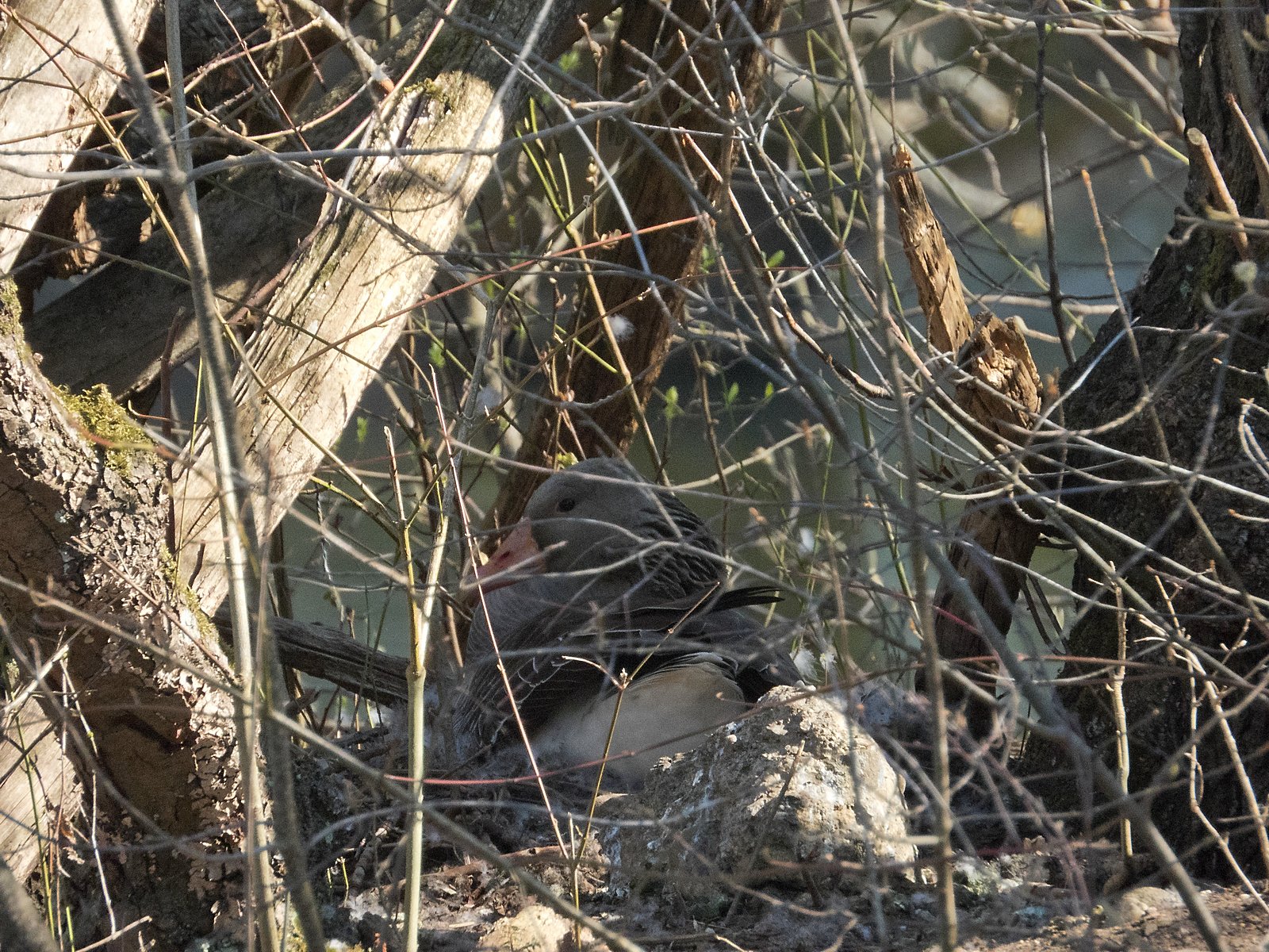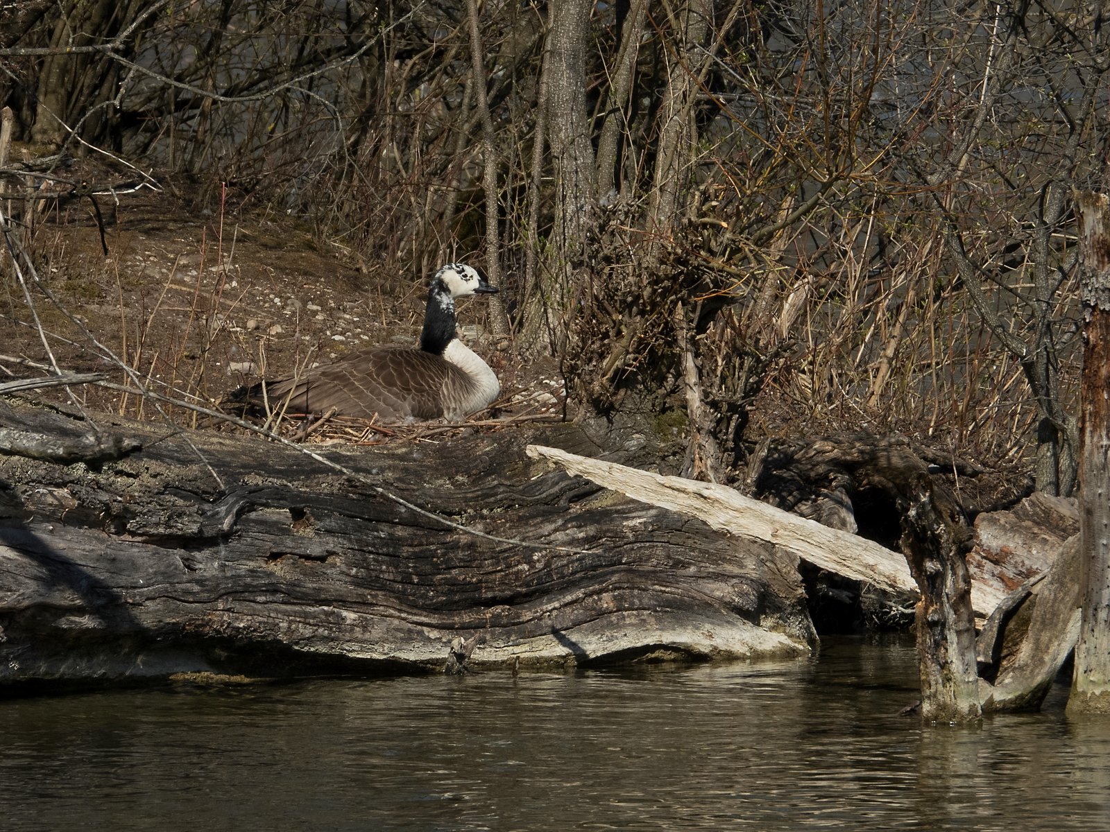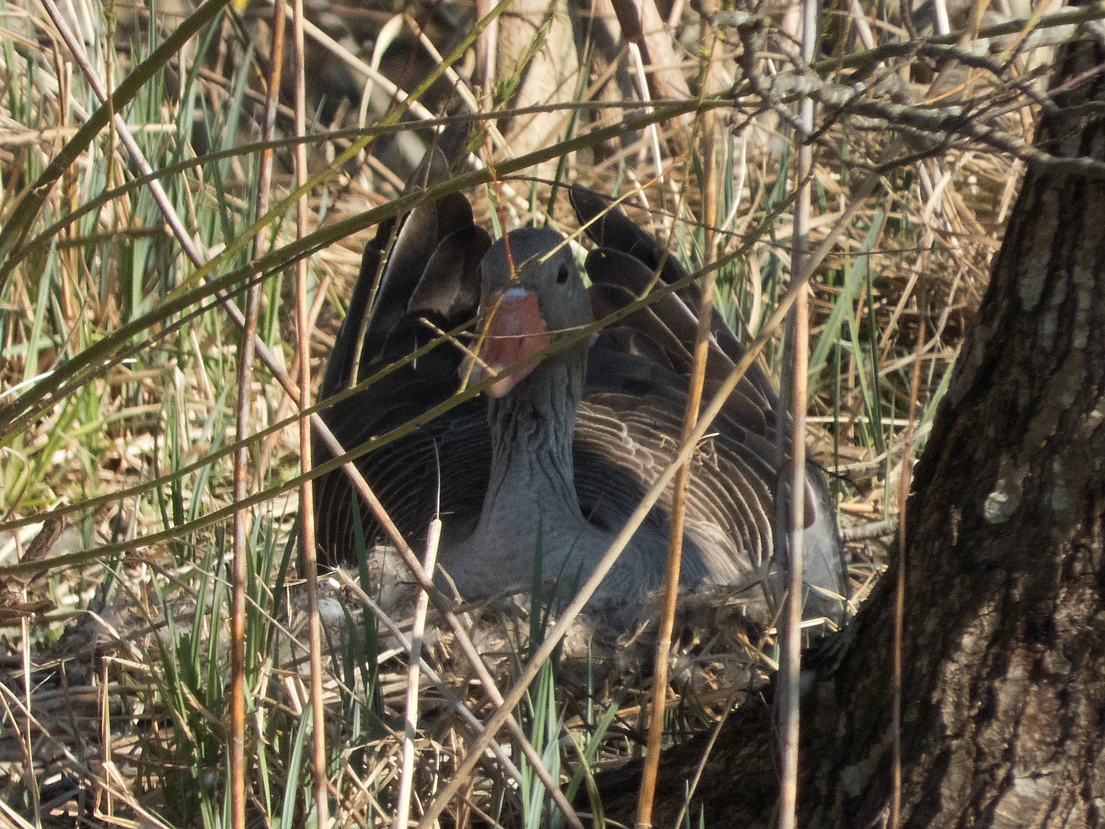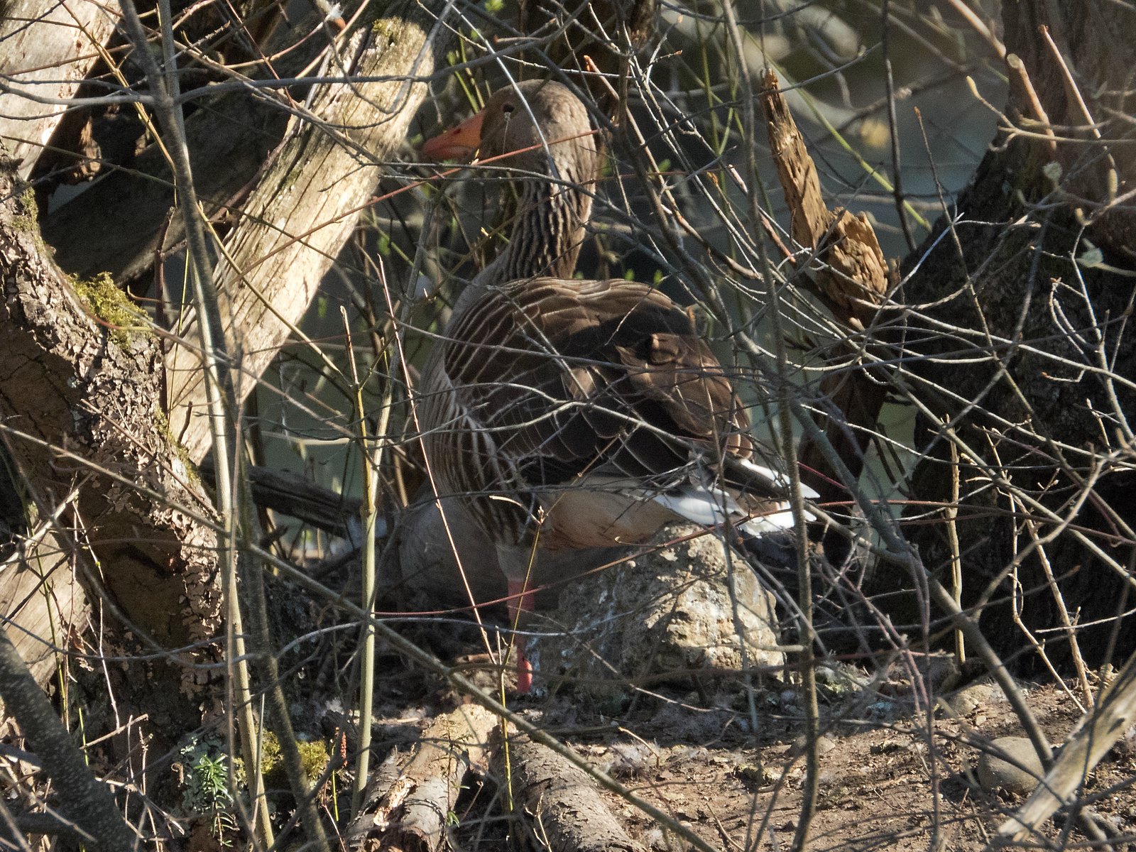 Bislang schlüpften, wie berichtet, zumindest bei drei Graugansfamilien Gössel. Derzeit sind acht Graugansnester besetzt. Die Feststellungen können sich natürlich immer nur auf die entdeckten Nester und Familien beziehen. Neben dem Schwanenpaar brüten noch zwei Kanadagänse, das dritte Kanadaganspaar lässt sich noch Zeit. Das Graugans-Gössel-Nest von gestern, 4. April, wurde heute von einer Graugans aufgesucht, geprüft und offenbar für gut befunden als neuer Nistplatz. Zeitweise wurde die Gans allerdings von anderen Graugänsen in der Nähe verjagt: