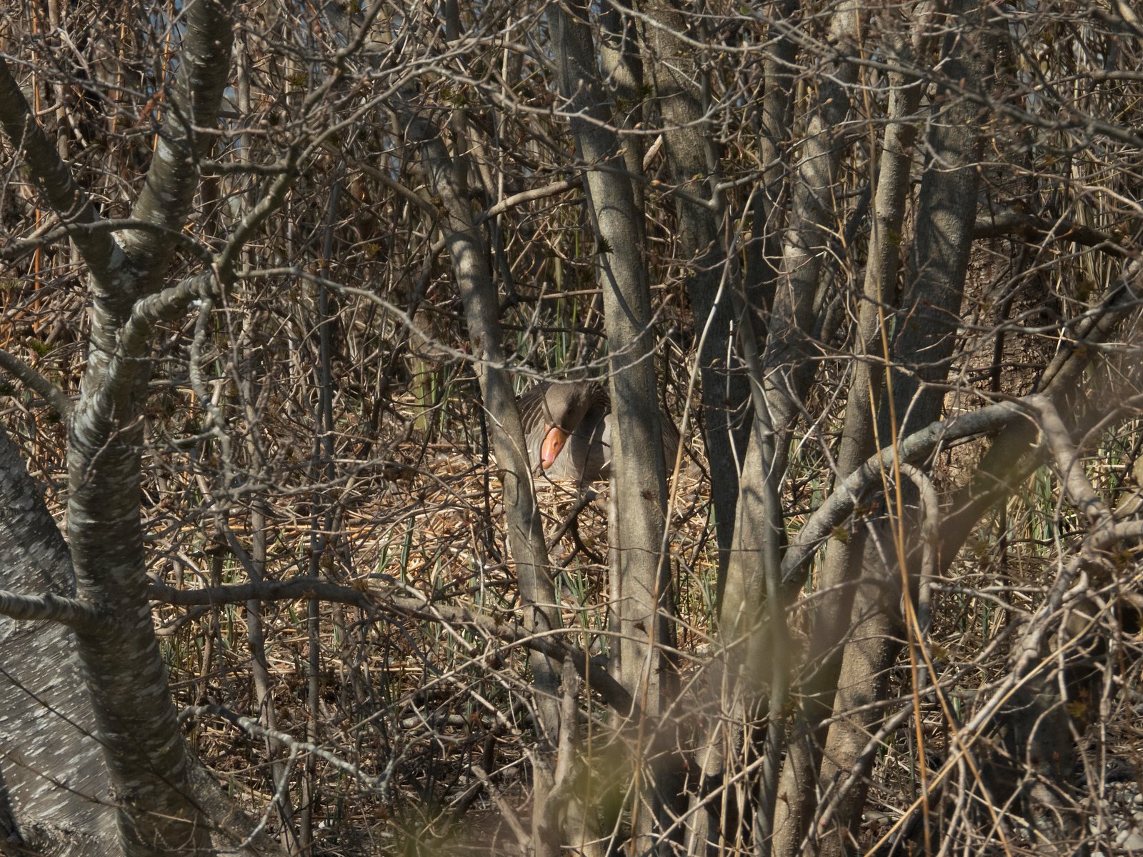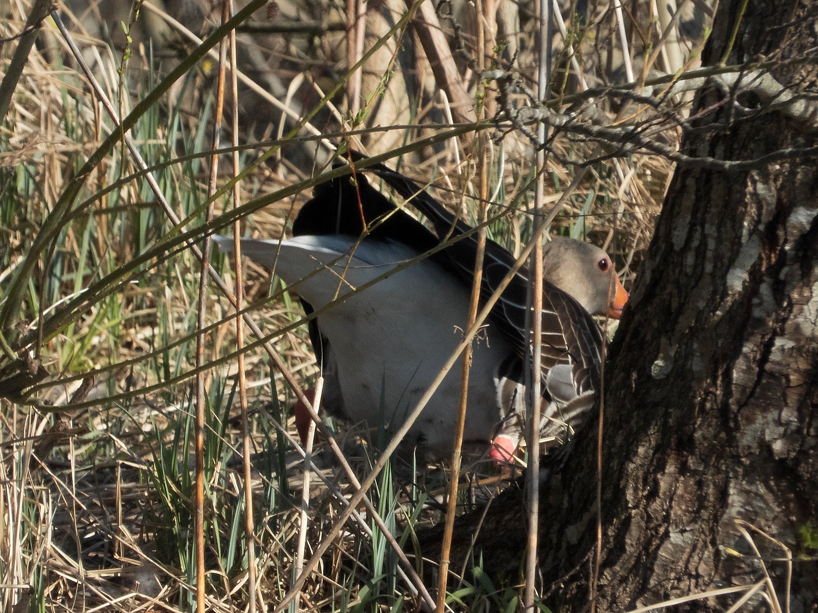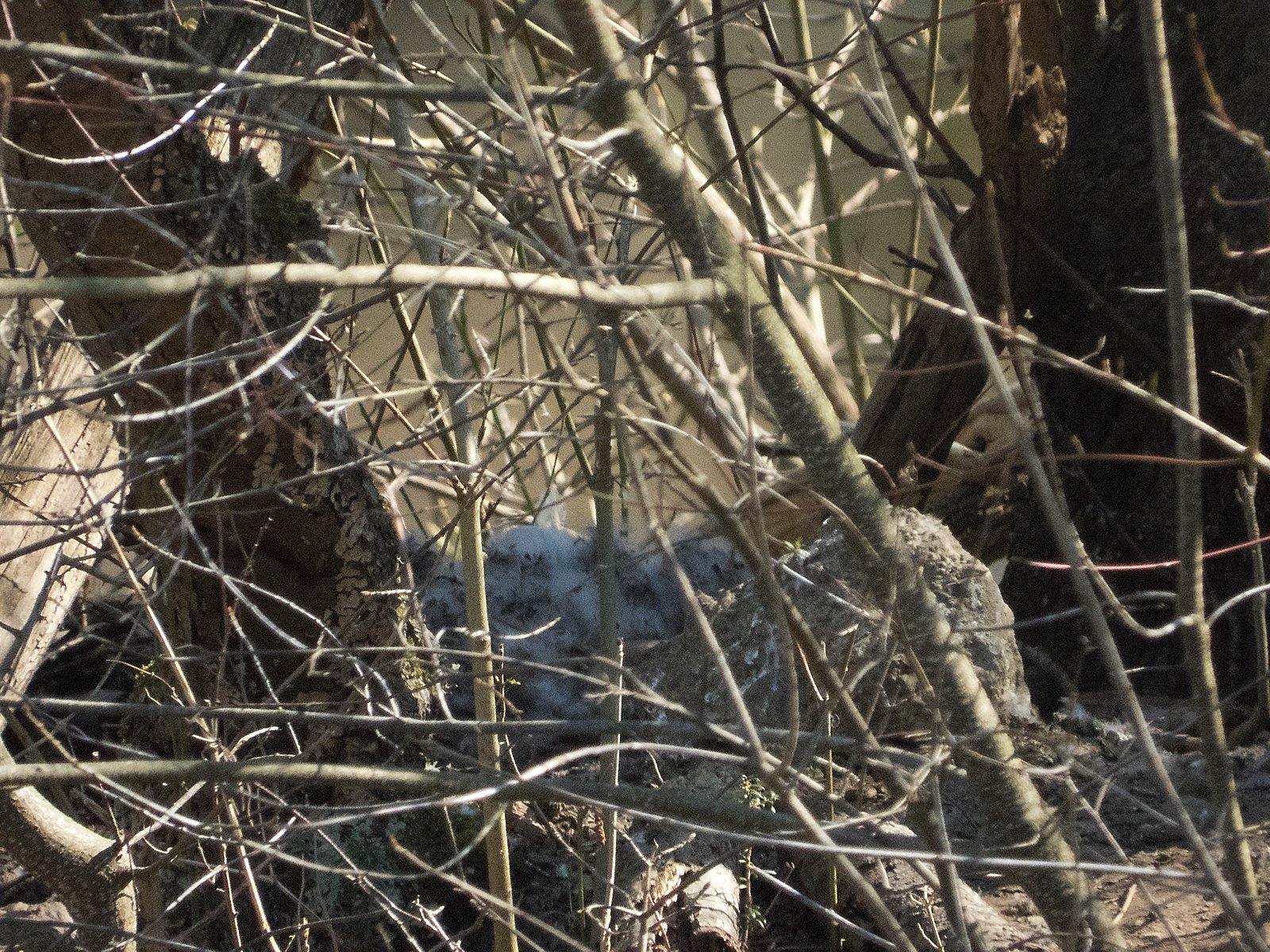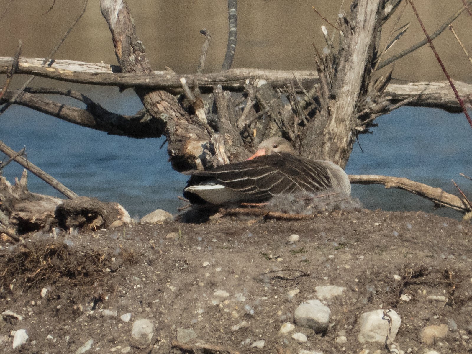 Bislang schlüpften, wie berichtet, zumindest bei drei Graugansfamilien Gössel. Derzeit sind acht Graugansnester besetzt. Die Feststellungen können sich natürlich immer nur auf die entdeckten Nester und Familien beziehen. Neben dem Schwanenpaar brüten noch zwei Kanadagänse, das dritte Kanadaganspaar lässt sich noch Zeit. Das Graugans-Gössel-Nest von gestern, 4. April, wurde heute von einer Graugans aufgesucht, geprüft und offenbar für gut befunden als neuer Nistplatz. Zeitweise wurde die Gans allerdings von anderen Graugänsen in der Nähe verjagt: