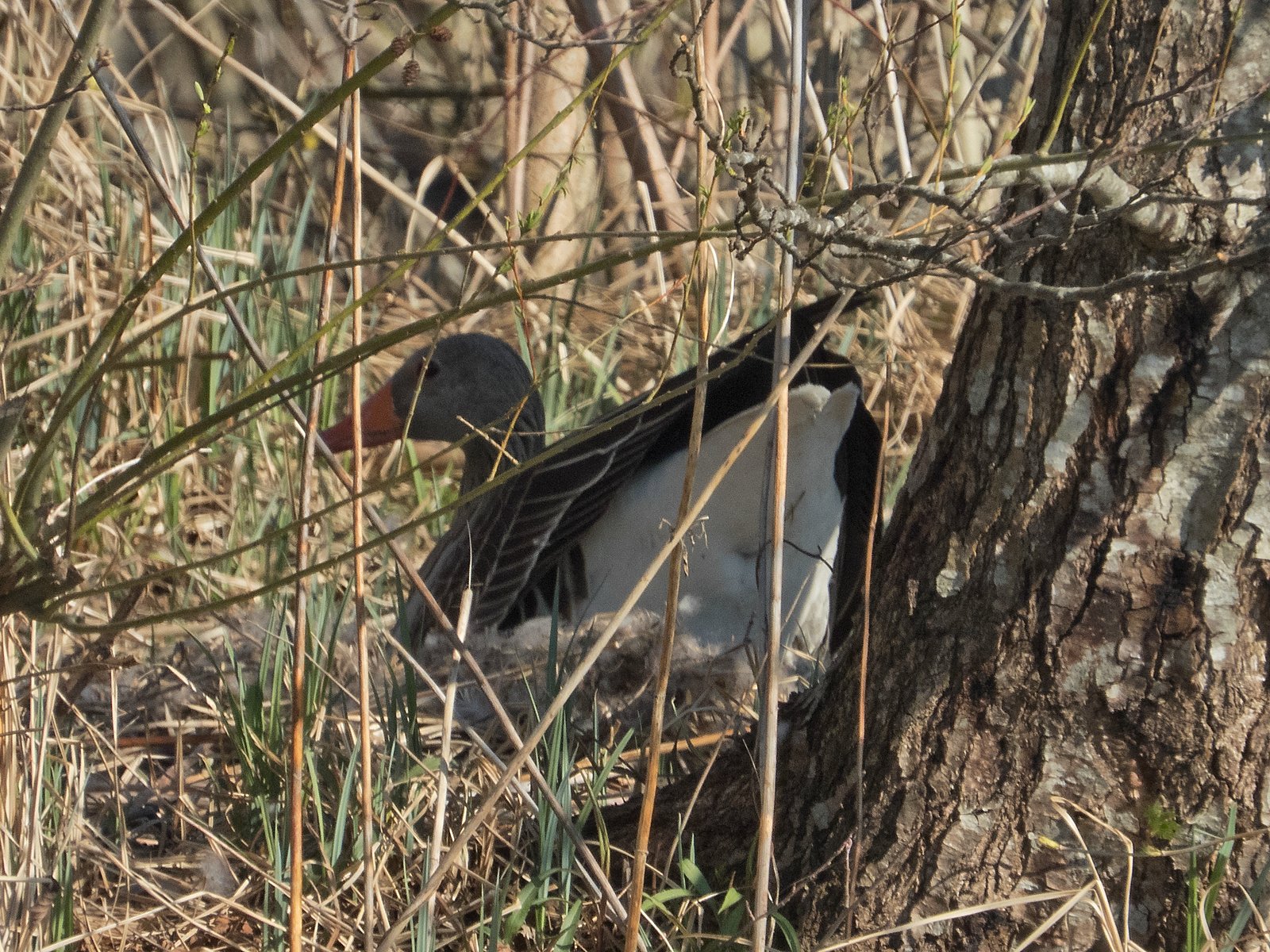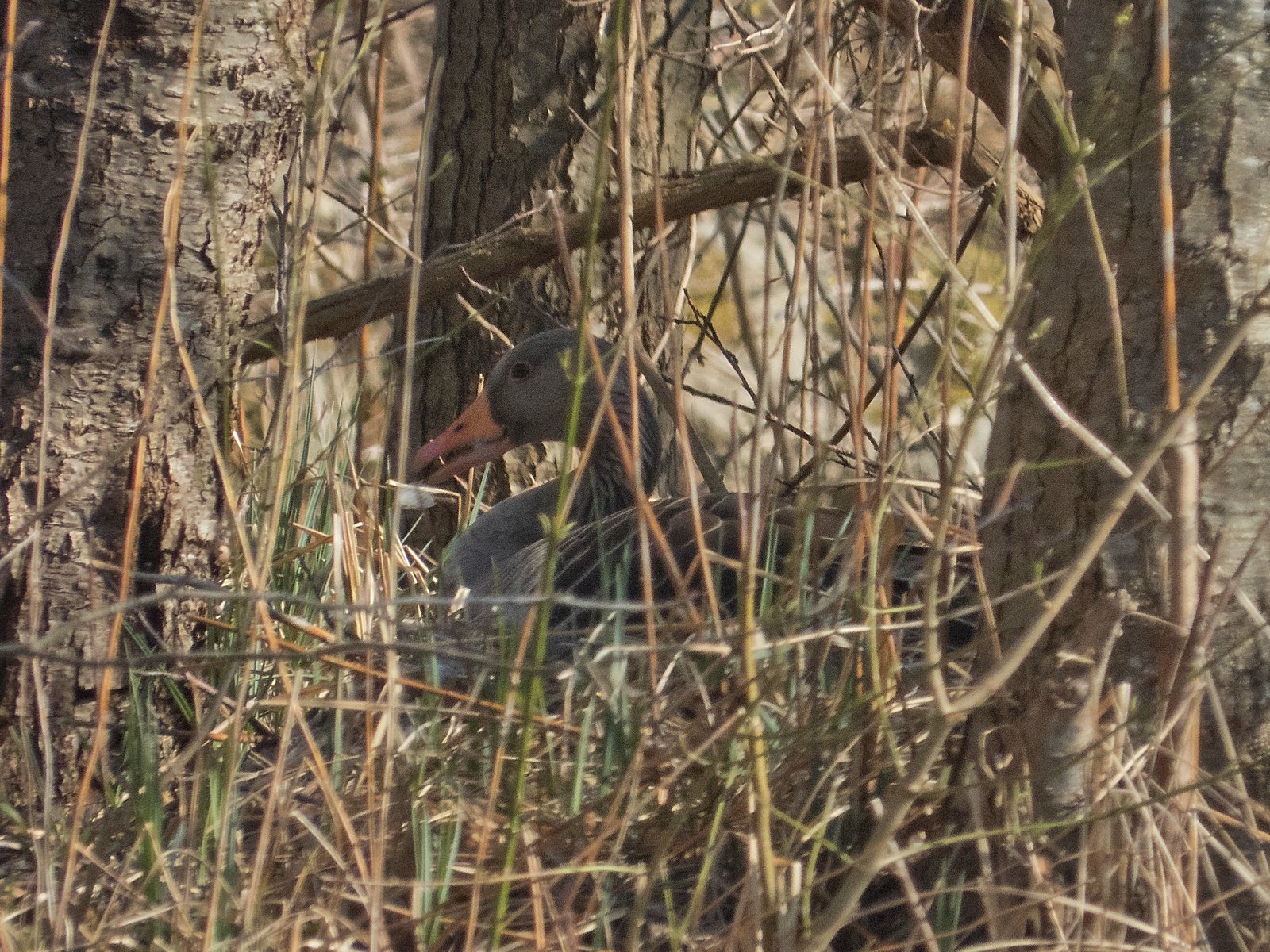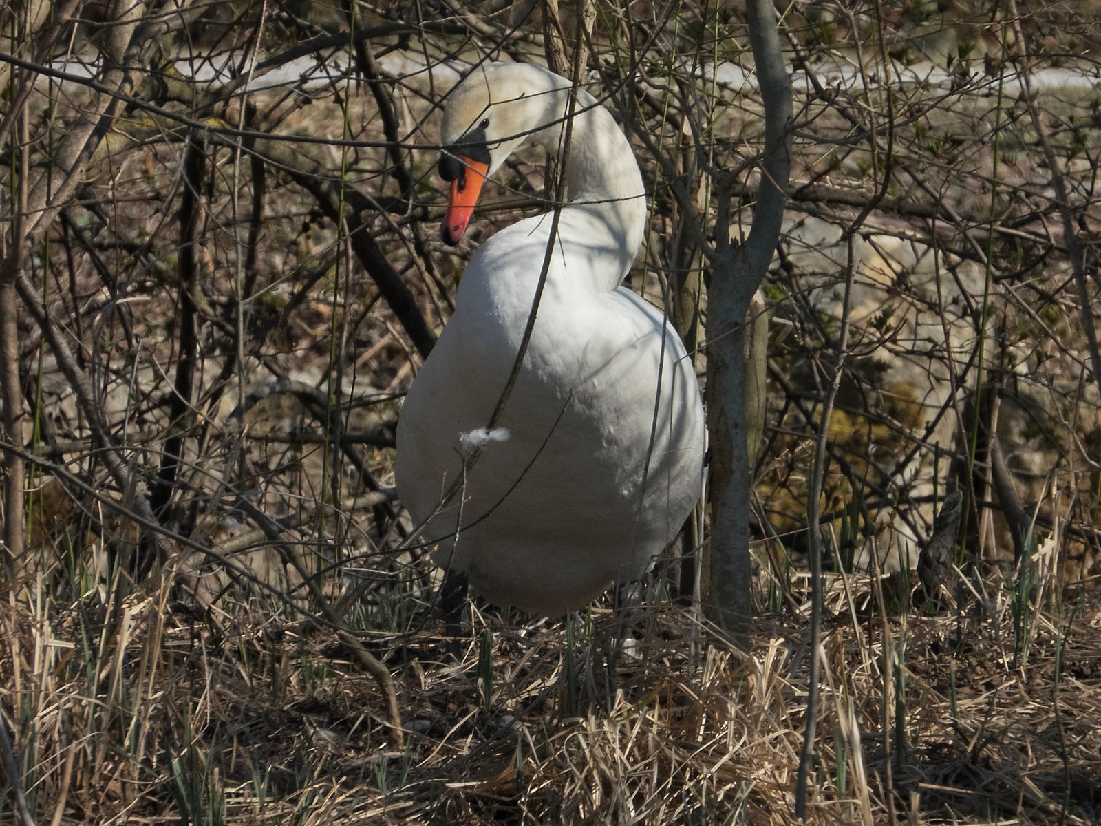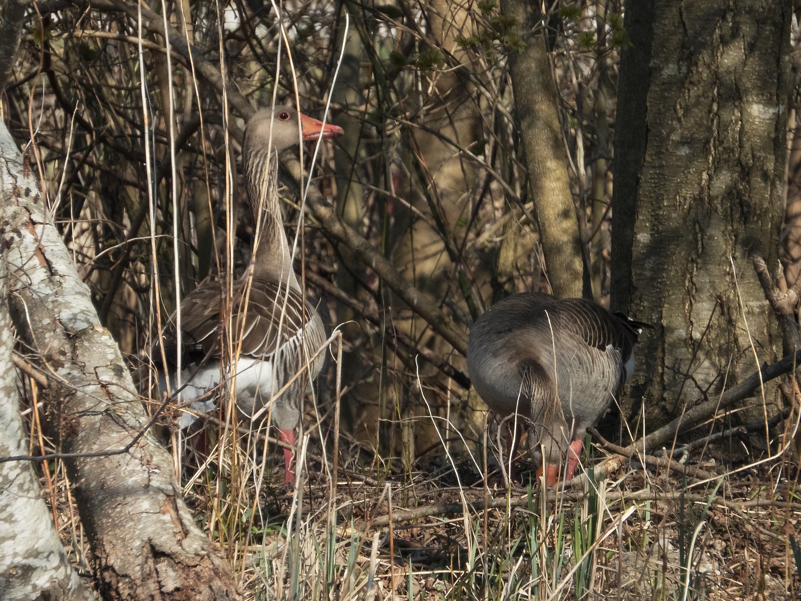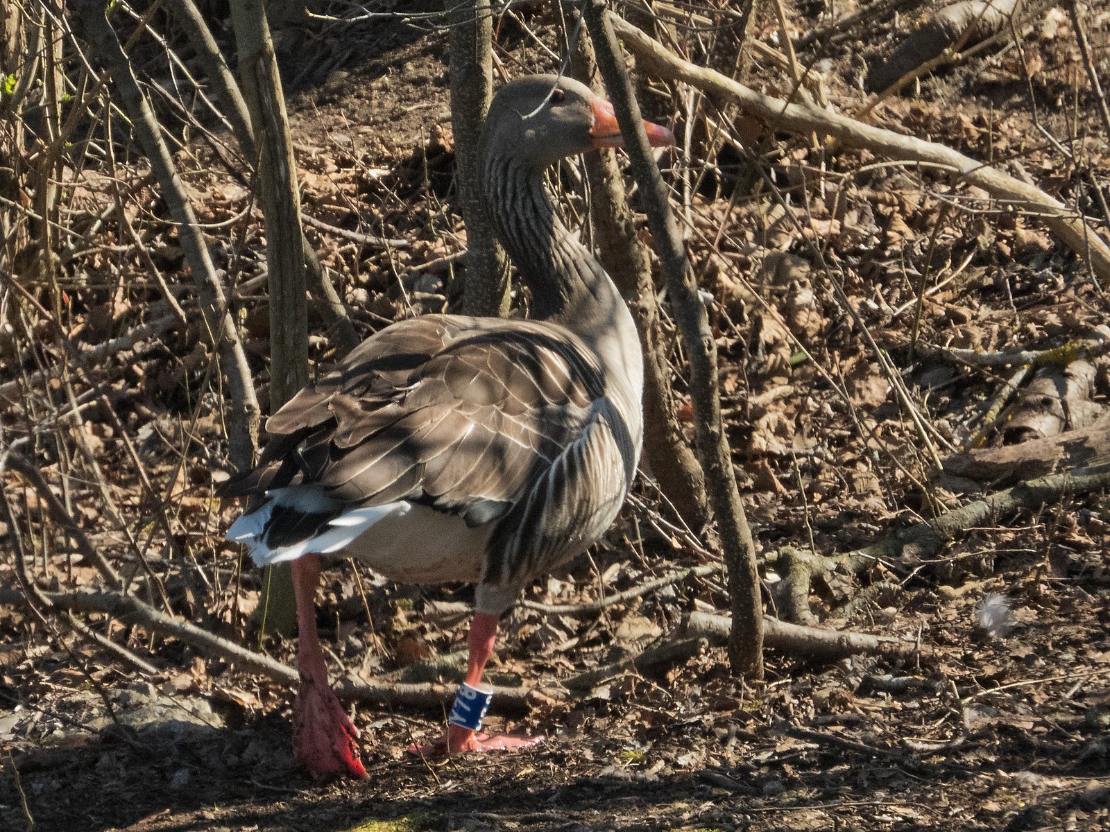 Bislang schlüpften, wie berichtet, zumindest bei drei Graugansfamilien Gössel. Derzeit sind acht Graugansnester besetzt. Die Feststellungen können sich natürlich immer nur auf die entdeckten Nester und Familien beziehen. Neben dem Schwanenpaar brüten noch zwei Kanadagänse, das dritte Kanadaganspaar lässt sich noch Zeit. Das Graugans-Gössel-Nest von gestern, 4. April, wurde heute von einer Graugans aufgesucht, geprüft und offenbar für gut befunden als neuer Nistplatz. Zeitweise wurde die Gans allerdings von anderen Graugänsen in der Nähe verjagt: