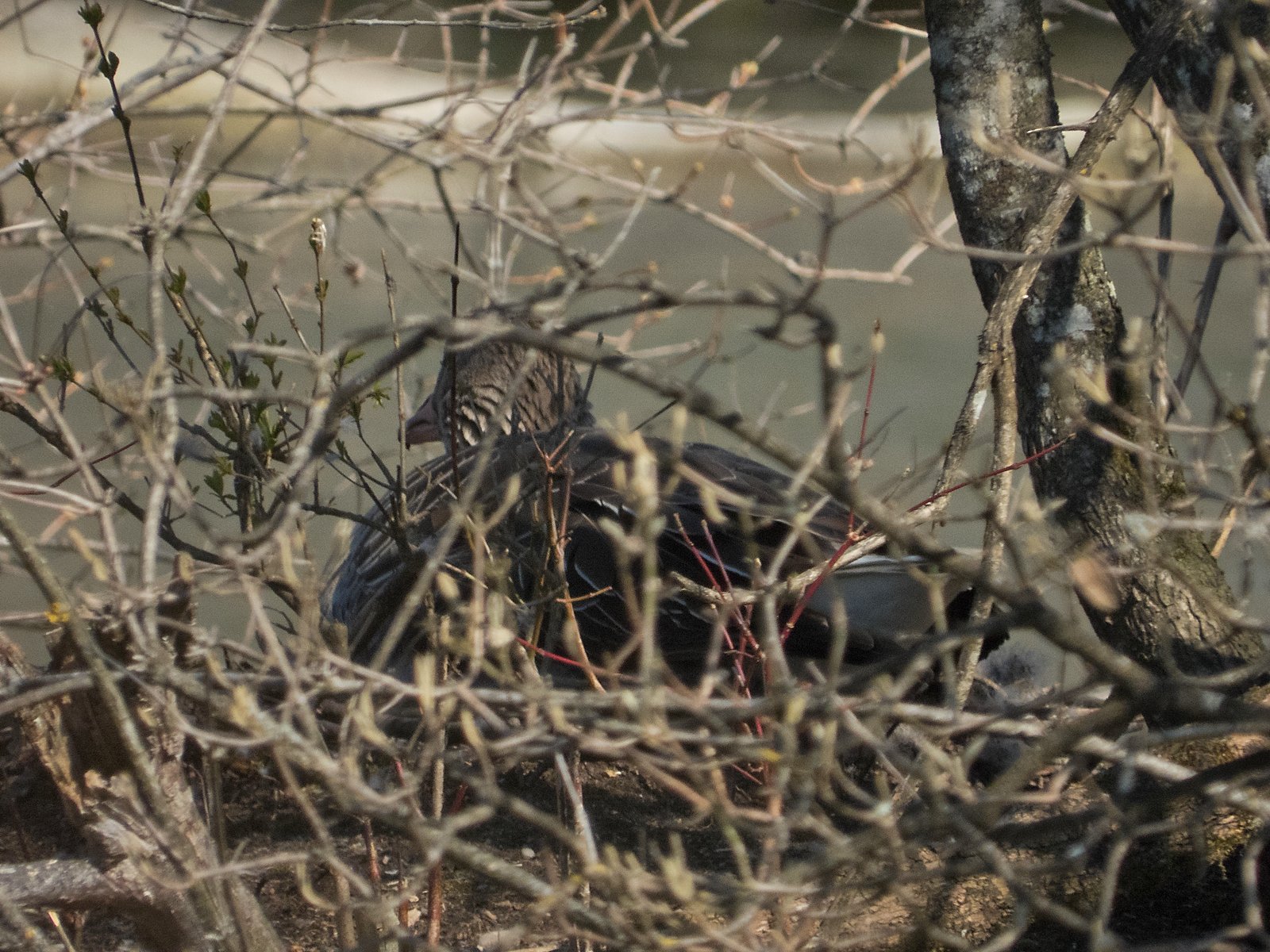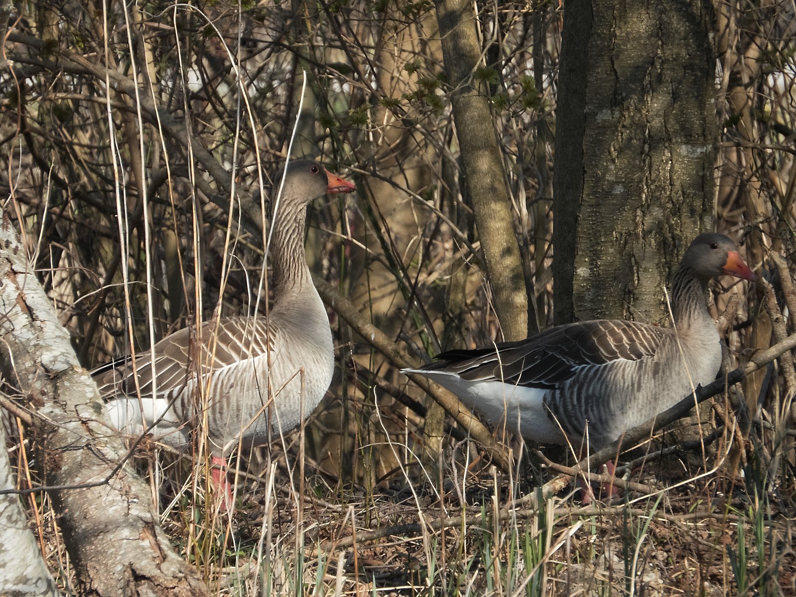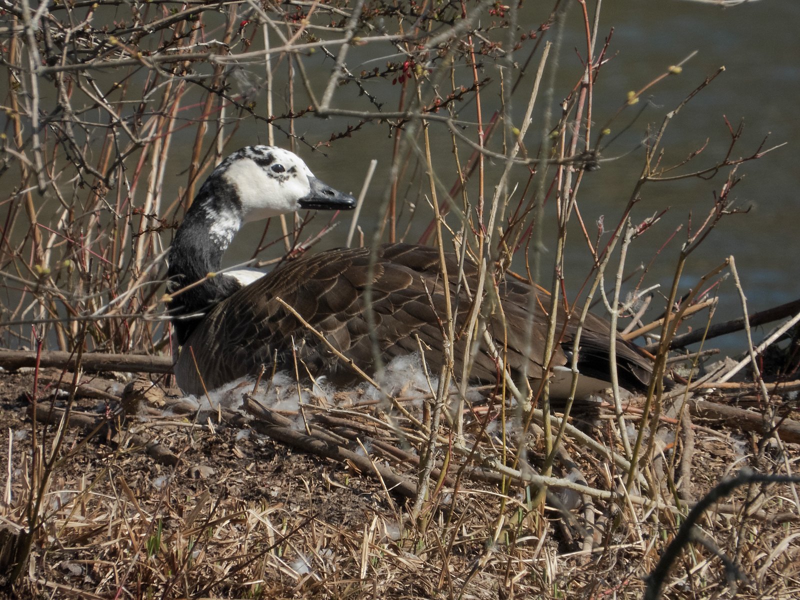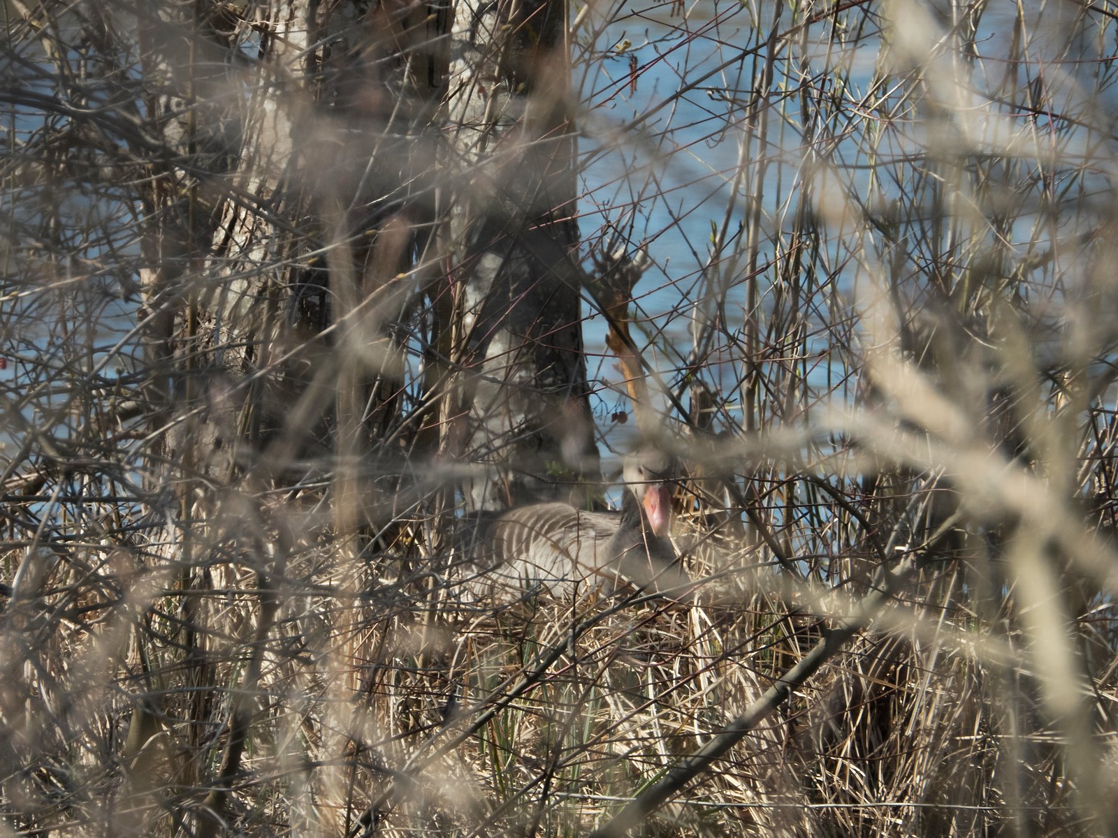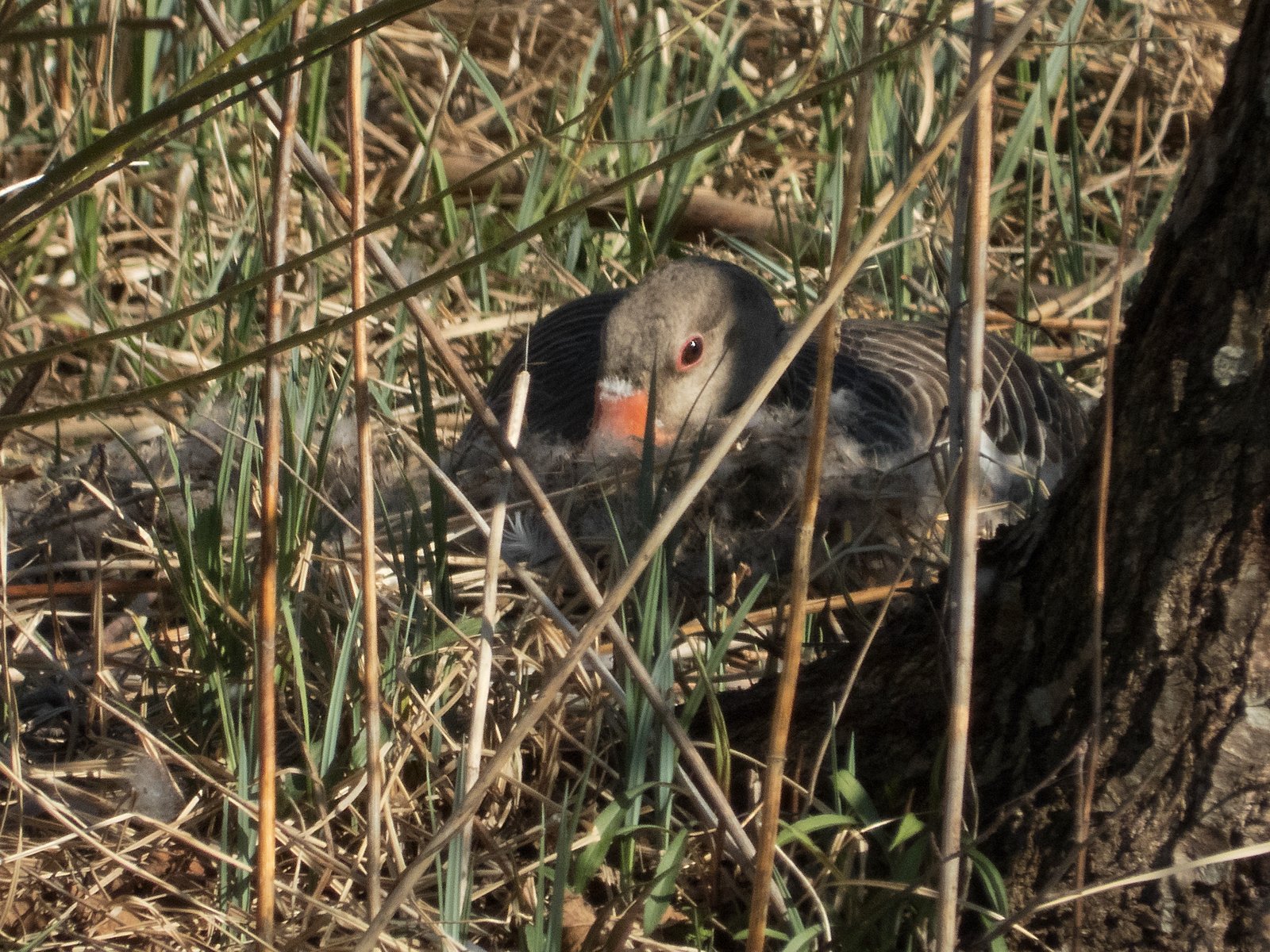Bislang schlüpften, wie berichtet, zumindest bei drei Graugansfamilien Gössel. Derzeit sind acht Graugansnester besetzt. Die Feststellungen können sich natürlich immer nur auf die entdeckten Nester und Familien beziehen. Neben dem Schwanenpaar brüten noch zwei Kanadagänse, das dritte Kanadaganspaar lässt sich noch Zeit. Das Graugans-Gössel-Nest von gestern, 4. April, wurde heute von einer Graugans aufgesucht, geprüft und offenbar für gut befunden als neuer Nistplatz. Zeitweise wurde die Gans allerdings von anderen Graugänsen in der Nähe verjagt: