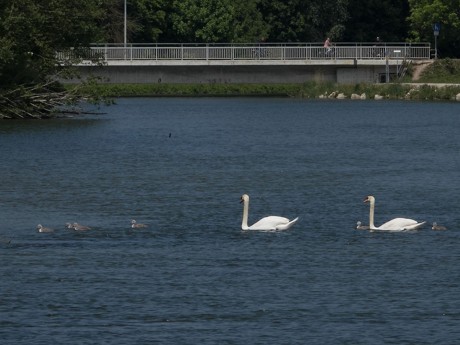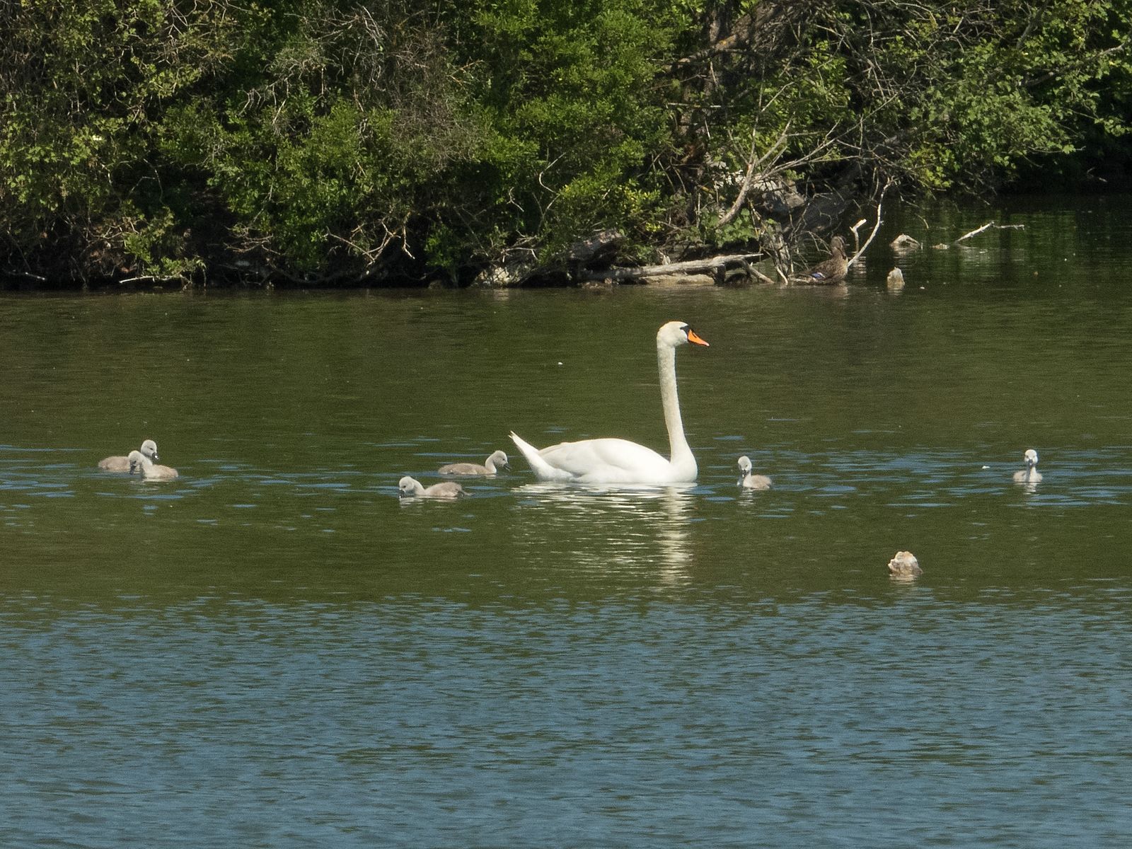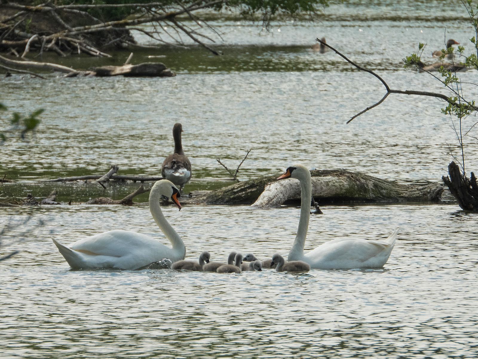 Rechts die ehemalige Brutinsel des Kanadagans-Paares. Nach dem Einflug der beiden Gänse wird gleich der Höckerschwan aufmerksam