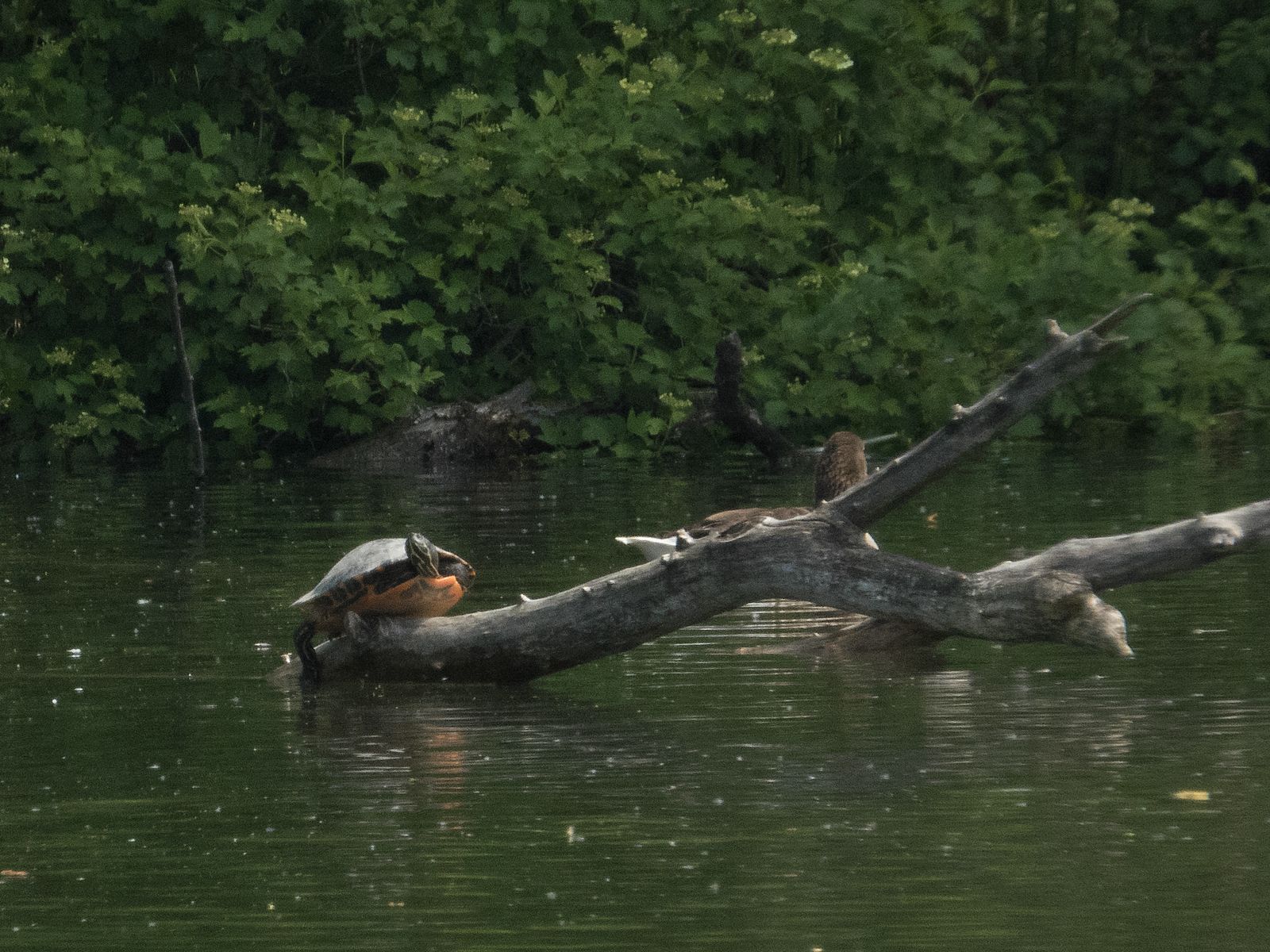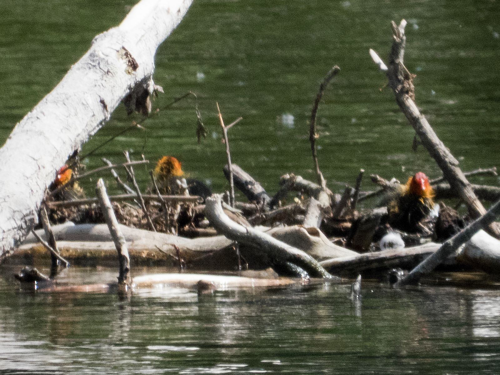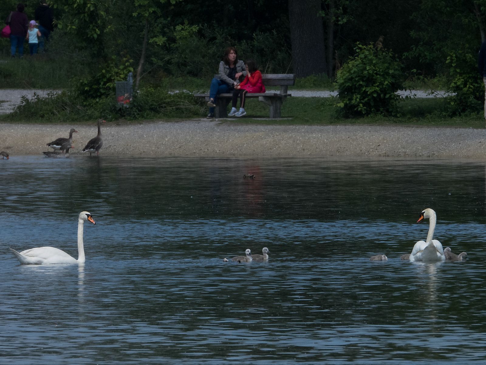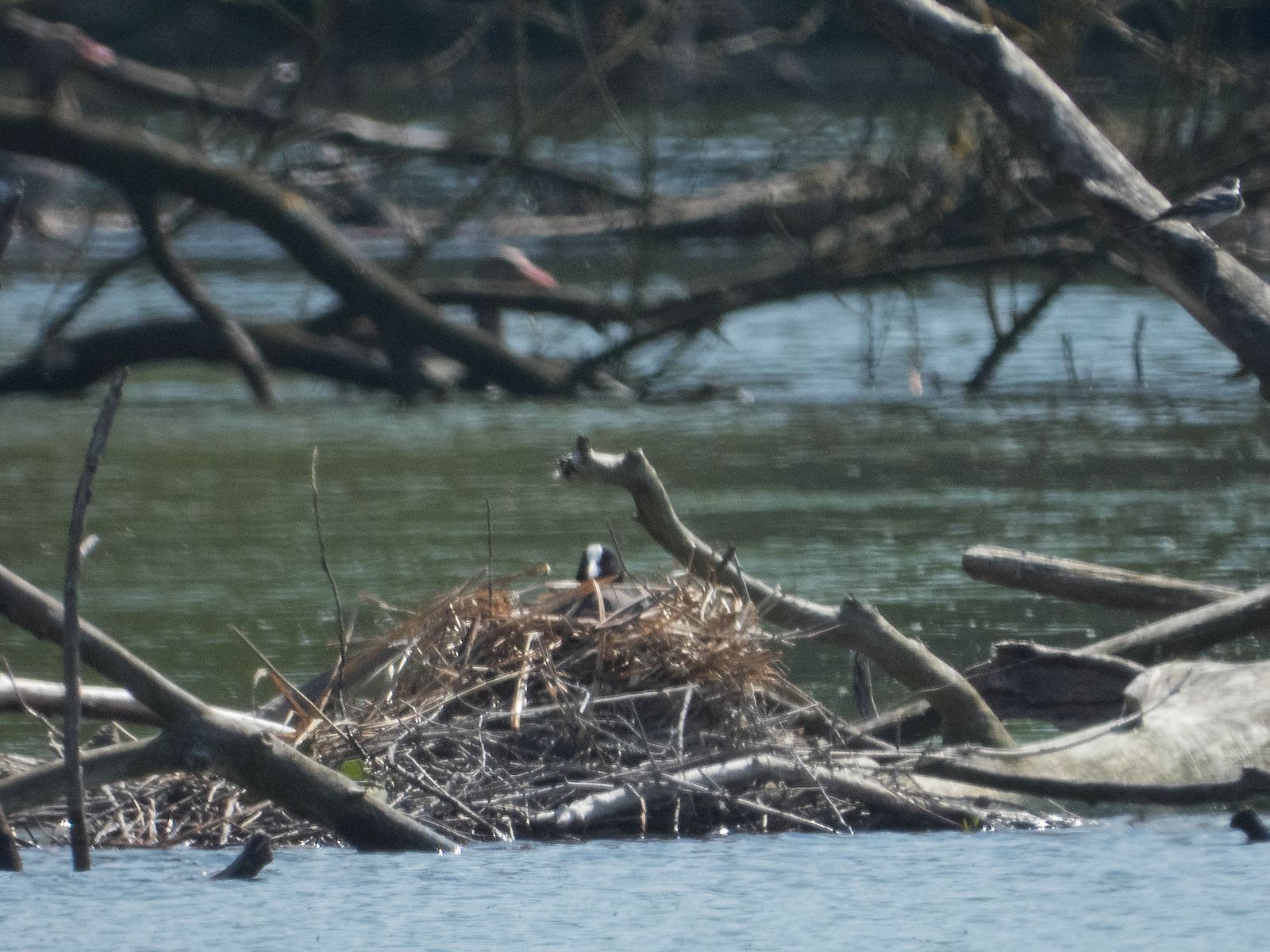 Rechts die ehemalige Brutinsel des Kanadagans-Paares. Nach dem Einflug der beiden Gänse wird gleich der Höckerschwan aufmerksam