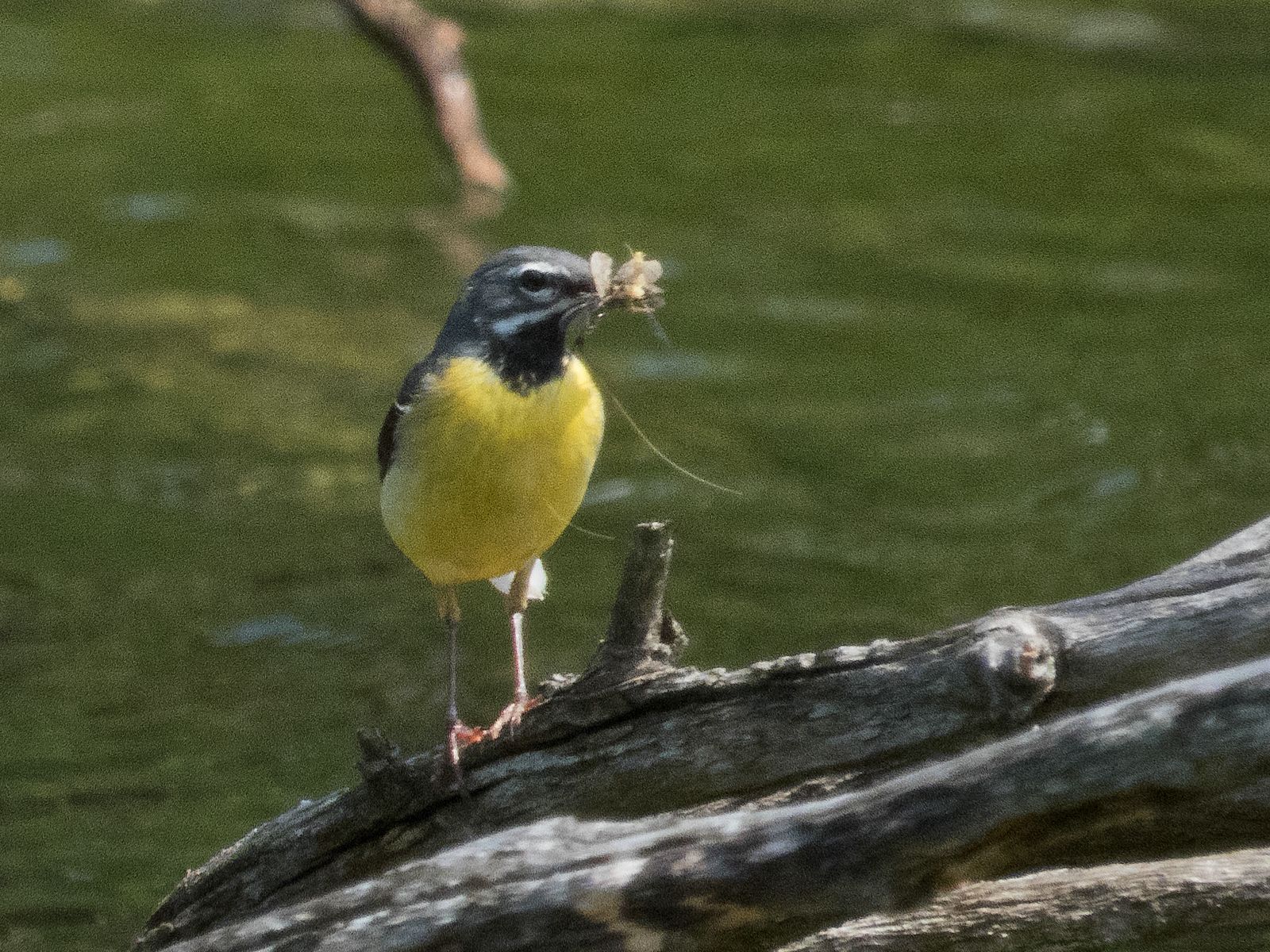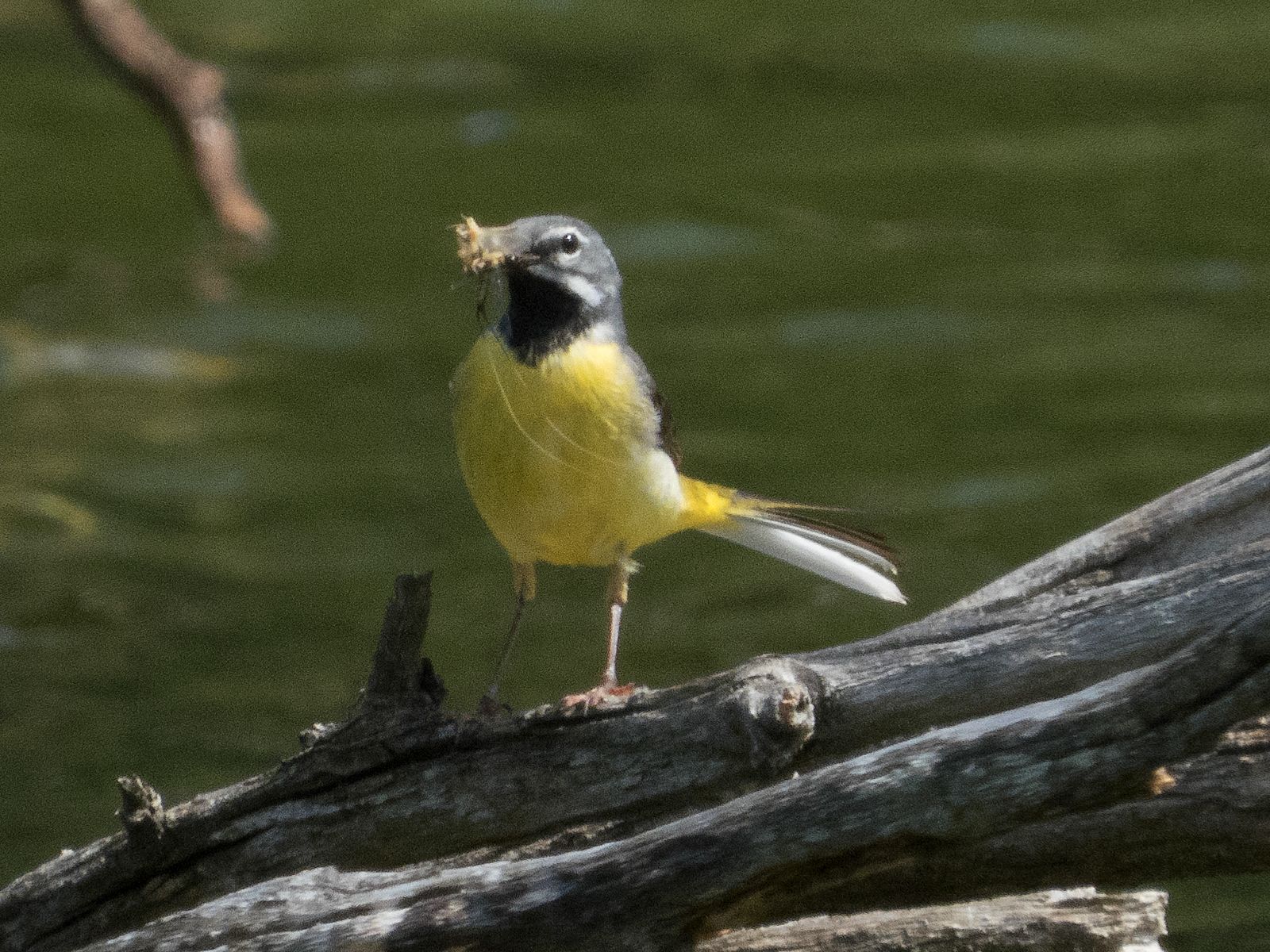 Gebirgsstelze stolziert auf Ast mit erbeutetem Insekt