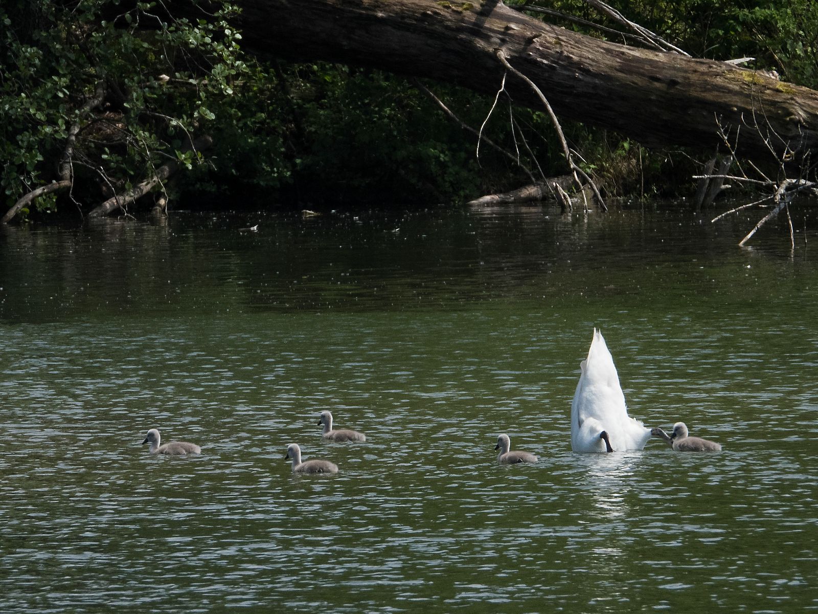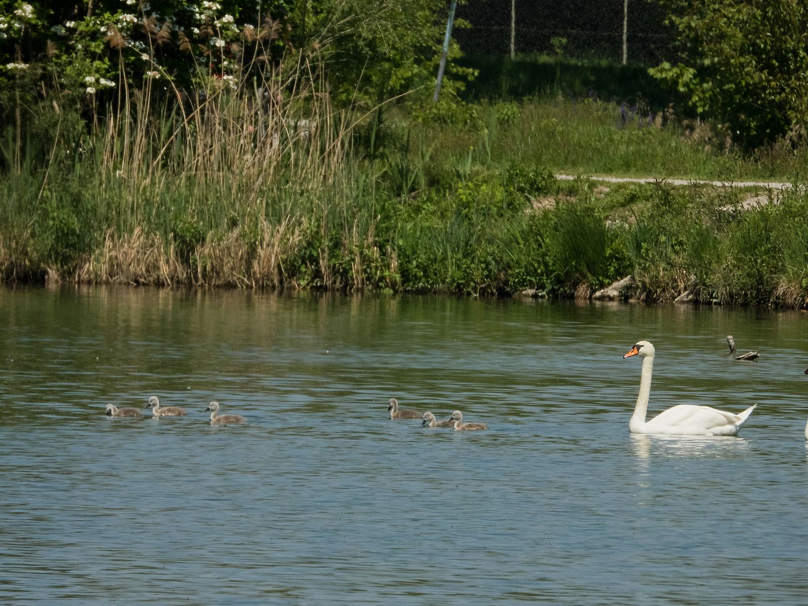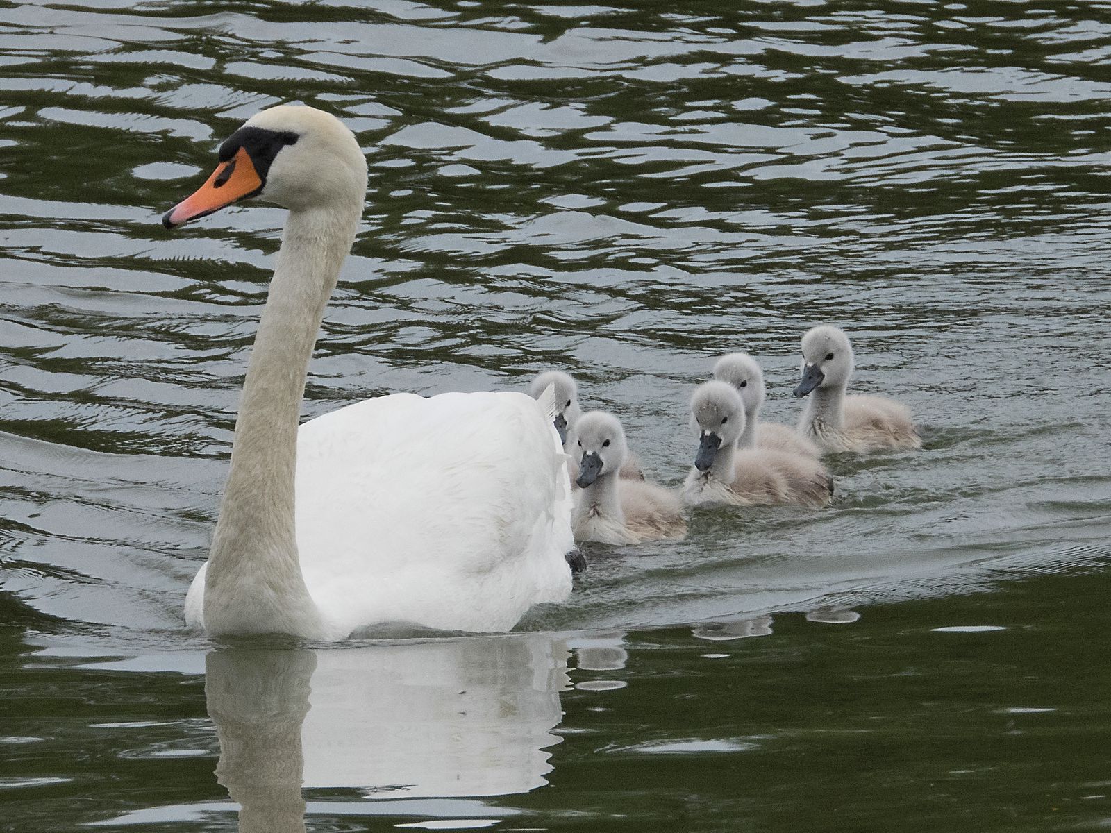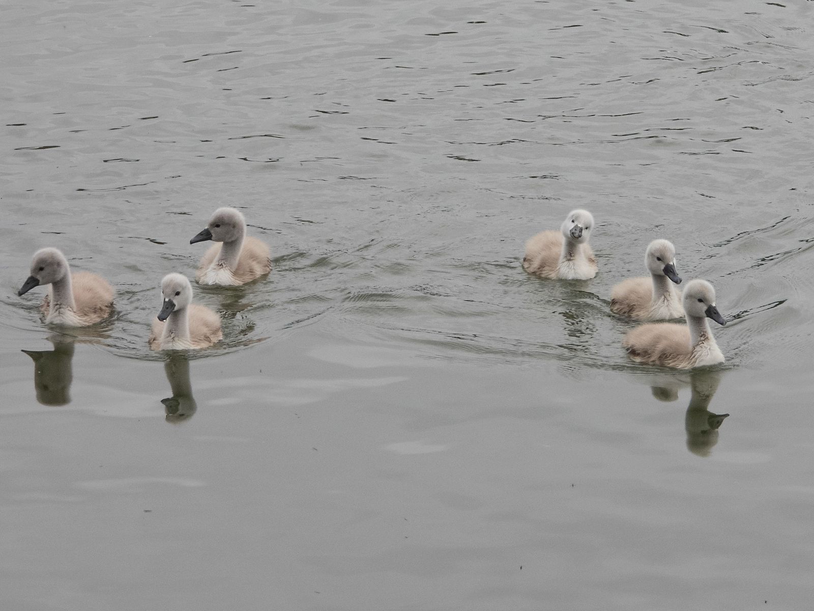 Ganz nah bei der Schwanenmutter: Sechs junge Schwäne