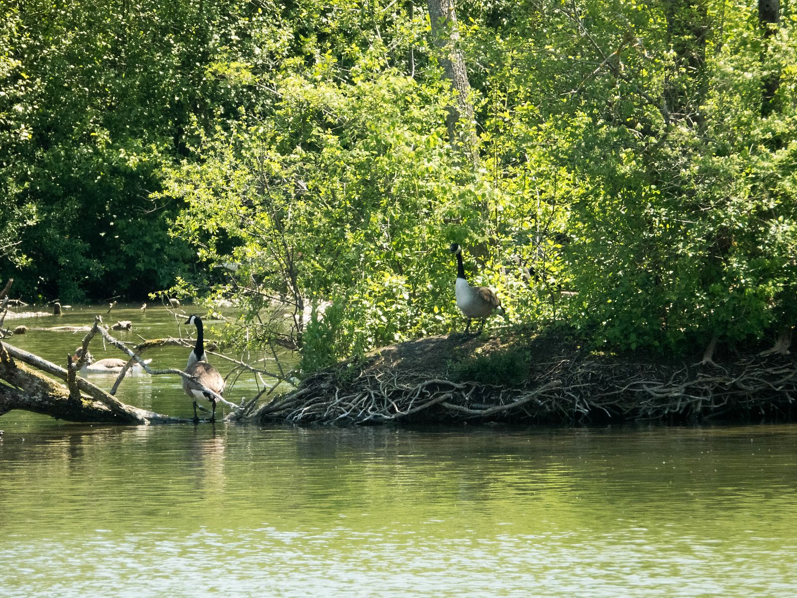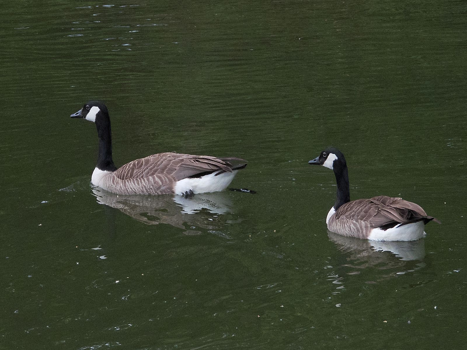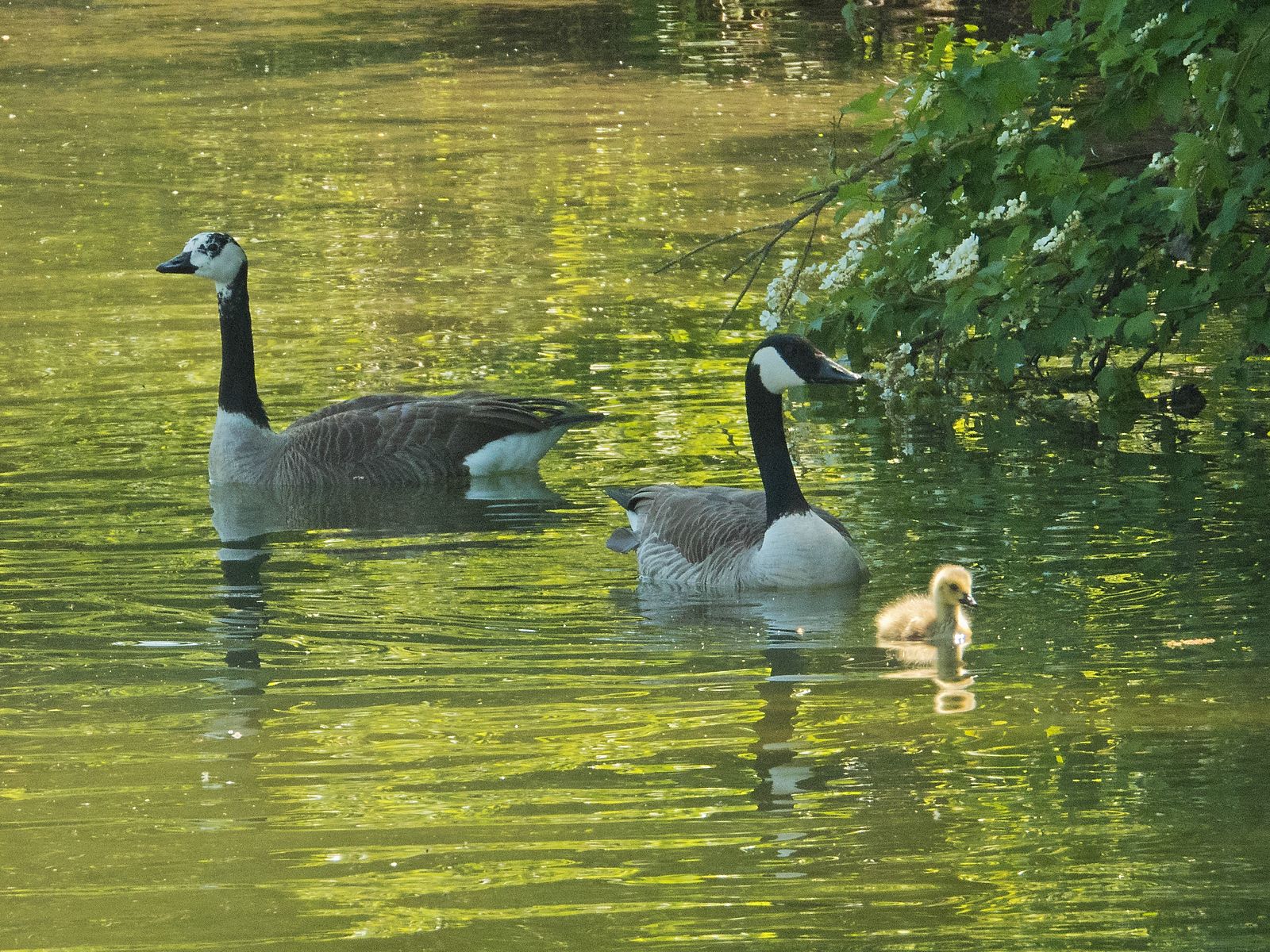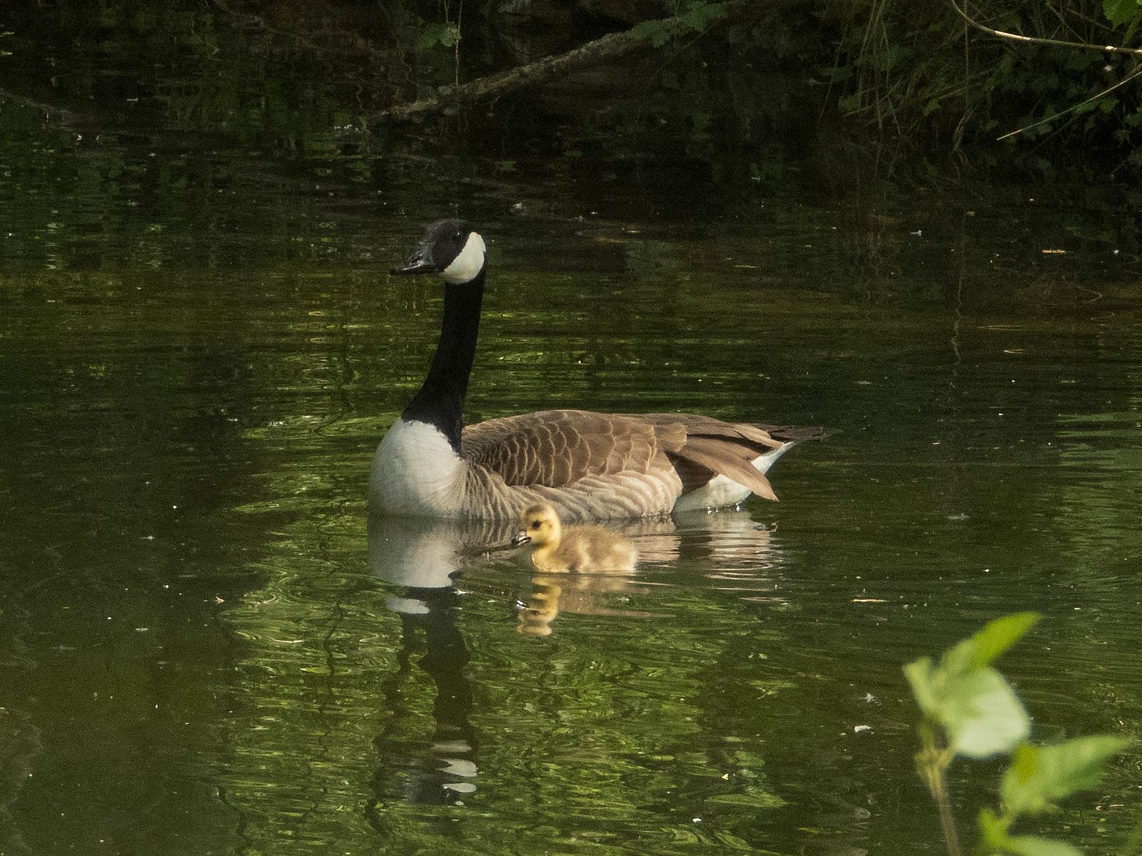 Zwei Kanadagänse. Das einzige Gössel haben sie längst verloren. Oft sind sie in der Nähe des ehemaligen Nestes