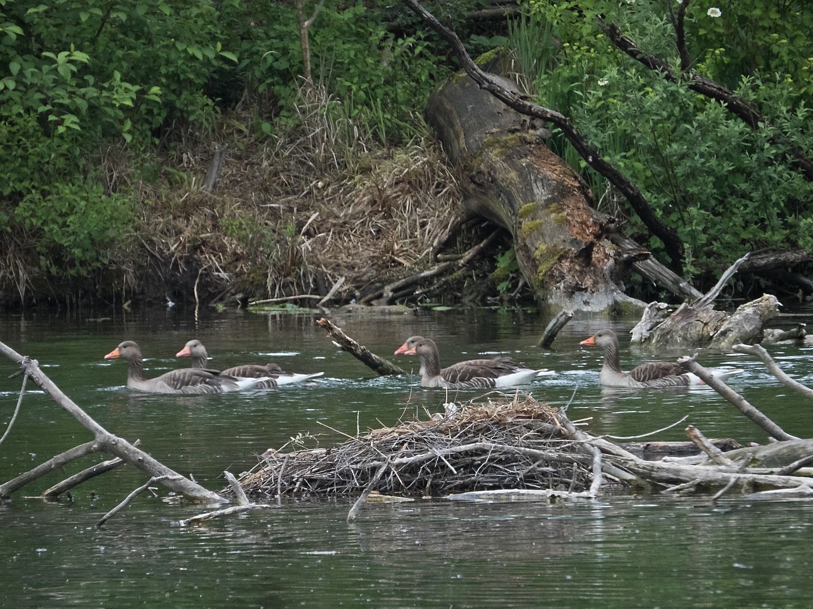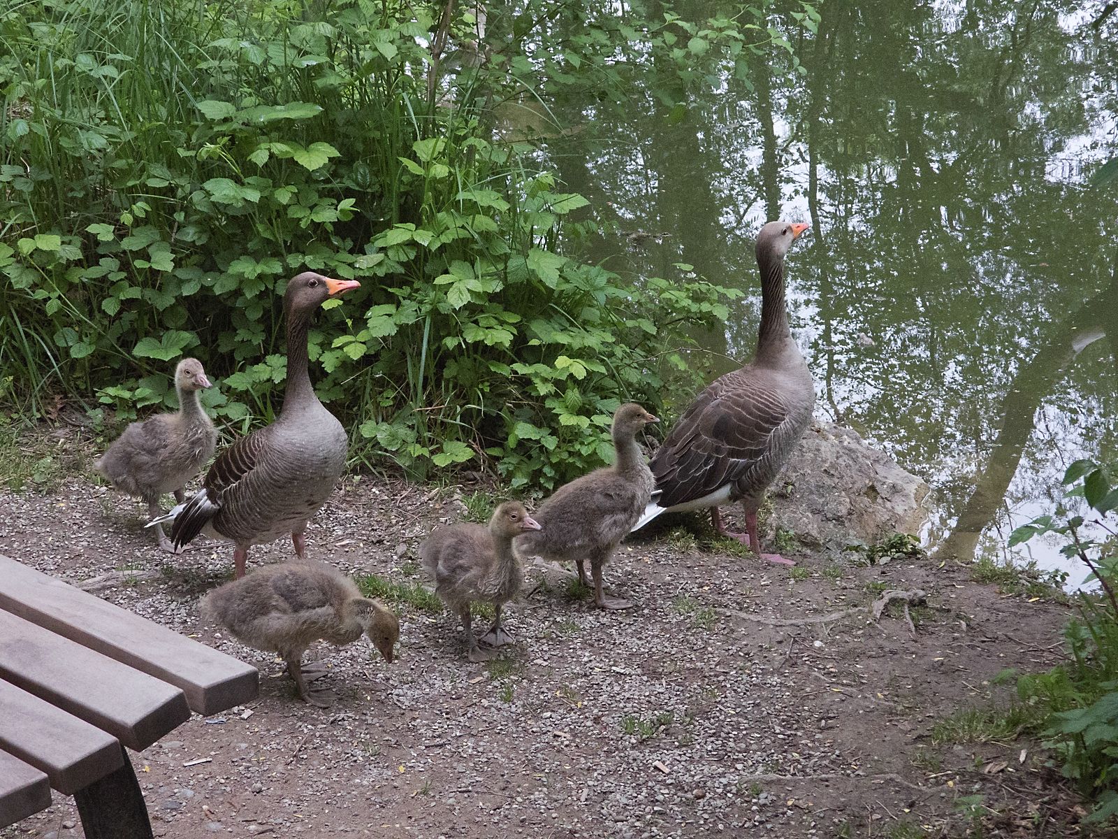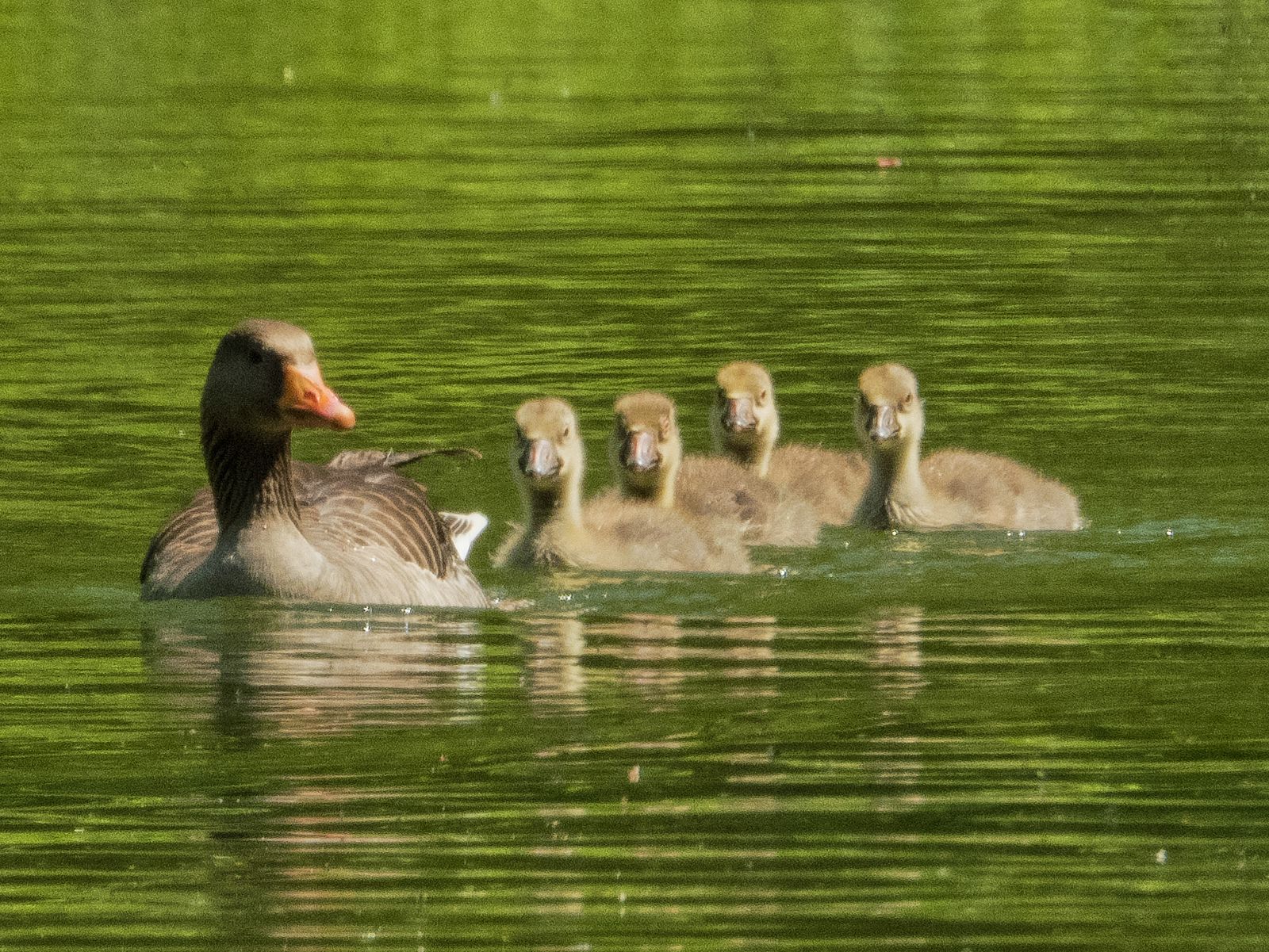 Im Fischteichgebiet auch Graugans-Familie mit vier Gänsekindern