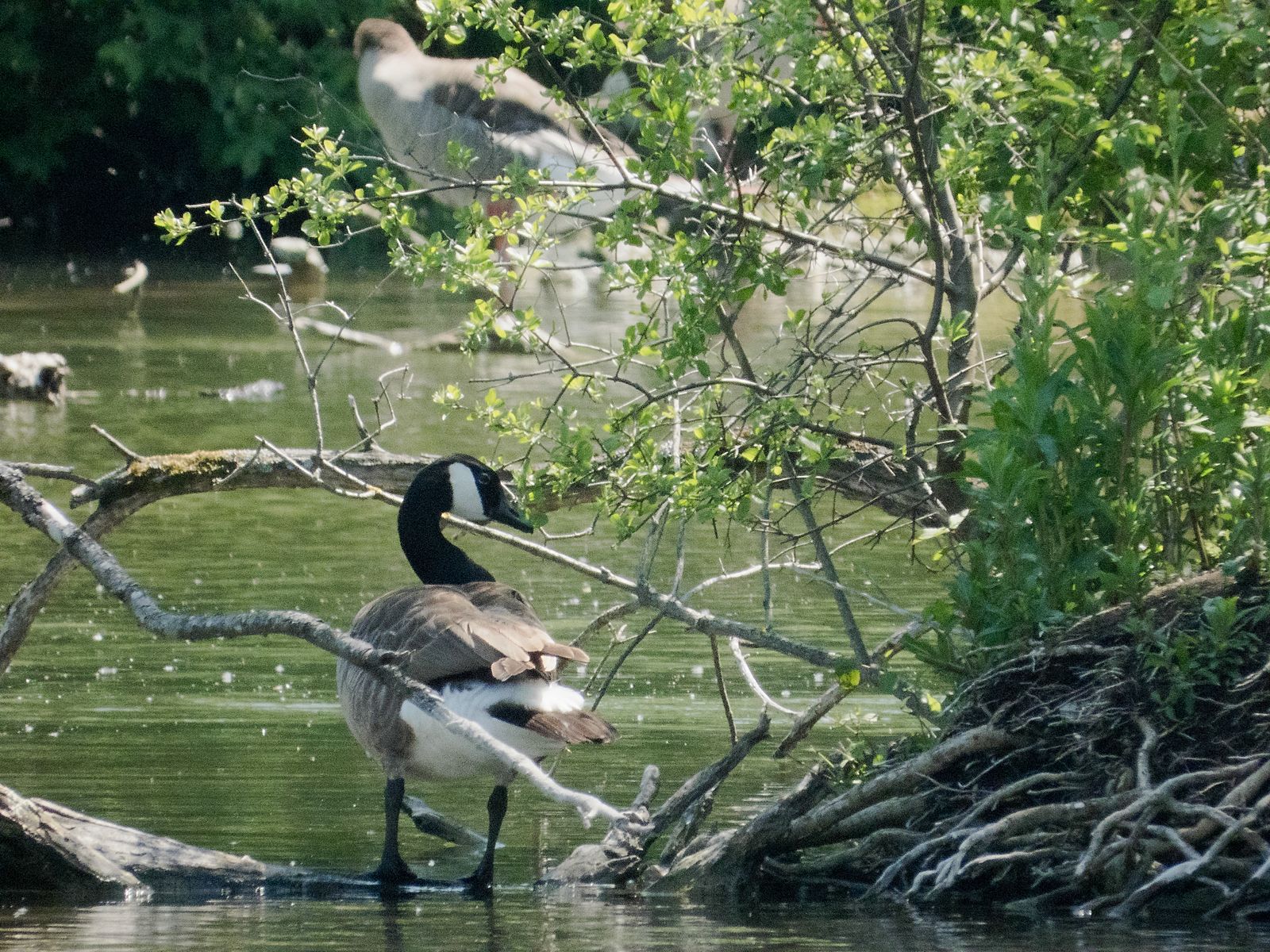 Eine von zwei Kanadagänsen bei ehemaligem Brutplatz