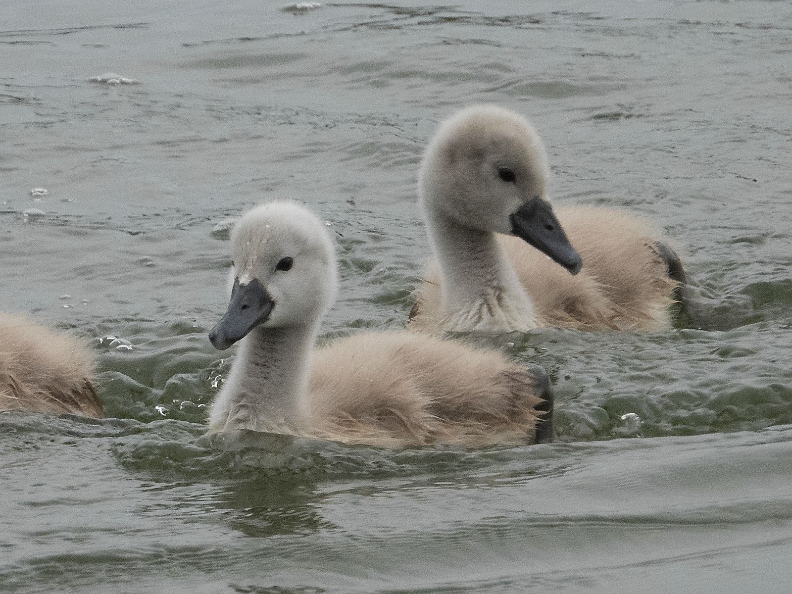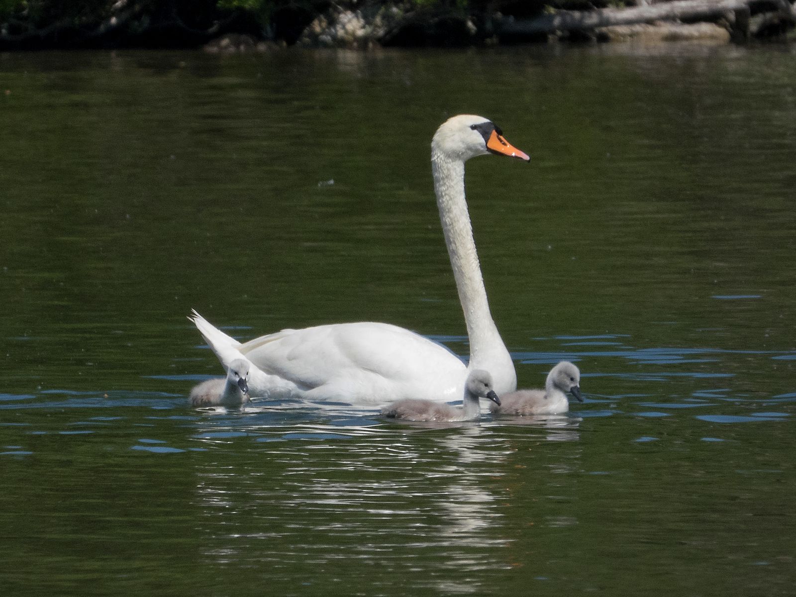 Drei von sechs Jungschwänen bei ihrer Mutter