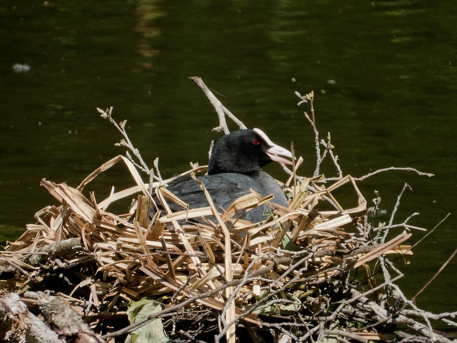 Selbstzufrieden dreinblickendes Blesshuhn auf dem schönen Nest