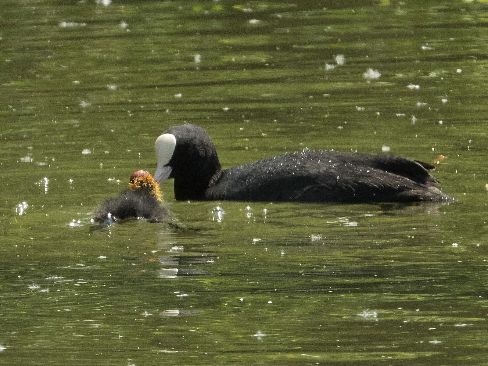 Blesshuhn füttert Nachwuchs. Gans oben links guckt zu