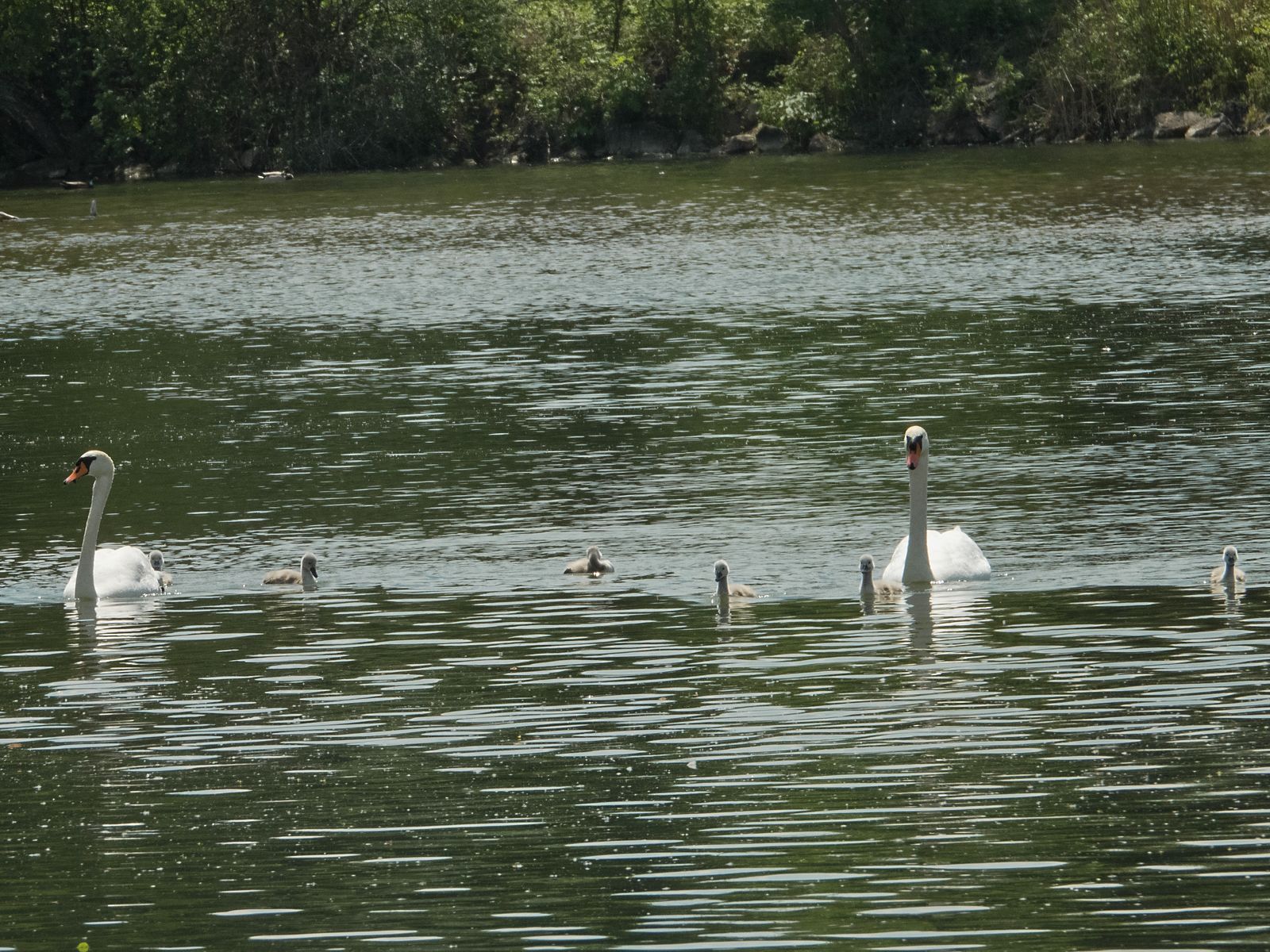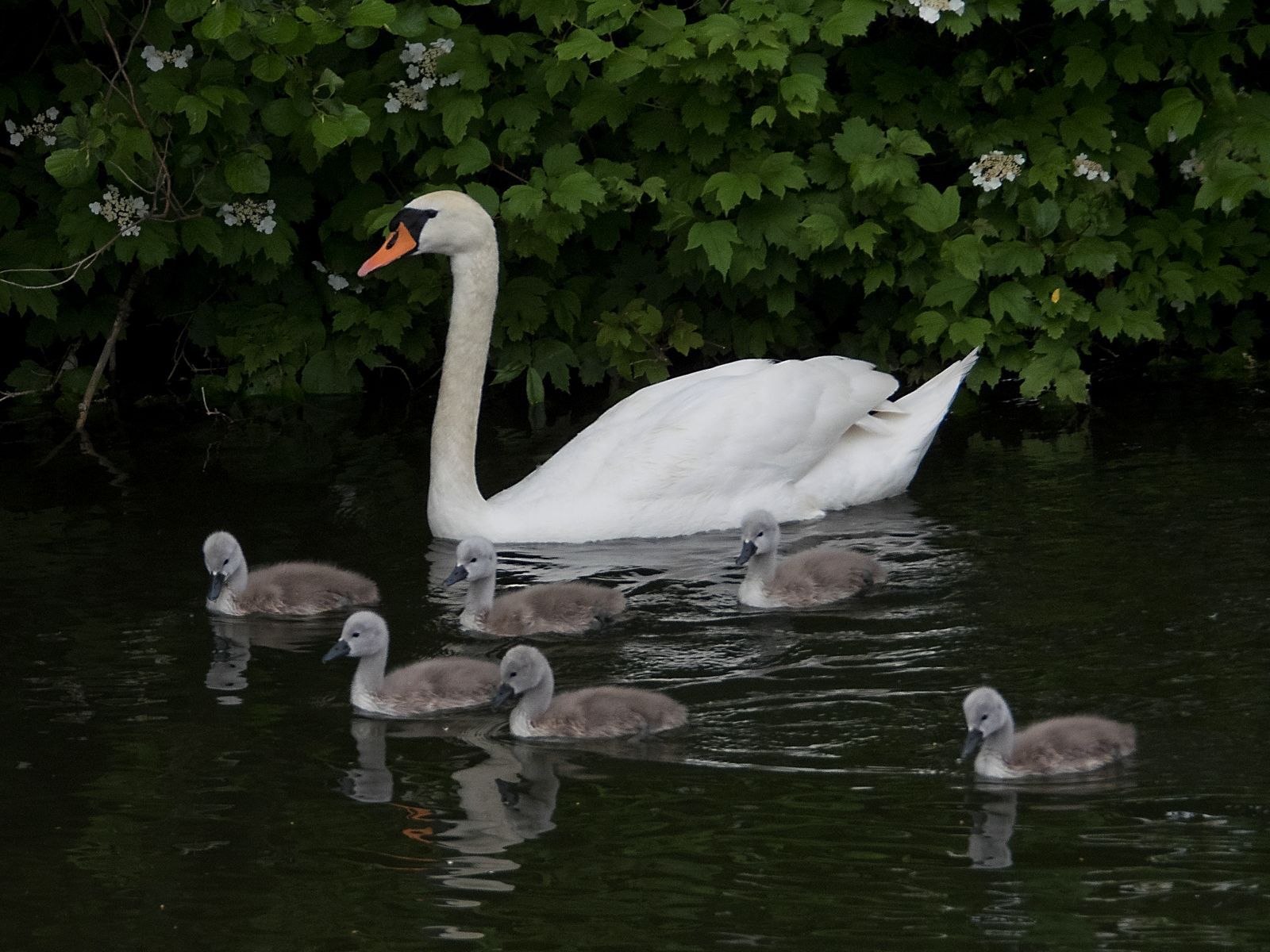 Sechs Schwanenküken, eingerahmt von den umsichtigen Eltern