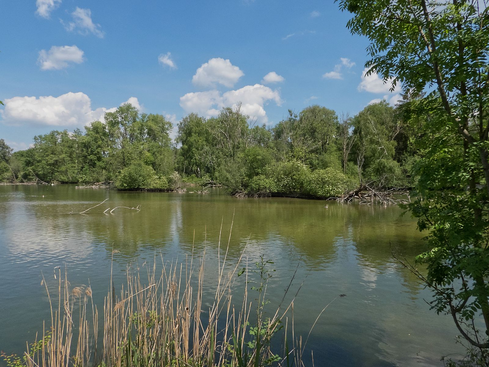 Blick auf den Amperstausee. In Bildmitte das letzte Graugansnest