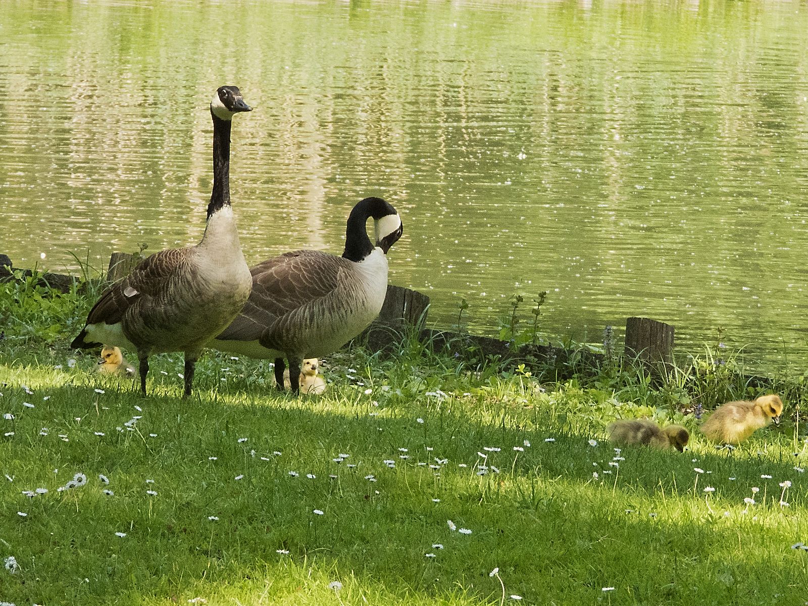 Kanadaganspaar führt vier Gössel. Es waren mal fünf Gössel, darunter ein Grauganskind