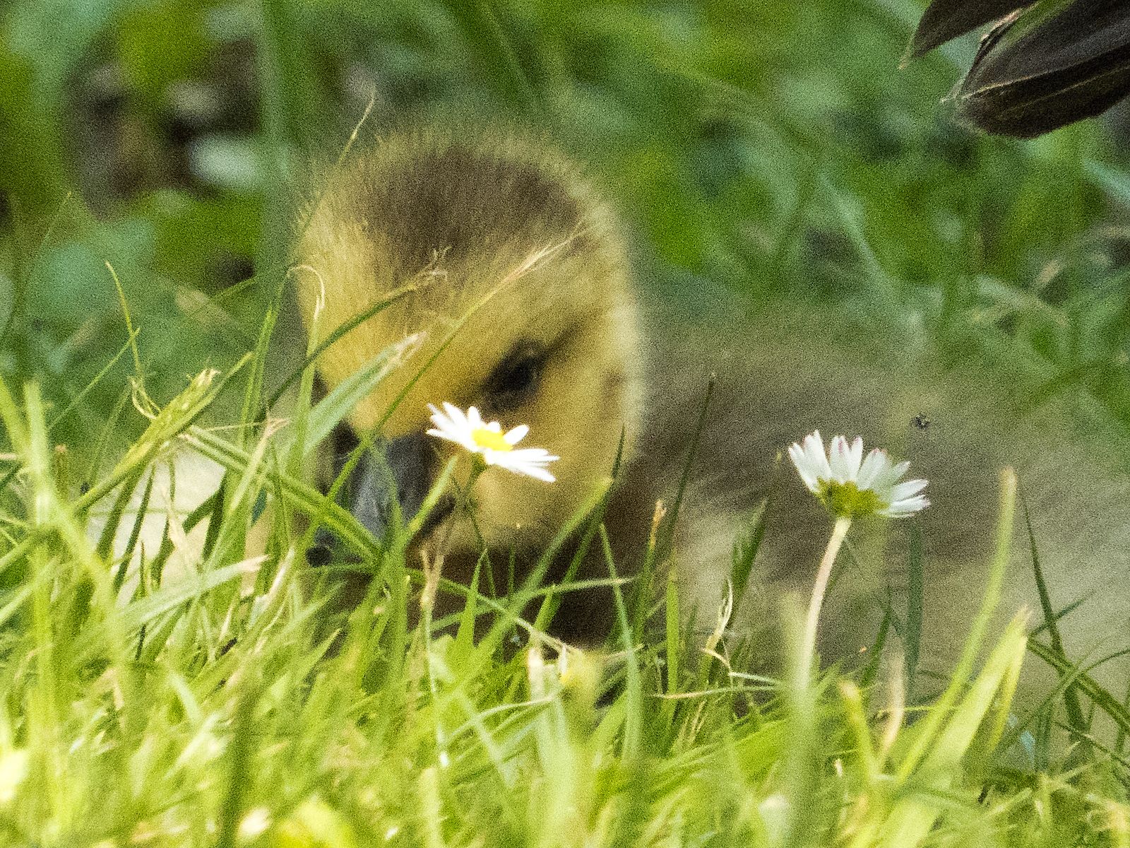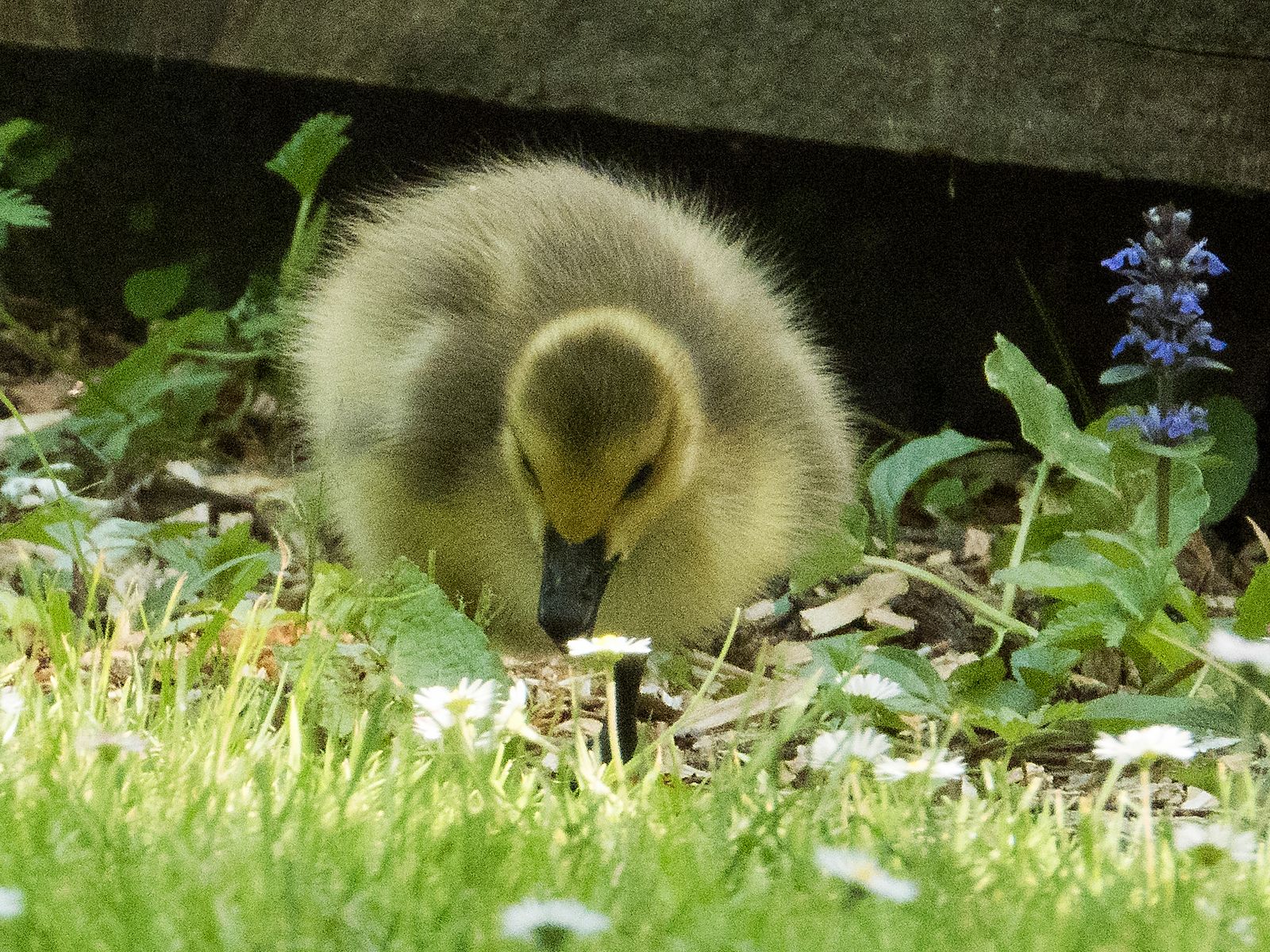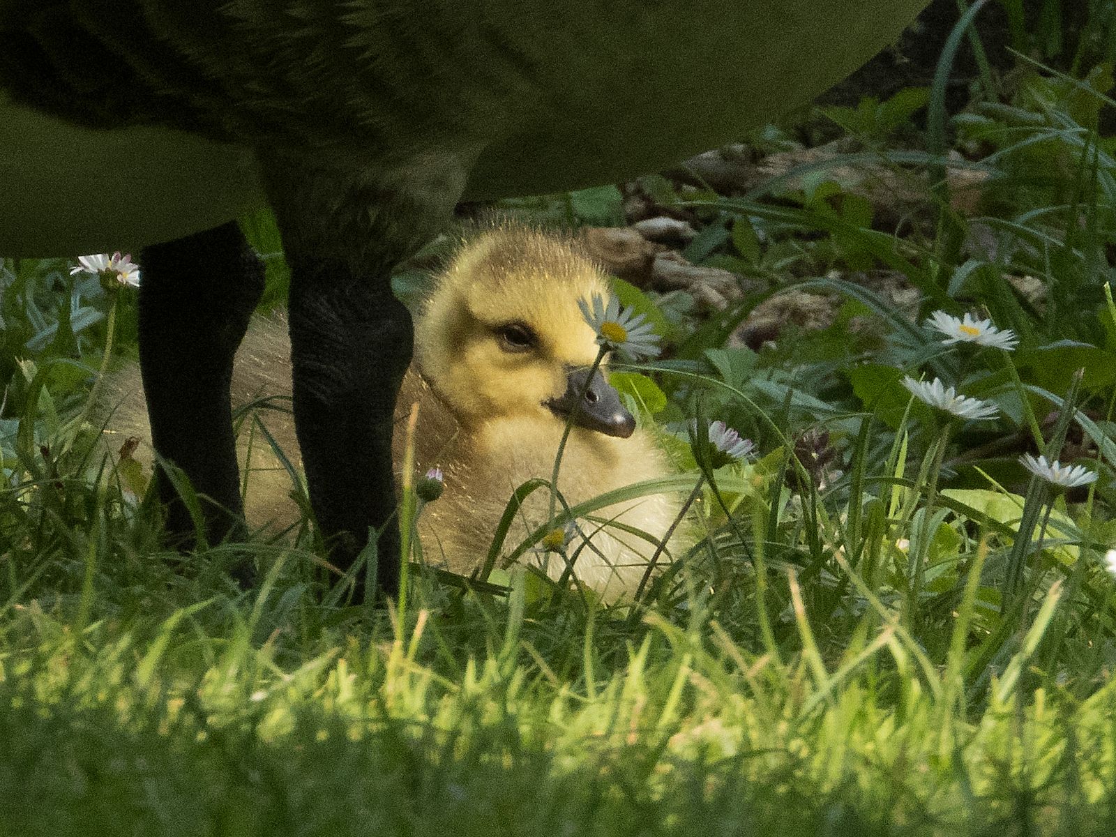 Das einzige noch verbliebene Gössel der am Kopf weißgefleckten Kanadagans