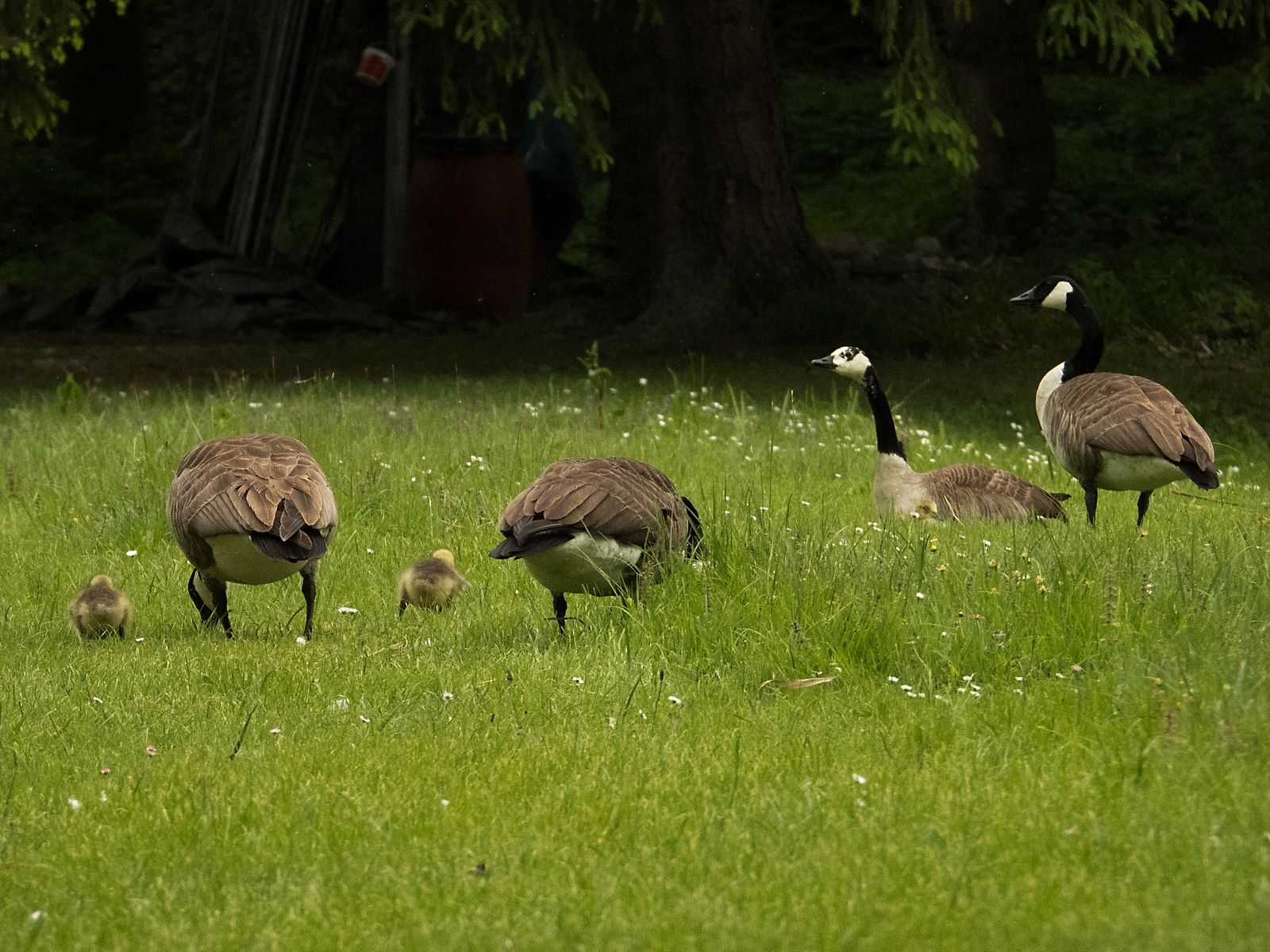 Vier Kanada-Gössel, ein Graugans-Kind. Gänschen rechts ist wohl das Graugans-Gössel