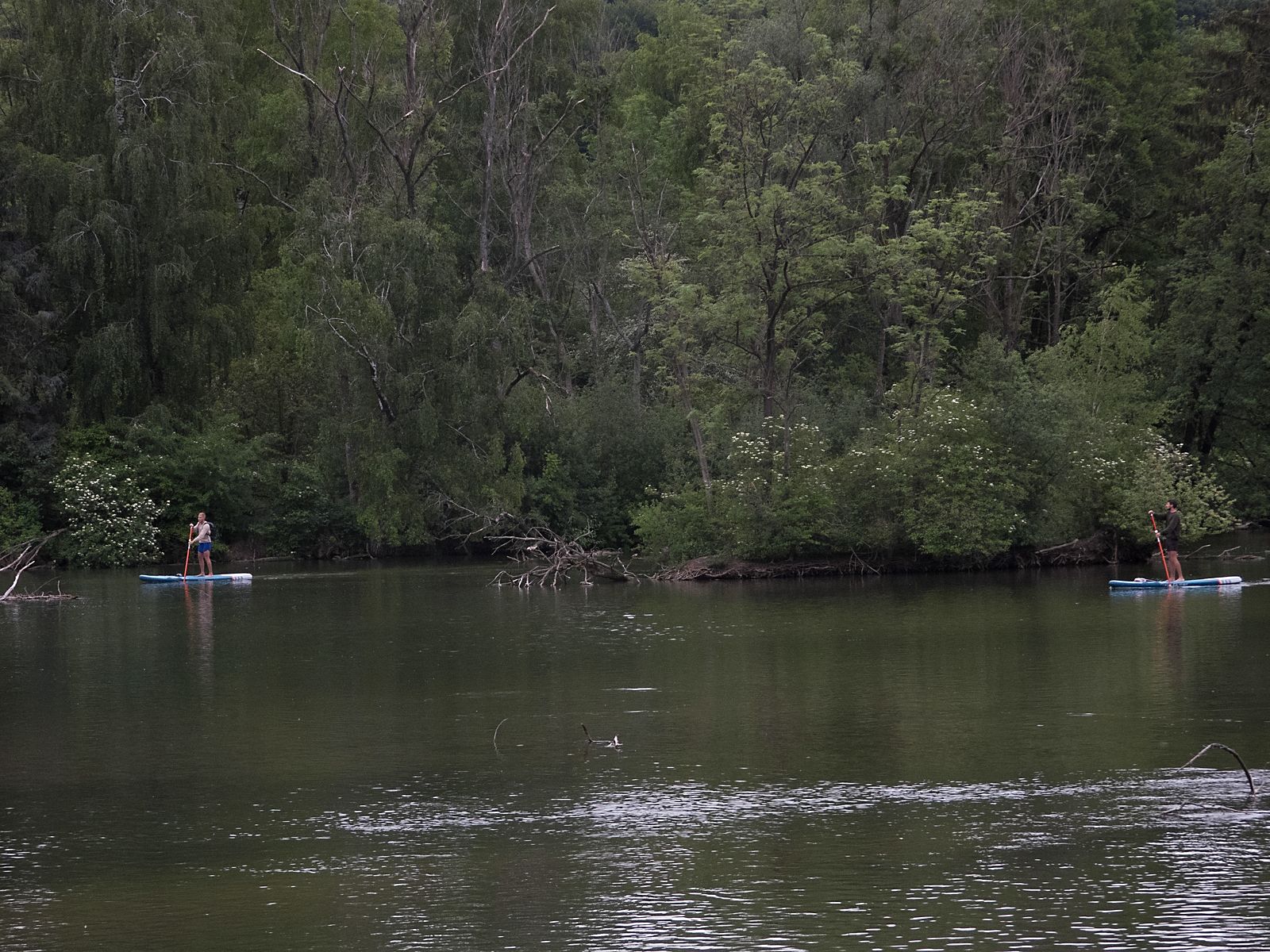 Zwei Stehpaddler verursachen Beunruhigungen bei den Graugänsen