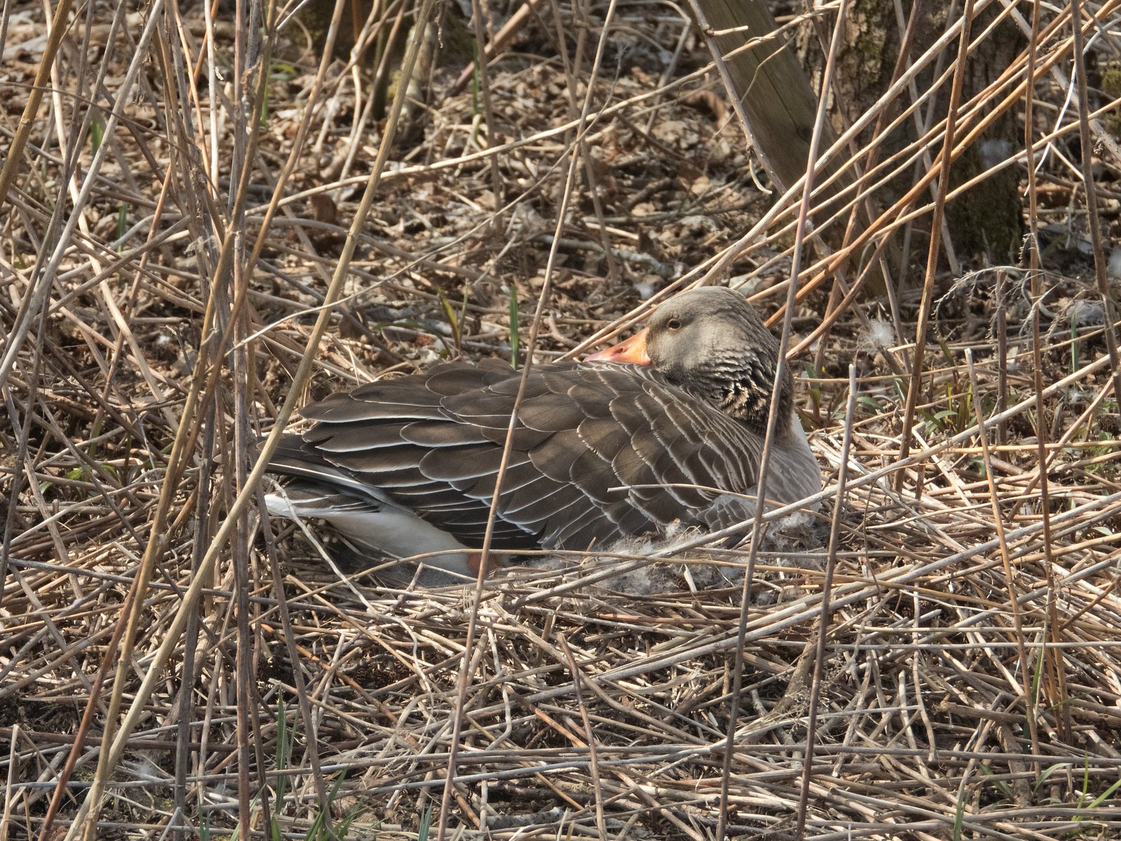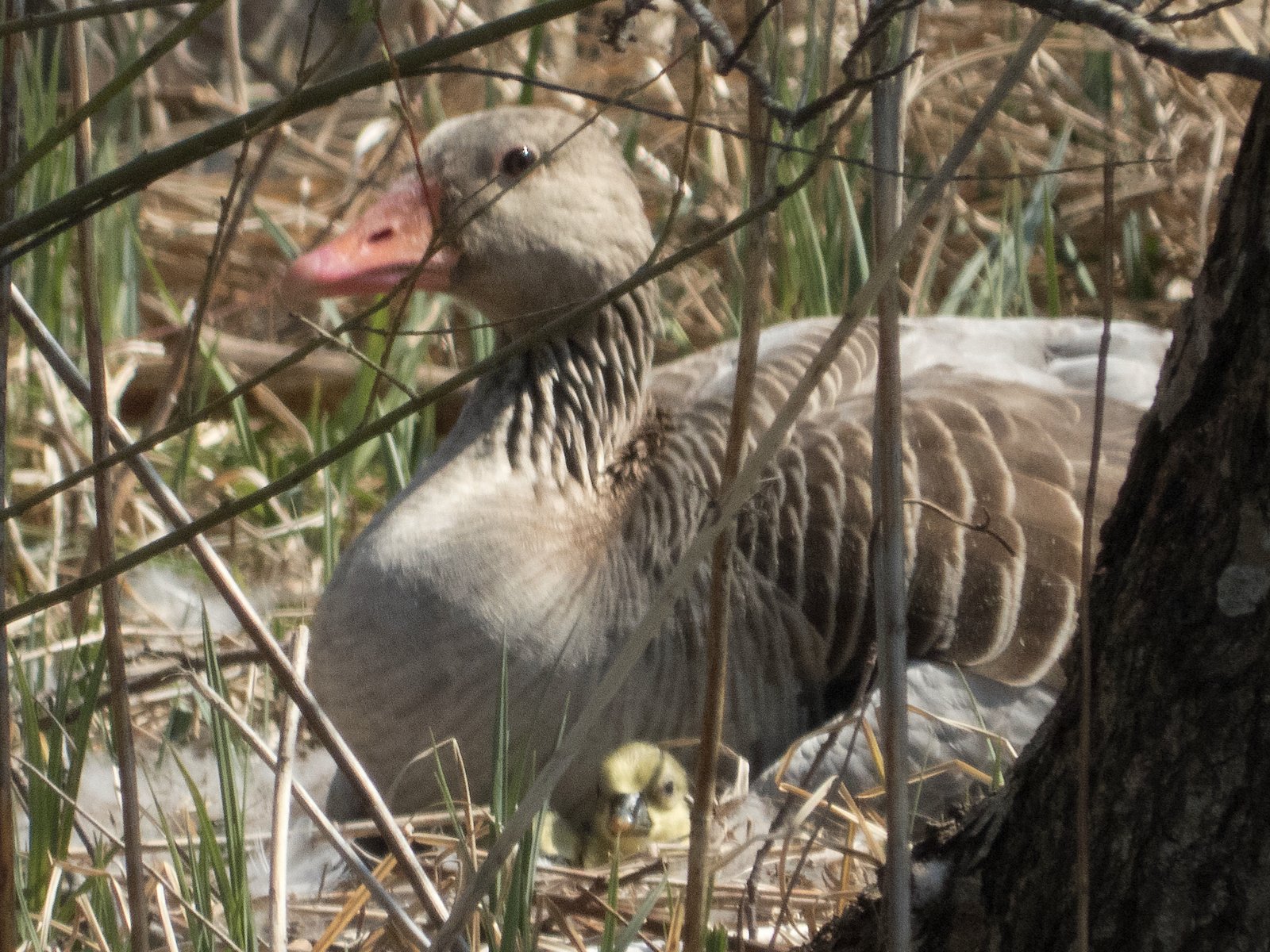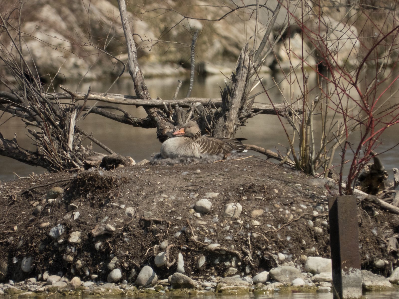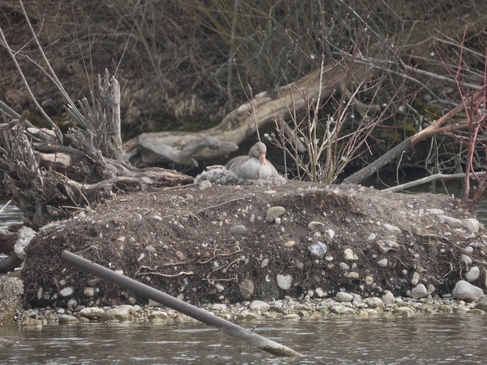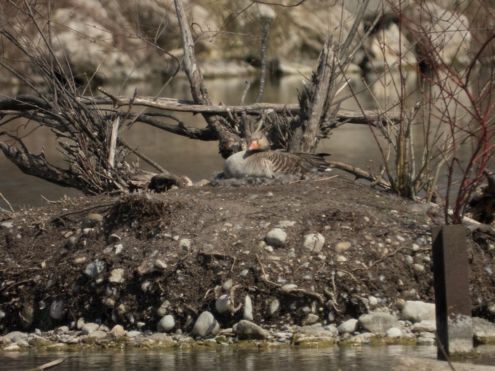 Mittlerweile sind es neun besetzte Graugansnester am Amperstausee. Und in einem Nest – aus weiter Entfernung (gegenüberliegendes Ufer) beobachtet – kamen Graugansgössel zum Vorschein, von der Gans im Nest unter die Fittiche genommen. Entdeckt am heutigen Tage wurden zwei neue Graugansnester und ein offenbar verlassener Nistplatz – vielleicht das Nest der sechs Gössel vom 2. April 2020. Die neuen Plätze liegen allesamt auch auf der Insel mit dem heutigen Gössel-Nest. Es wären dann insgesamt vier Nester auf einer einzigen Insel – belegt mit Gänsen im Nest derzeit drei Plätze. In der Mitte des Amperstausees und weiter südlich – bei der Insel neben der Eisenbahnbrücke – sind noch weitere vier Nistplätze sichtbar. Dazu kommen im nördlichen Bereich des Sees noch zwei weitere Graugansnester hinzu. Insgesamt also neun Graugansnester. Und hier und dort streifen auf Inseln Graugänse umher, offensichtlich auf der Suche nach Brutmöglichkeit. Nicht selten gibt es aber Ärger mit den in der Nähe schon brütenden Graugänsen.
