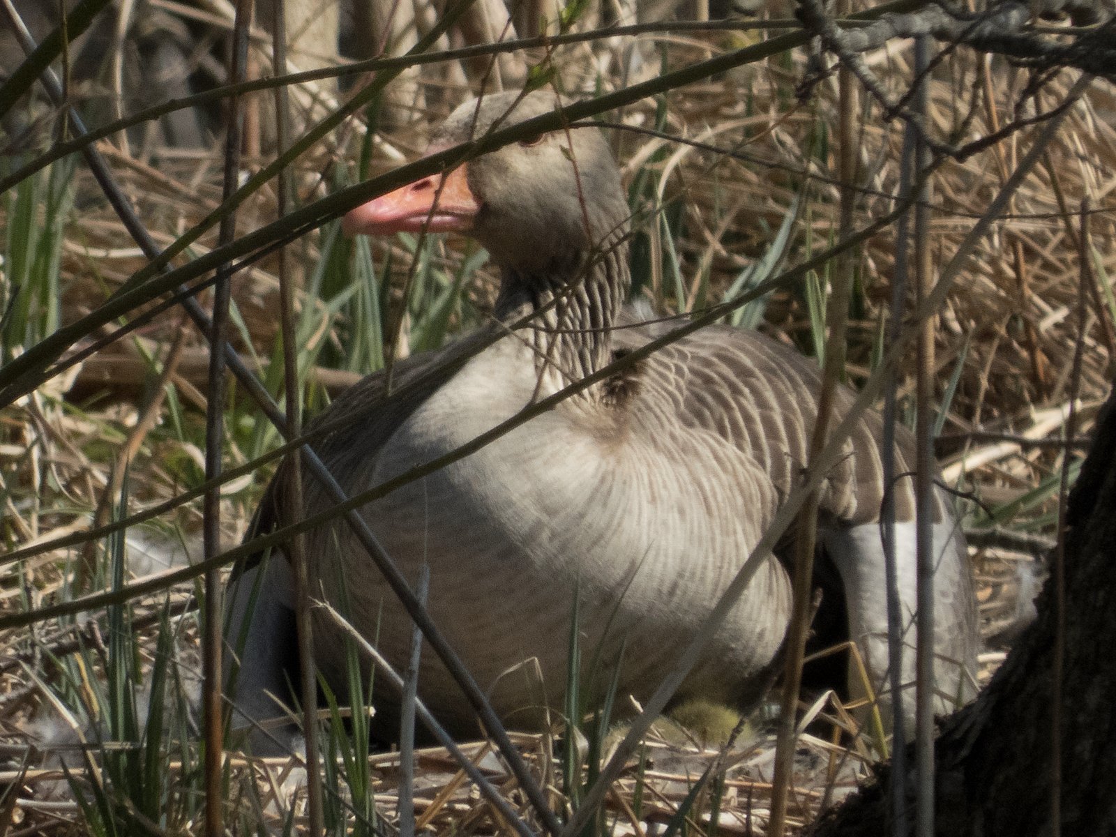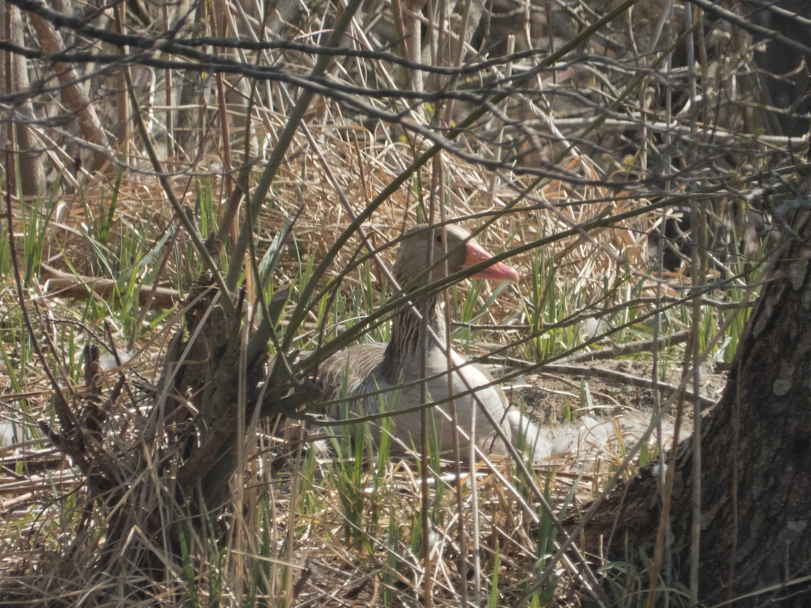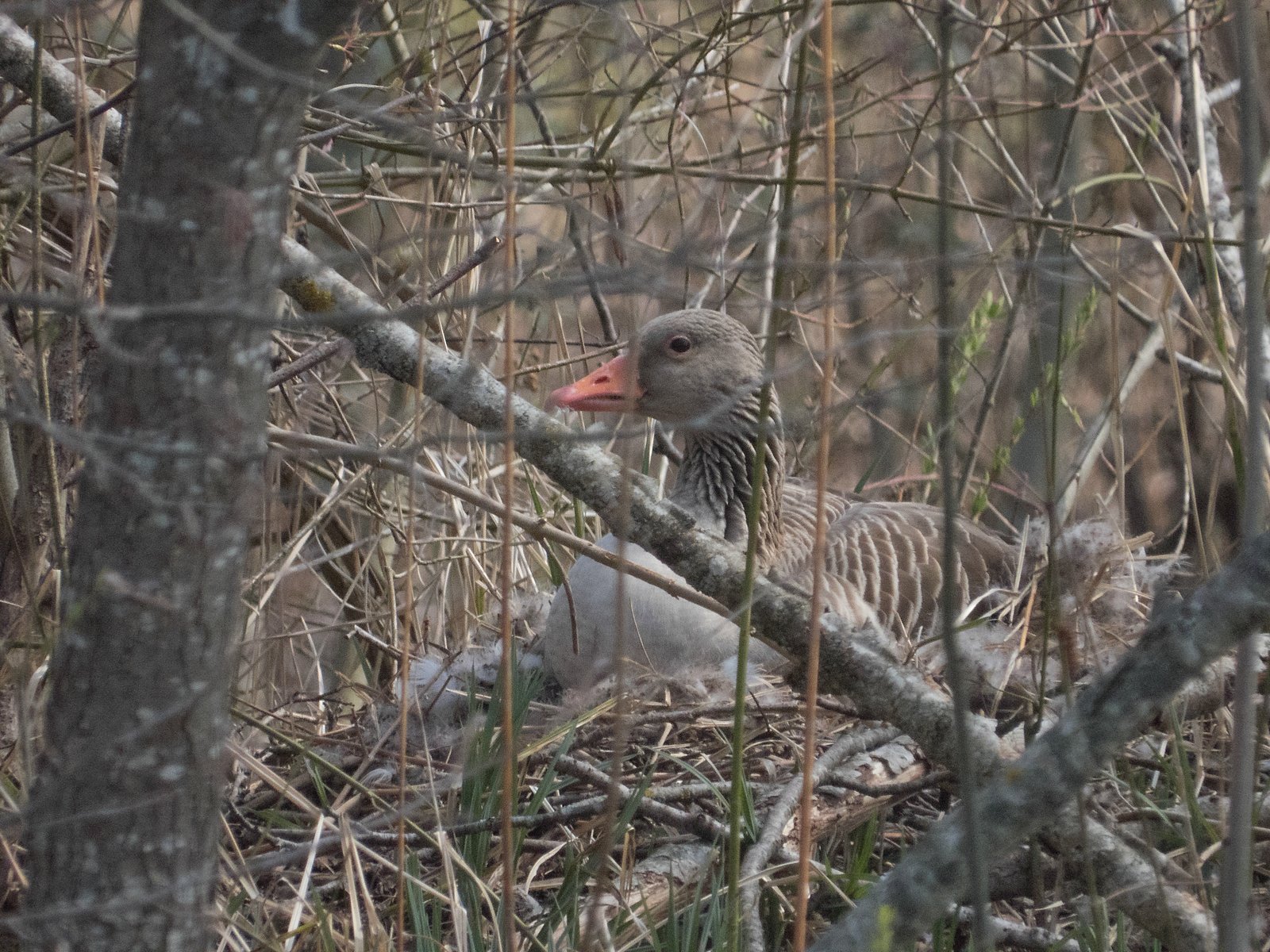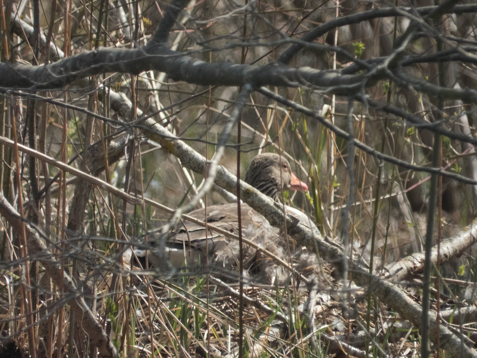 Mittlerweile sind es neun besetzte Graugansnester am Amperstausee. Und in einem Nest – aus weiter Entfernung (gegenüberliegendes Ufer) beobachtet – kamen Graugansgössel zum Vorschein, von der Gans im Nest unter die Fittiche genommen. Entdeckt am heutigen Tage wurden zwei neue Graugansnester und ein offenbar verlassener Nistplatz – vielleicht das Nest der sechs Gössel vom 2. April 2020. Die neuen Plätze liegen allesamt auch auf der Insel mit dem heutigen Gössel-Nest. Es wären dann insgesamt vier Nester auf einer einzigen Insel – belegt mit Gänsen im Nest derzeit drei Plätze. In der Mitte des Amperstausees und weiter südlich – bei der Insel neben der Eisenbahnbrücke – sind noch weitere vier Nistplätze sichtbar. Dazu kommen im nördlichen Bereich des Sees noch zwei weitere Graugansnester hinzu. Insgesamt also neun Graugansnester. Und hier und dort streifen auf Inseln Graugänse umher, offensichtlich auf der Suche nach Brutmöglichkeit. Nicht selten gibt es aber Ärger mit den in der Nähe schon brütenden Graugänsen.