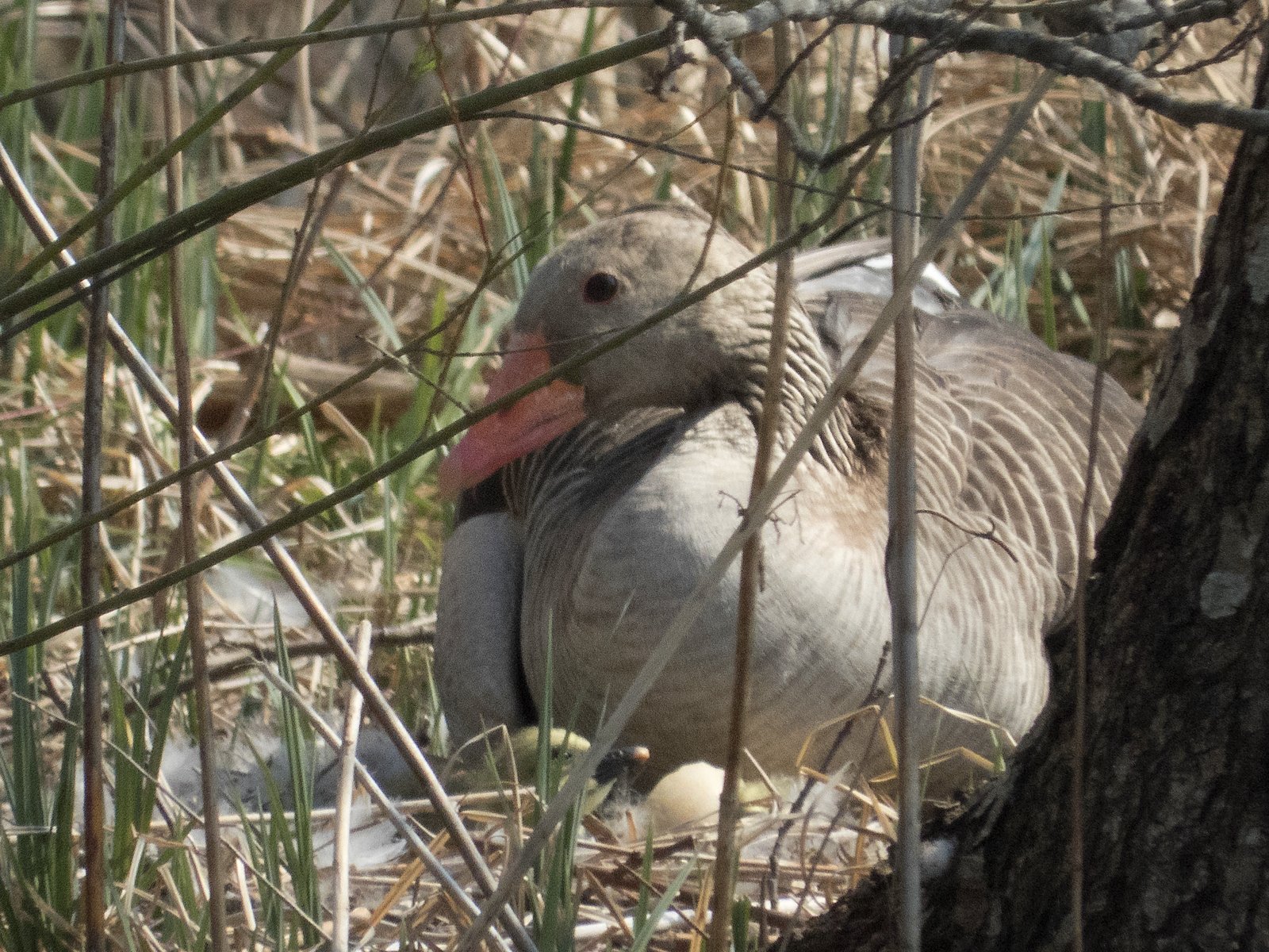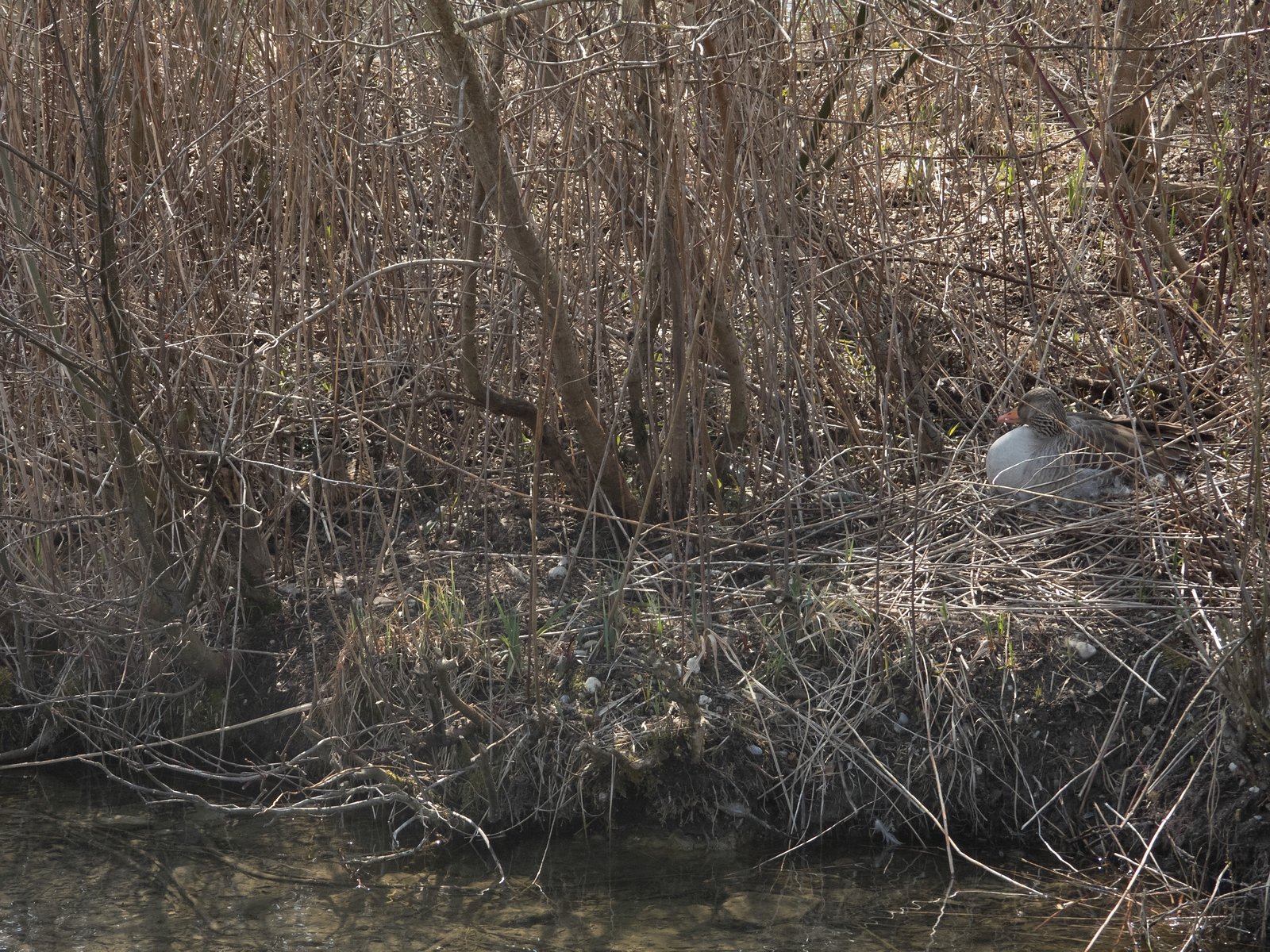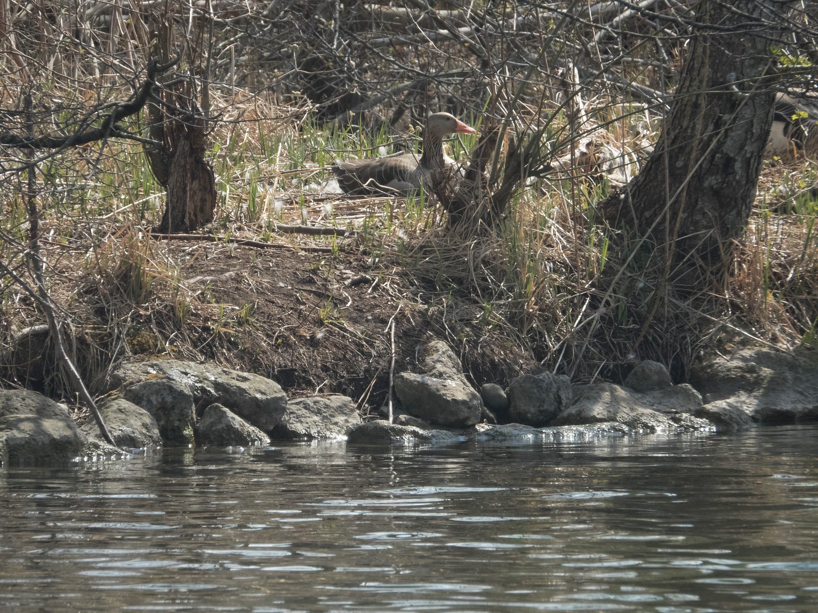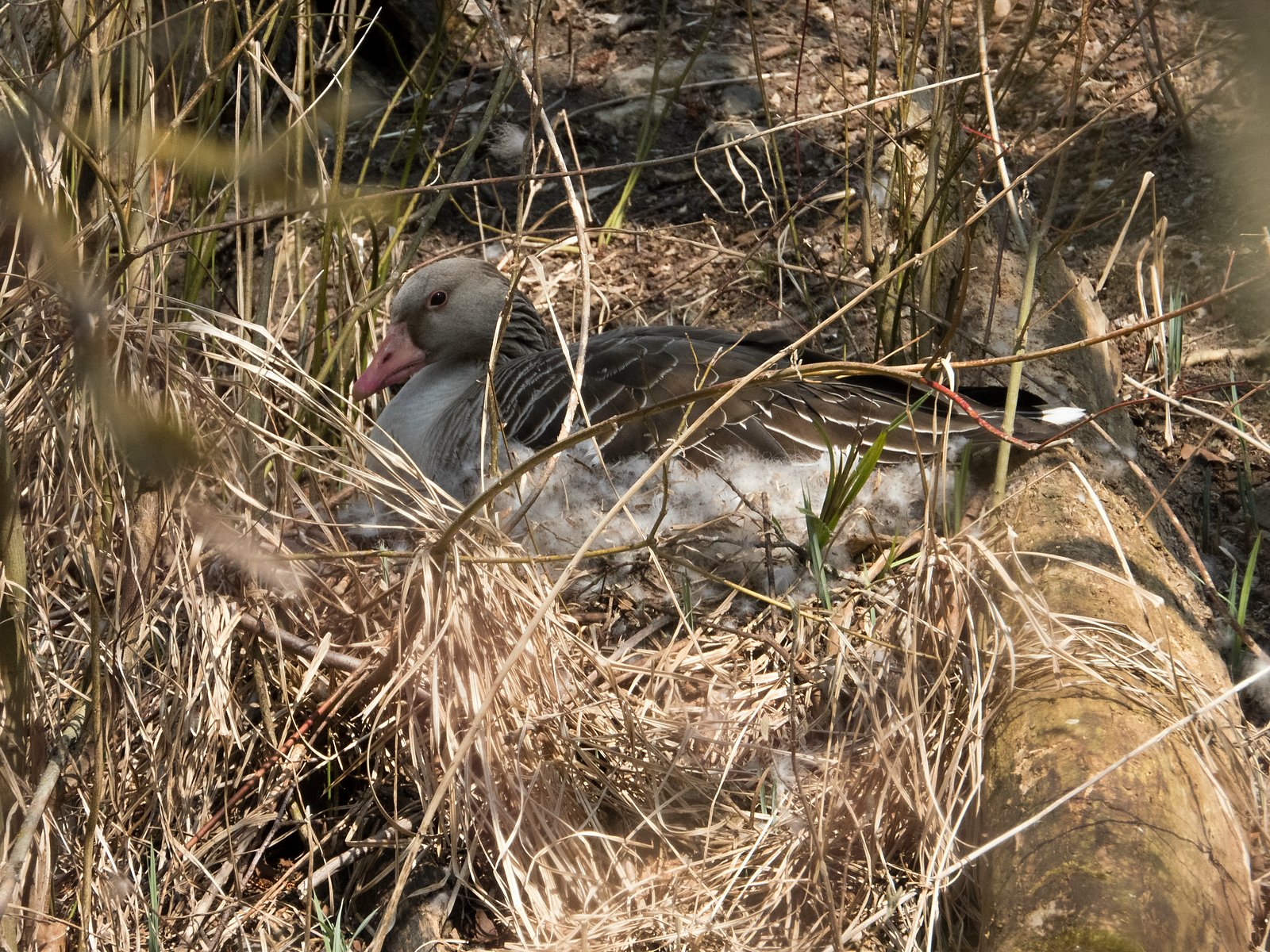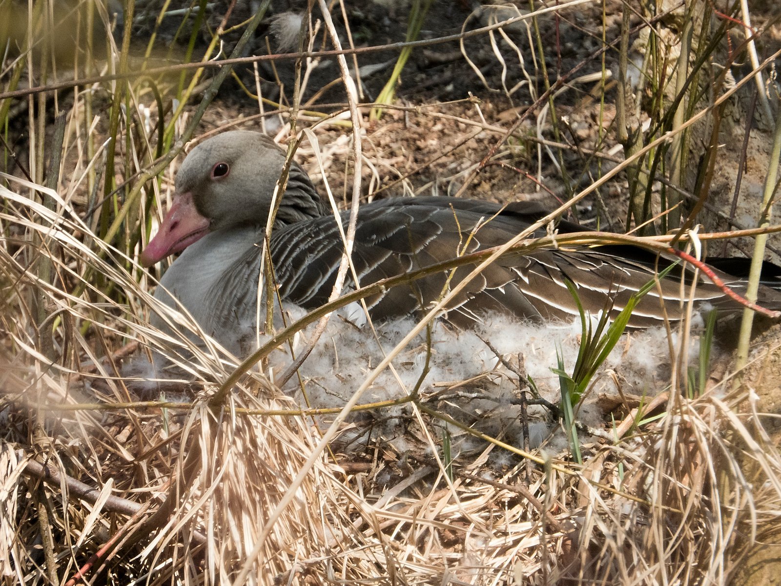Mittlerweile sind es neun besetzte Graugansnester am Amperstausee. Und in einem Nest – aus weiter Entfernung (gegenüberliegendes Ufer) beobachtet – kamen Graugansgössel zum Vorschein, von der Gans im Nest unter die Fittiche genommen. Entdeckt am heutigen Tage wurden zwei neue Graugansnester und ein offenbar verlassener Nistplatz – vielleicht das Nest der sechs Gössel vom 2. April 2020. Die neuen Plätze liegen allesamt auch auf der Insel mit dem heutigen Gössel-Nest. Es wären dann insgesamt vier Nester auf einer einzigen Insel – belegt mit Gänsen im Nest derzeit drei Plätze. In der Mitte des Amperstausees und weiter südlich – bei der Insel neben der Eisenbahnbrücke – sind noch weitere vier Nistplätze sichtbar. Dazu kommen im nördlichen Bereich des Sees noch zwei weitere Graugansnester hinzu. Insgesamt also neun Graugansnester. Und hier und dort streifen auf Inseln Graugänse umher, offensichtlich auf der Suche nach Brutmöglichkeit. Nicht selten gibt es aber Ärger mit den in der Nähe schon brütenden Graugänsen.