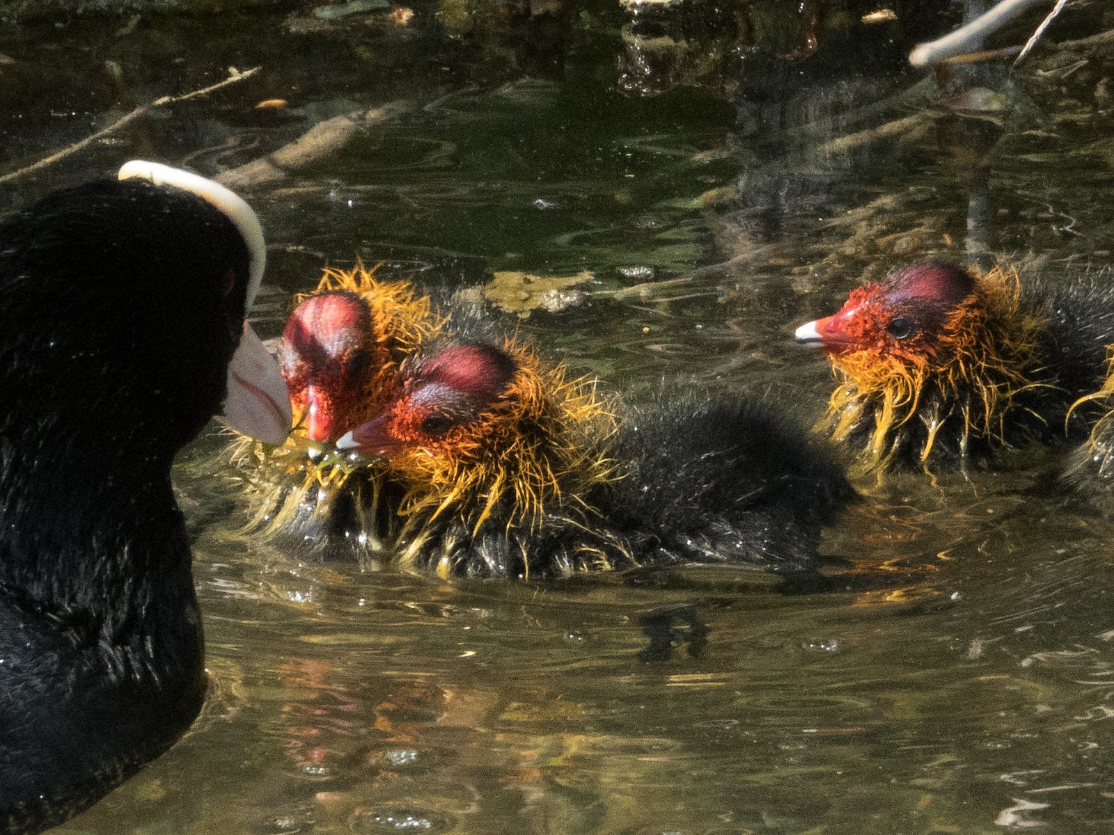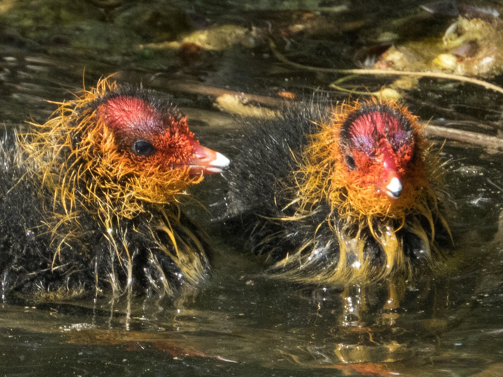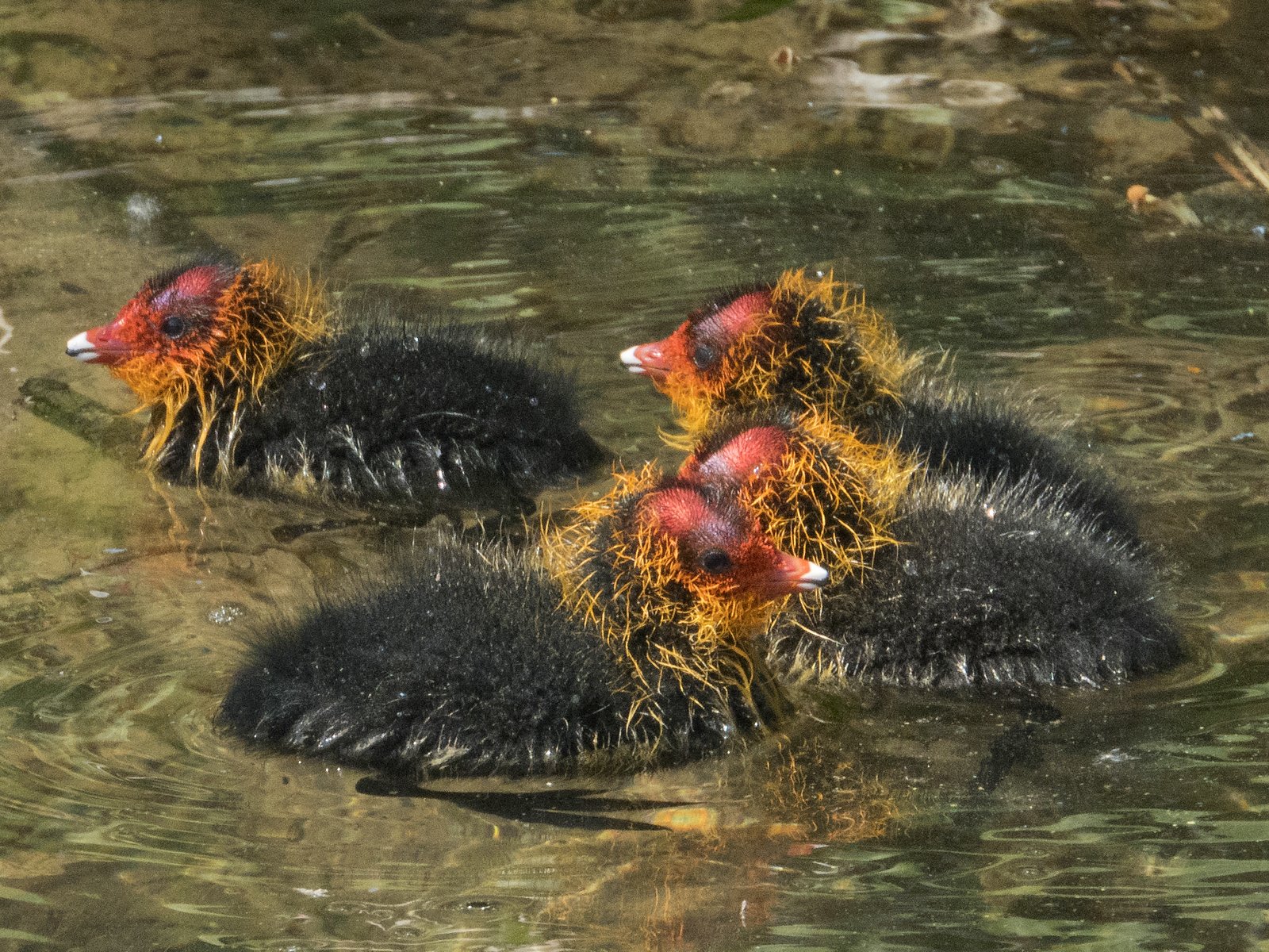 Zwei von fünf Blesshuhn-Küken. In dieser Saison mein erstes Blesshuhn-Kükenbild.