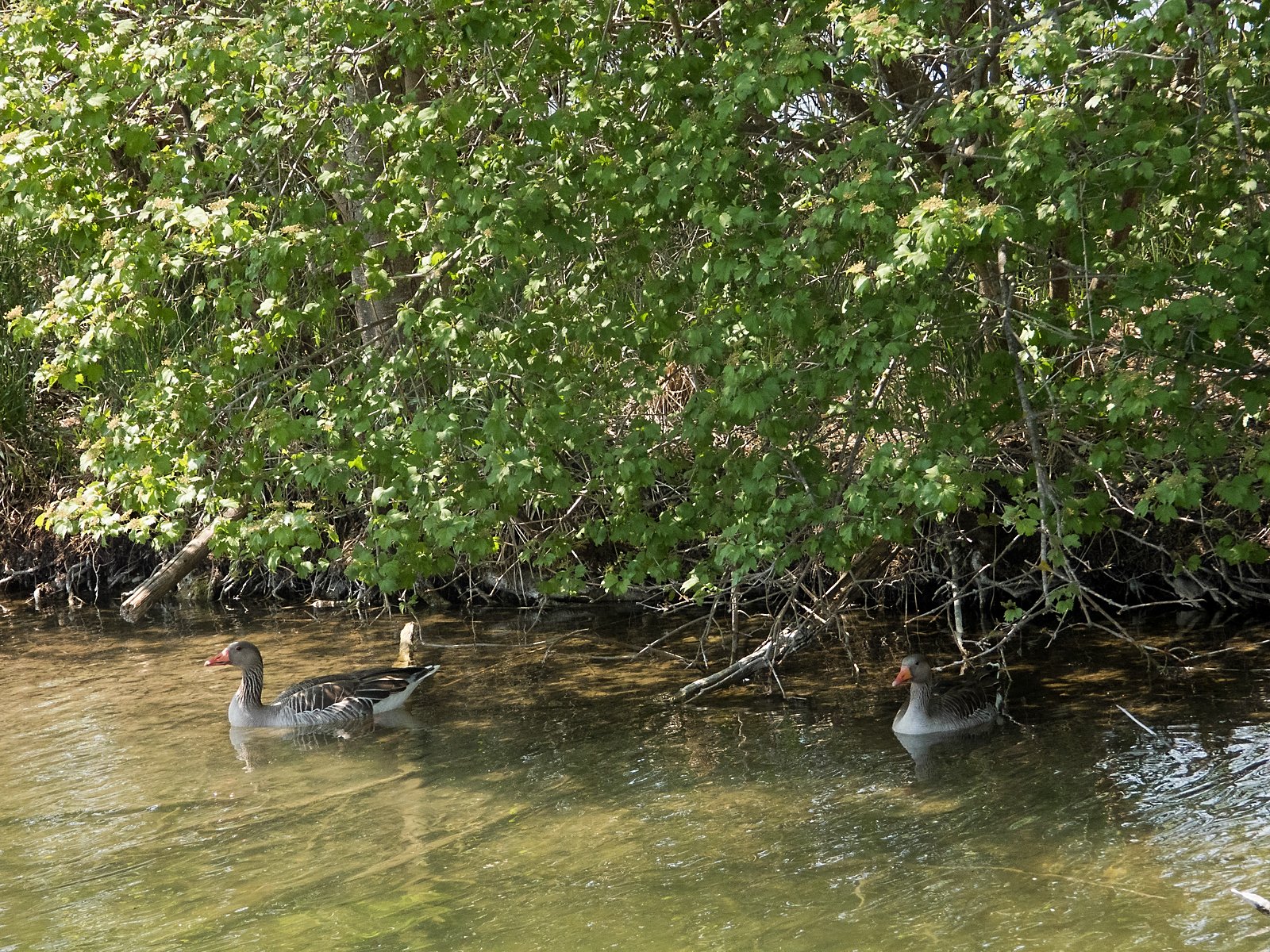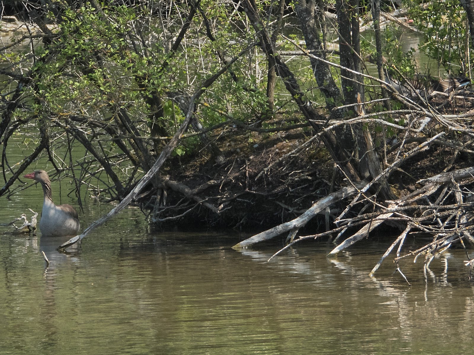 Ganz in der Nähe der Fischteiche, in einem Seitenarm des Amperstausees, begegnete ich einem Grauganspaar mit zwei Gösseln. Hier ist Eizahn ganz offensichtlich noch da. Vielleicht handelt es sich um das Paar mit Gösseln am 21. April 2020 auf kleiner Insel im Amperstausee.