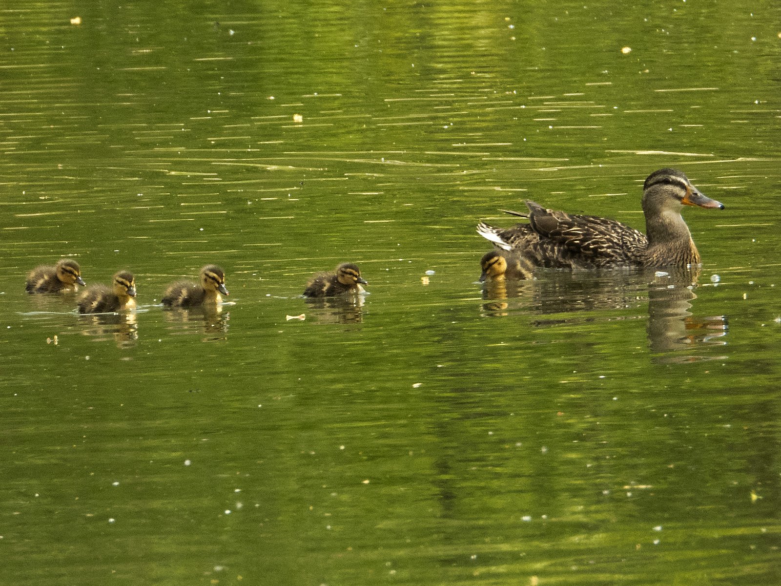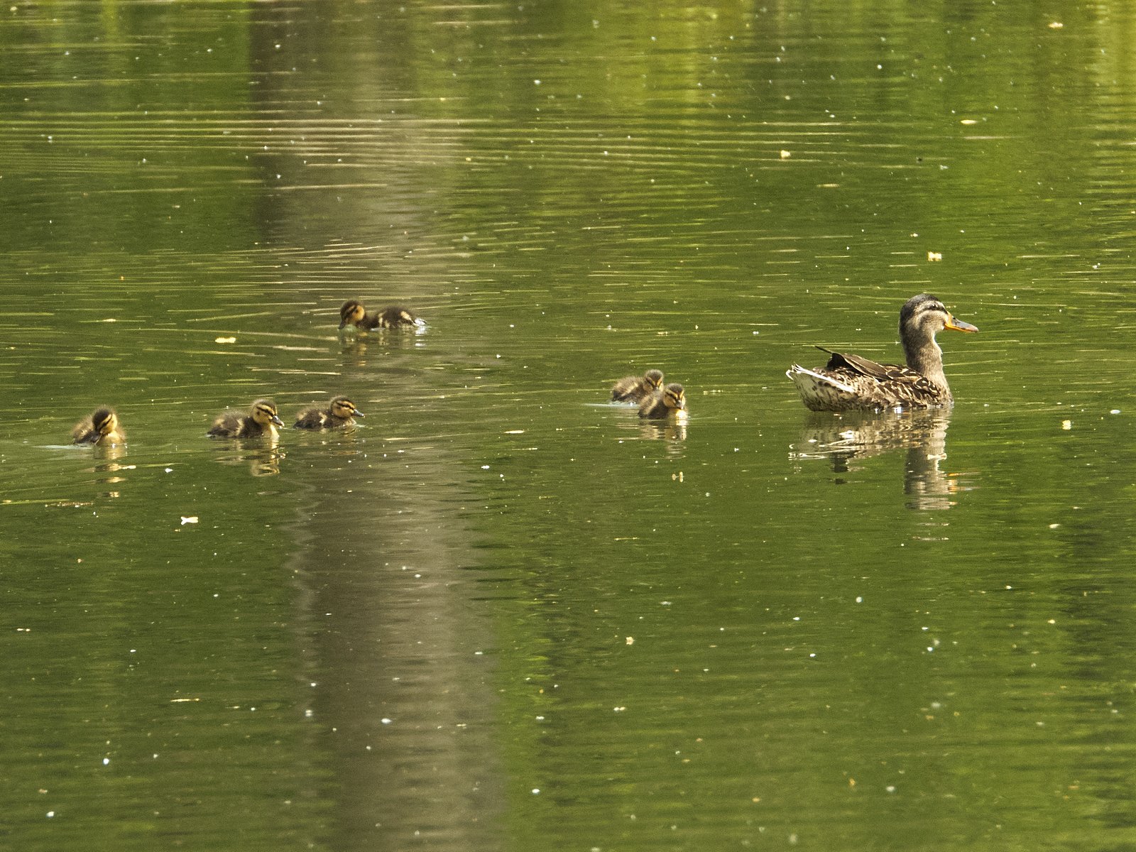 Sechs von sieben Entenküken mit Entenmutter