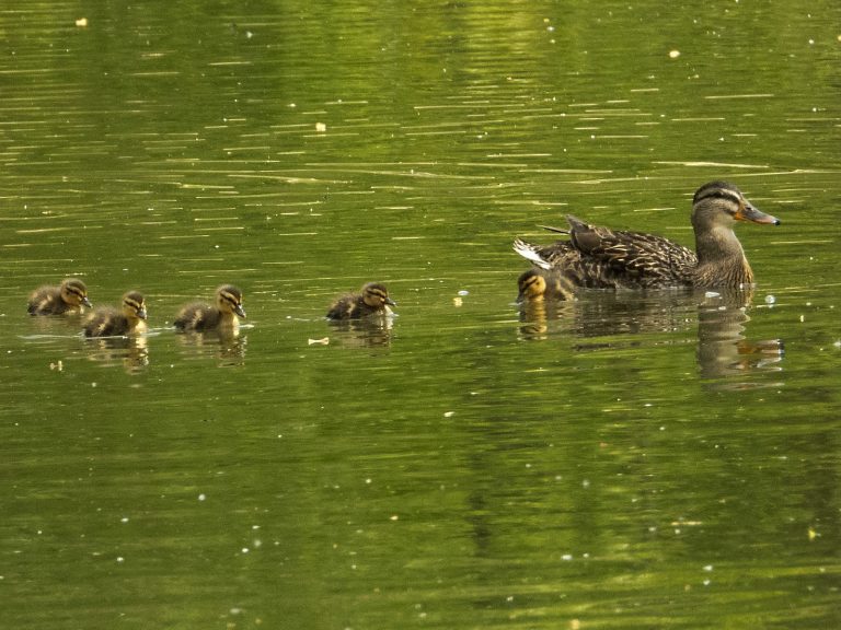 Stockente führt sieben Küken