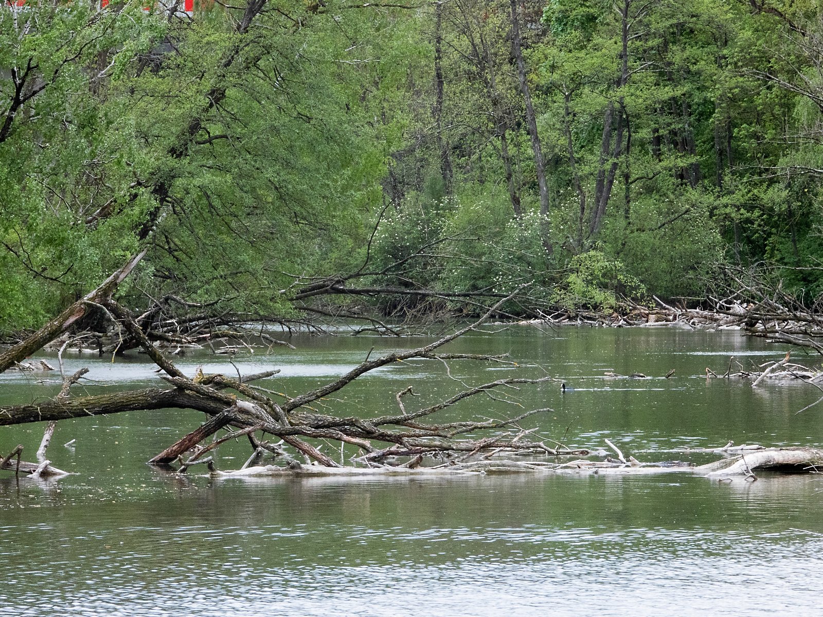 An gewohnter Stelle wieder fünf Blesshuhn-Küken, im See tollten sieben junge Gänsesäger herum (also ein Jungvogel weniger im Vergleich zum Beobachtungstag des 25. April 2020). Im Gelände der eingezäunten Fischteiche Grauganspaar mit Jungvögeln, mutmaßlich die gestern gefilmte Familie. Heute im Nest: Eine Graugans, ein Höckerschwan, drei Kanadagänse.