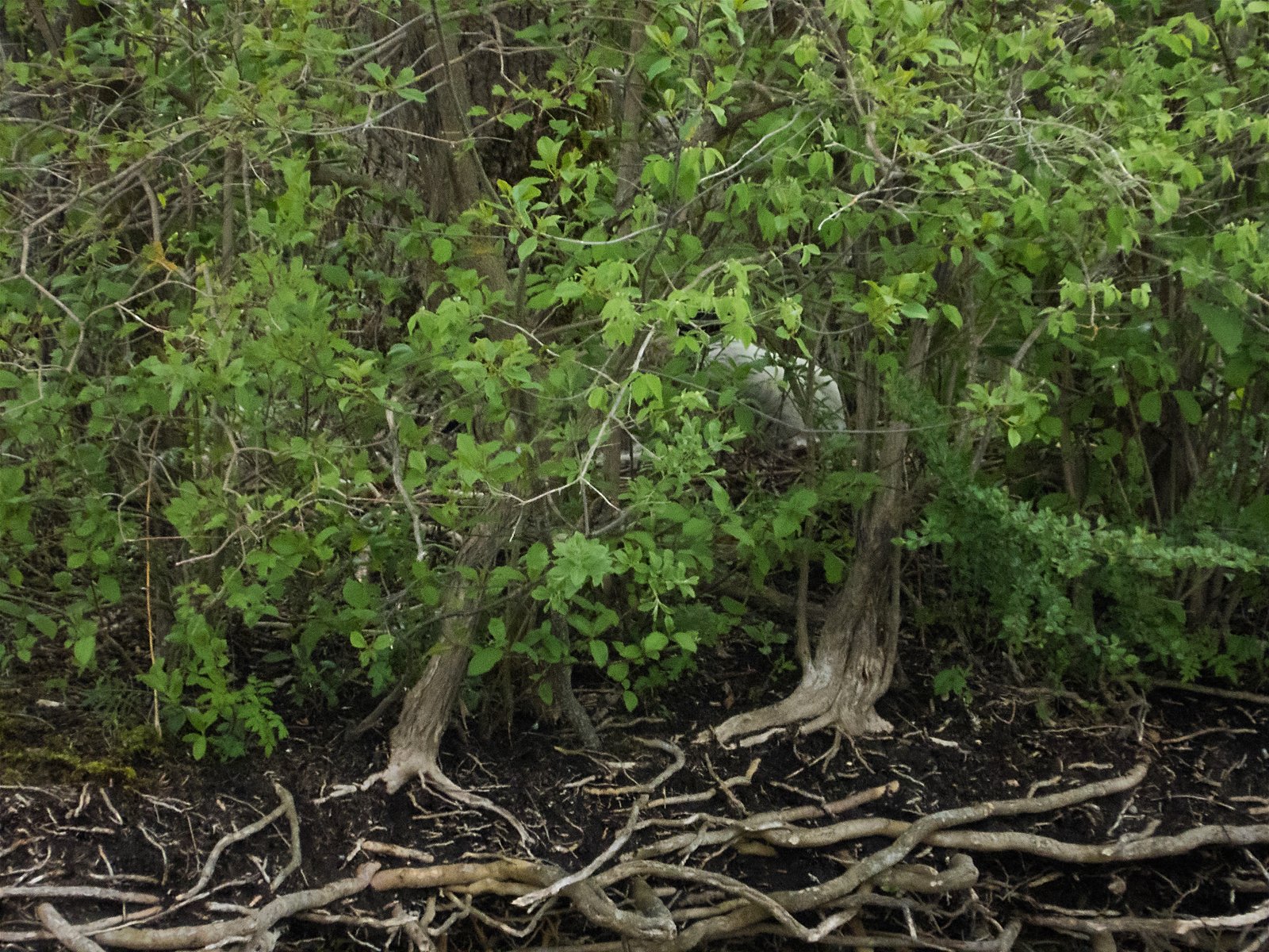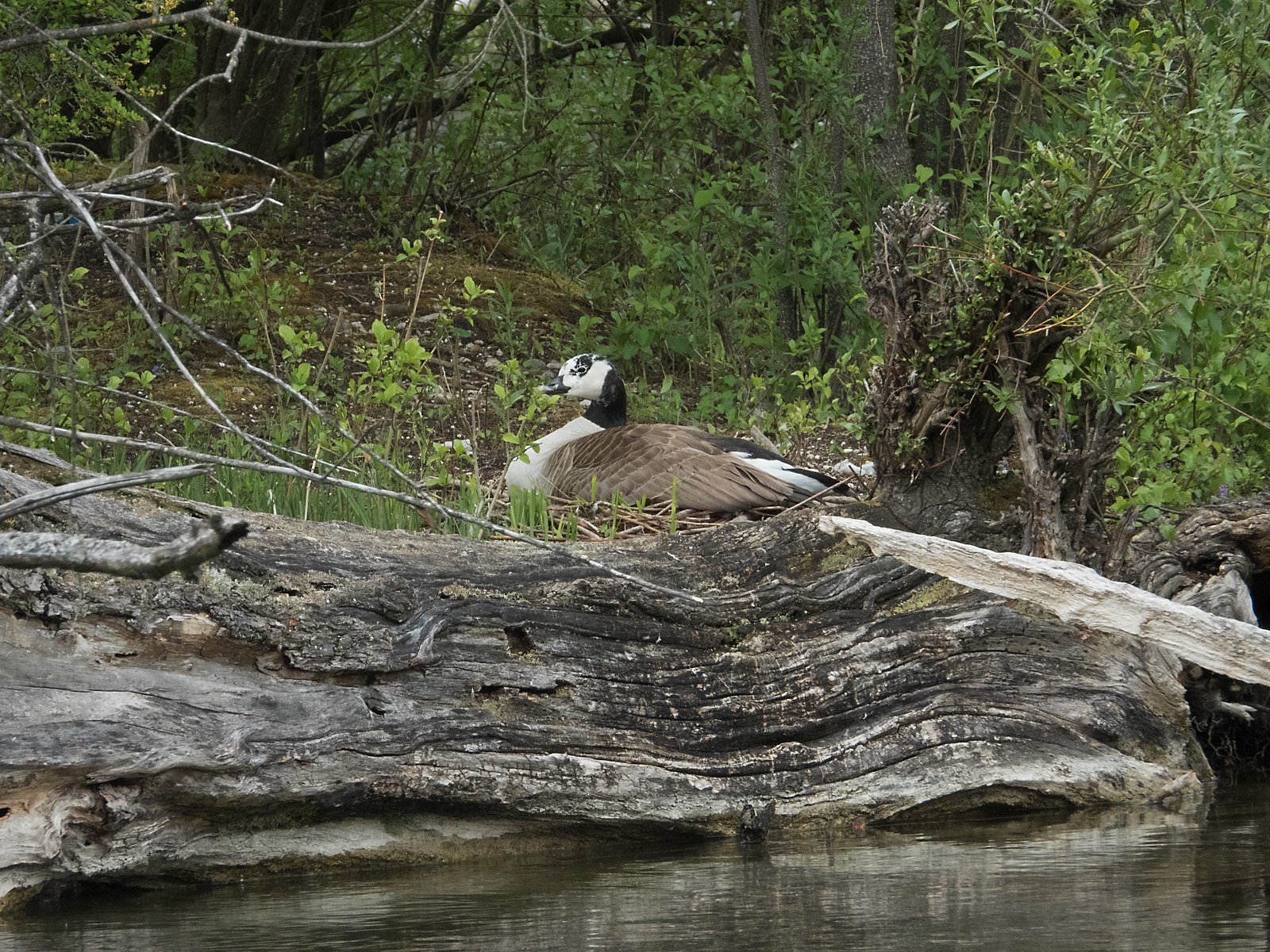 Kanadagans auf dem Nest. Kaum noch zu sehen durch das dichte Grün