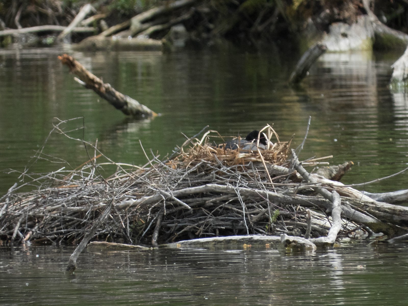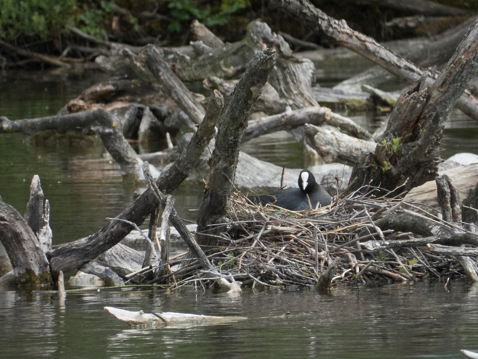 Blesshuhn auf dem Nest. Mitten im Amperstausee zwei Blesshuhn-Nester