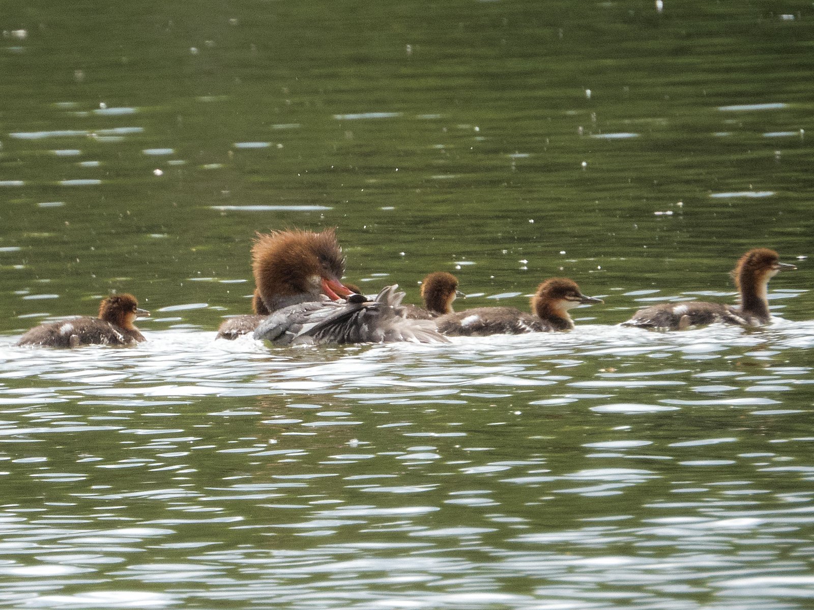 Sieben junge Gänsesäger. Flügelschläge eines Jungvogels