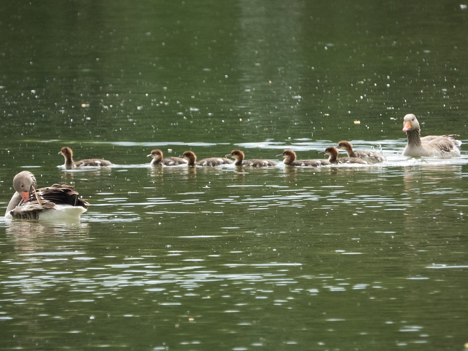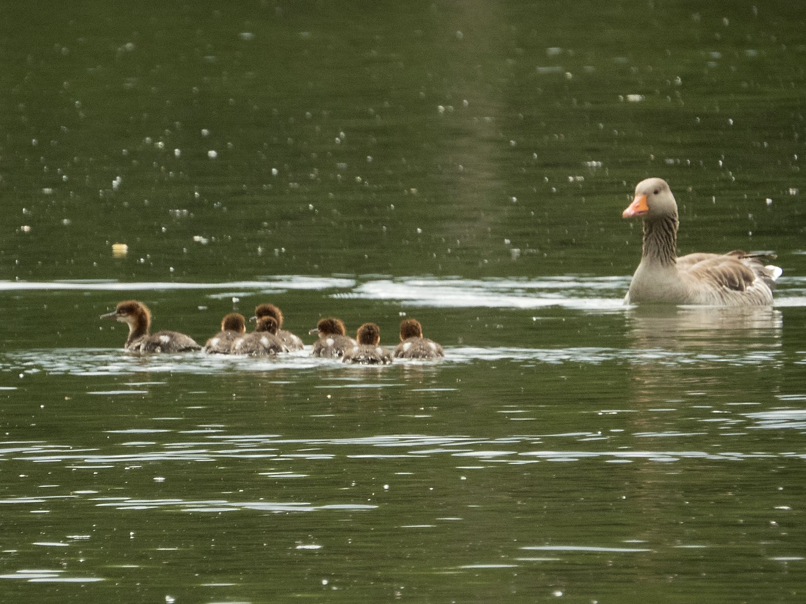 Sieben Gänsesäger-Jungvögel, eingerahmt von Graugänsen
