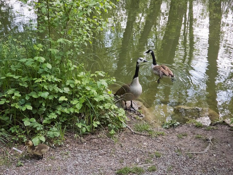 Gans links unten das noch einzige verbliebene Kanadagans-Gössel. Hier auf gefährlicher Erkundungstour am Ufer.