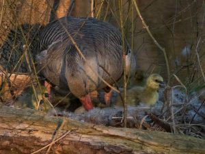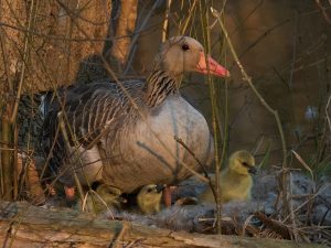 Konrad Lorenz schreibt in seinem “Jahr der Graugans”: “Den ersten Tag nach dem Schlüpfen verbringen die Gänsekinder noch unter der Mutter auf dem Nest. Dann beginnen sie kleine Ausflüge zu machen und sich so allmählich auf das Verlassen des Nestes vorzubereiten.”