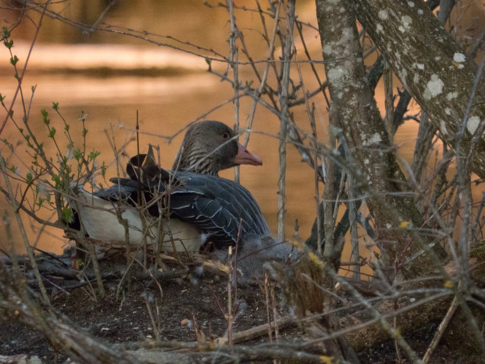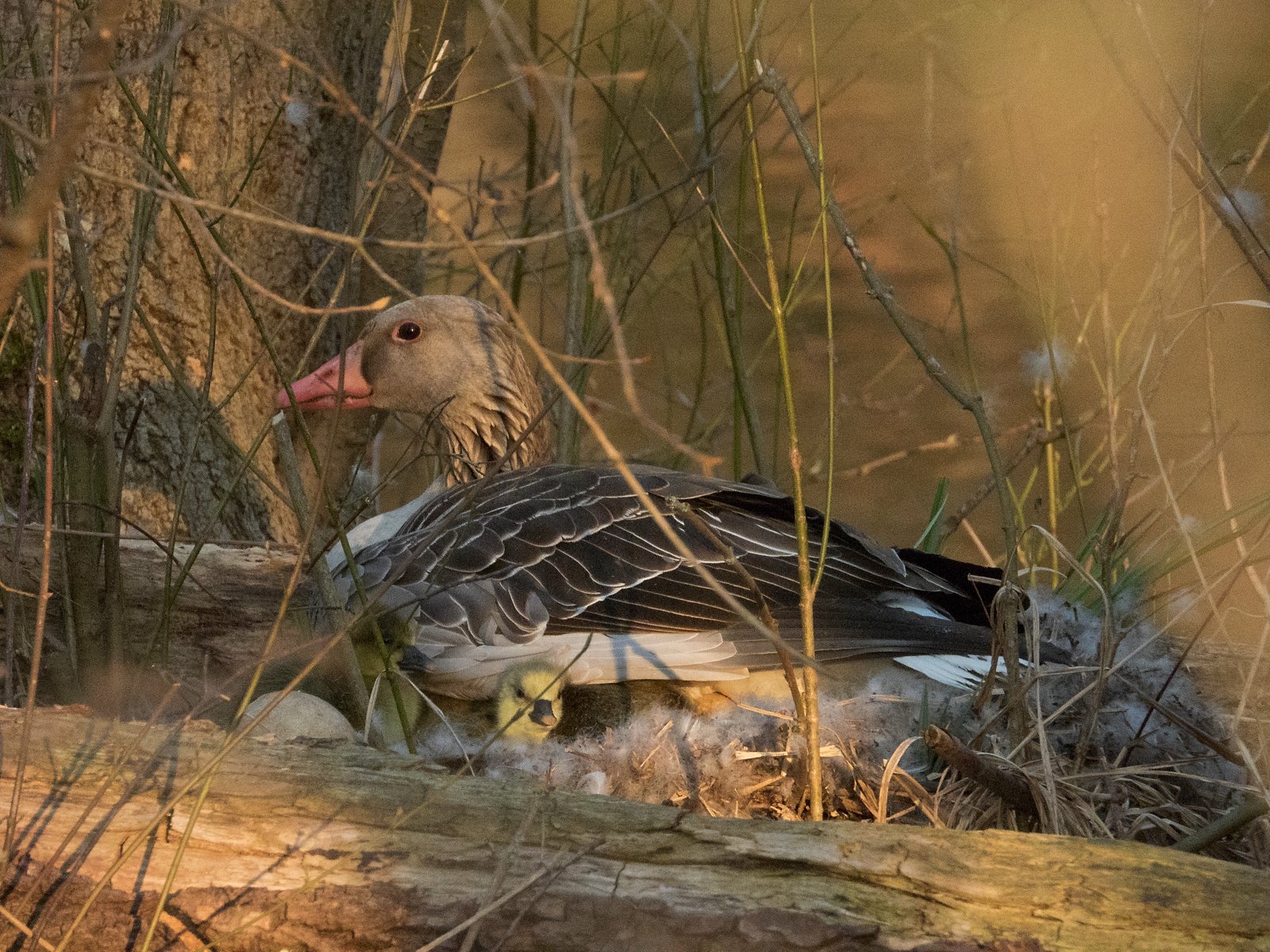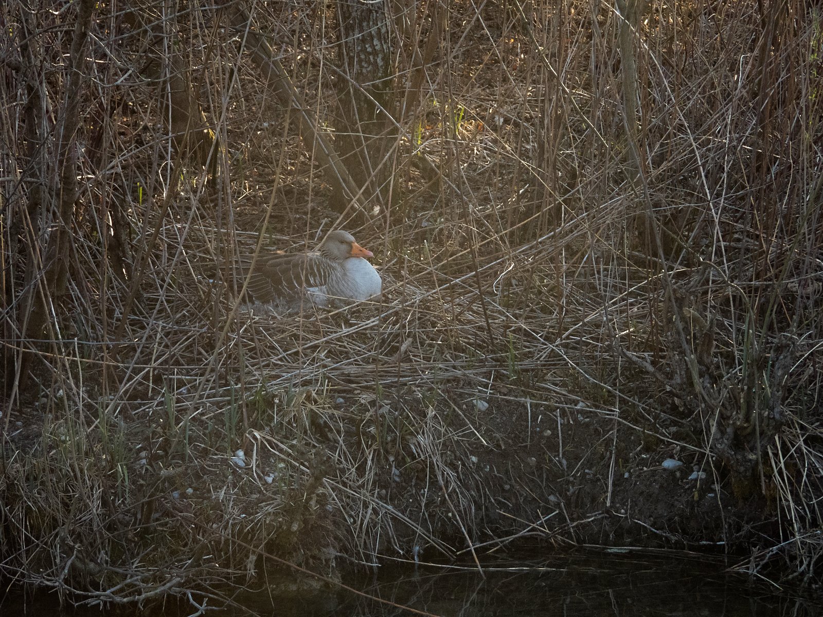 Im Nest befinden sich im Amperstausee derzeit acht Graugänse. In einem Nest davon waren heute sieben Gössel sichtbar. Es handelt sich um die südlichste Insel, kurz vor der Eisenbahnbrücke.