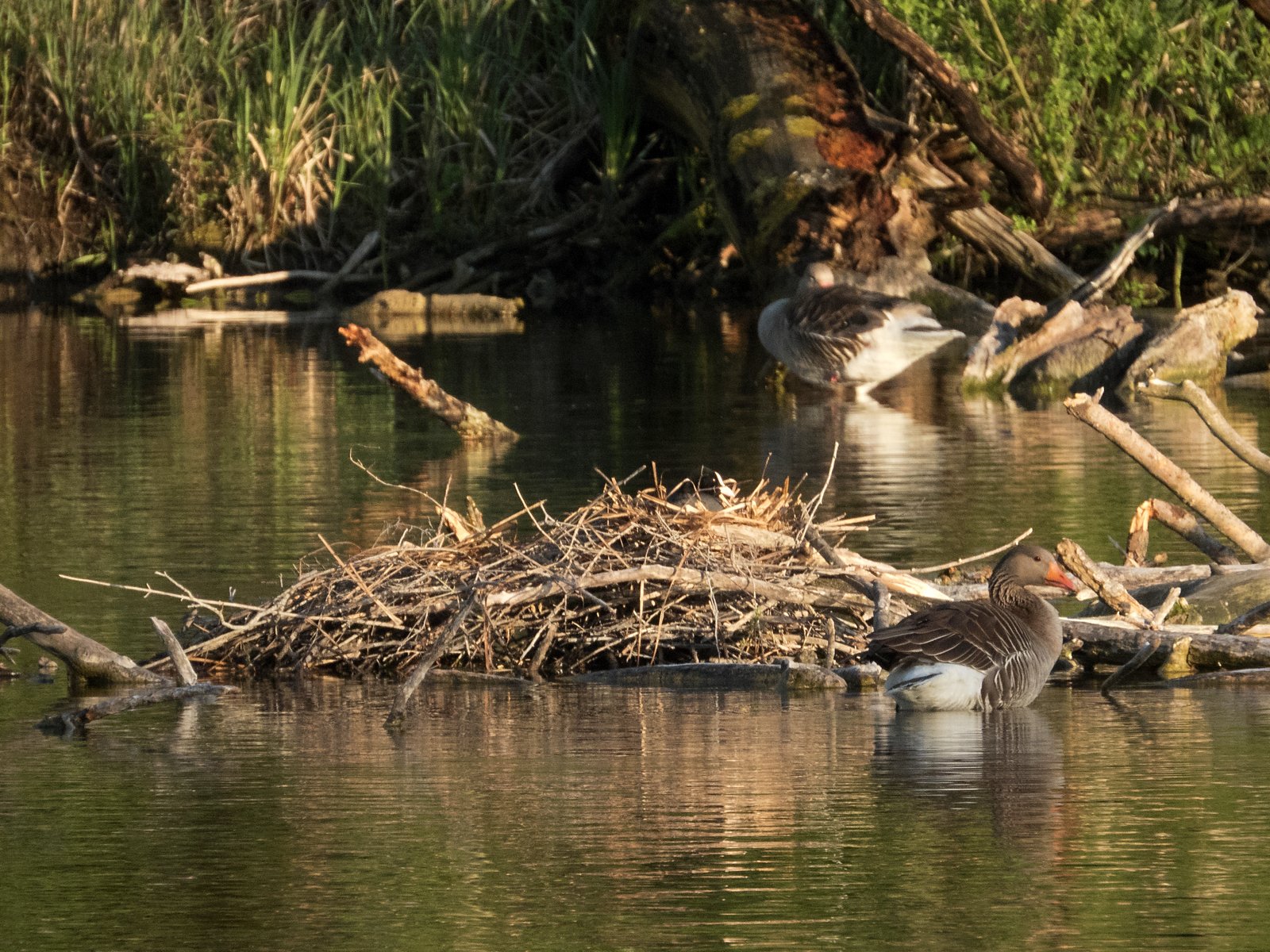Im Nest eine Graugans, drei Kanadagänse, ein Höckerschwan.