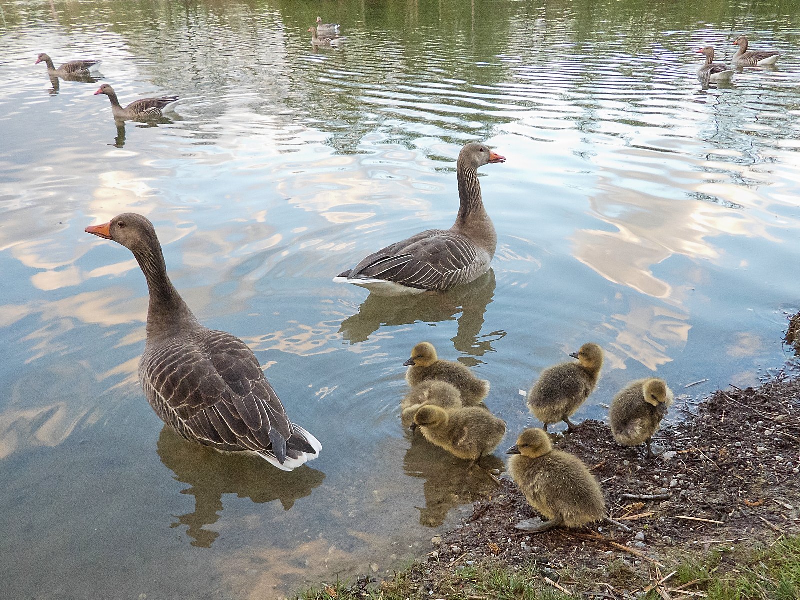 Eine Graugansfamilie mit sechs Gänsekindern macht Rast am Ufer: