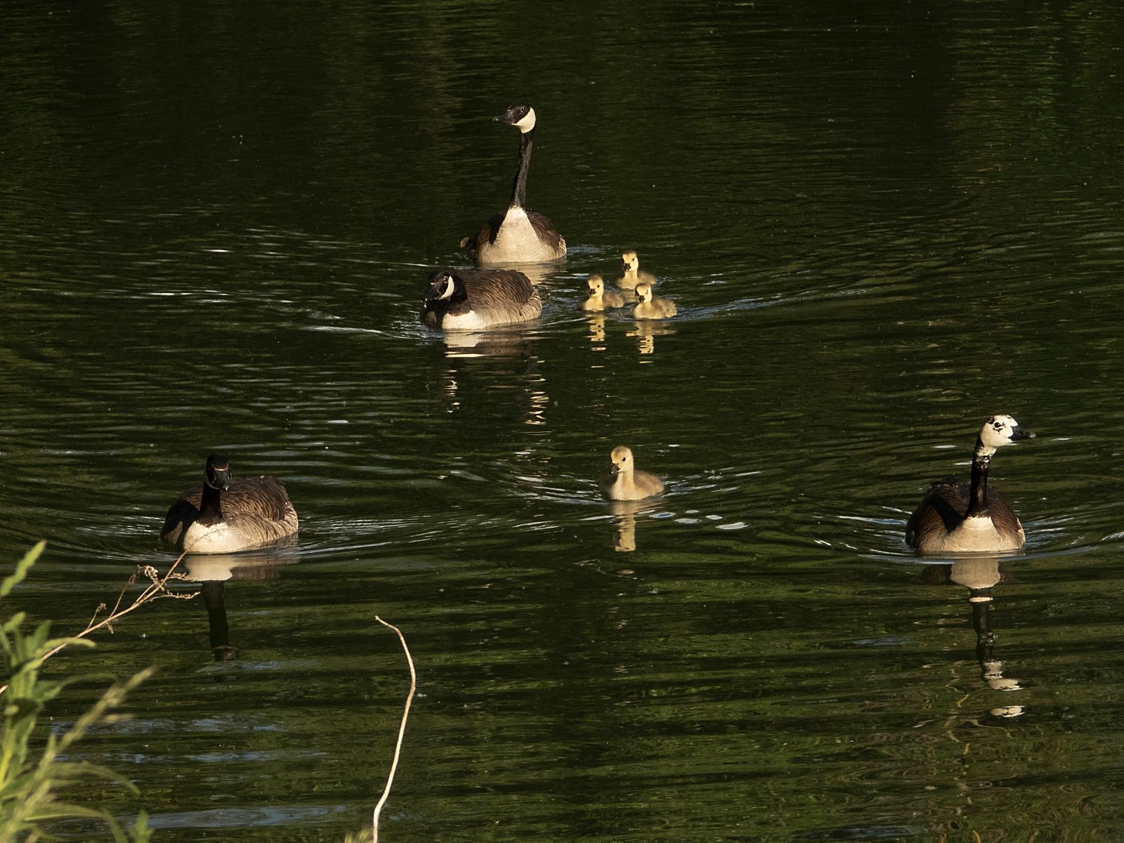 Zwei Kanadagans-Familien: Einmal drei und einmal ein Gössel