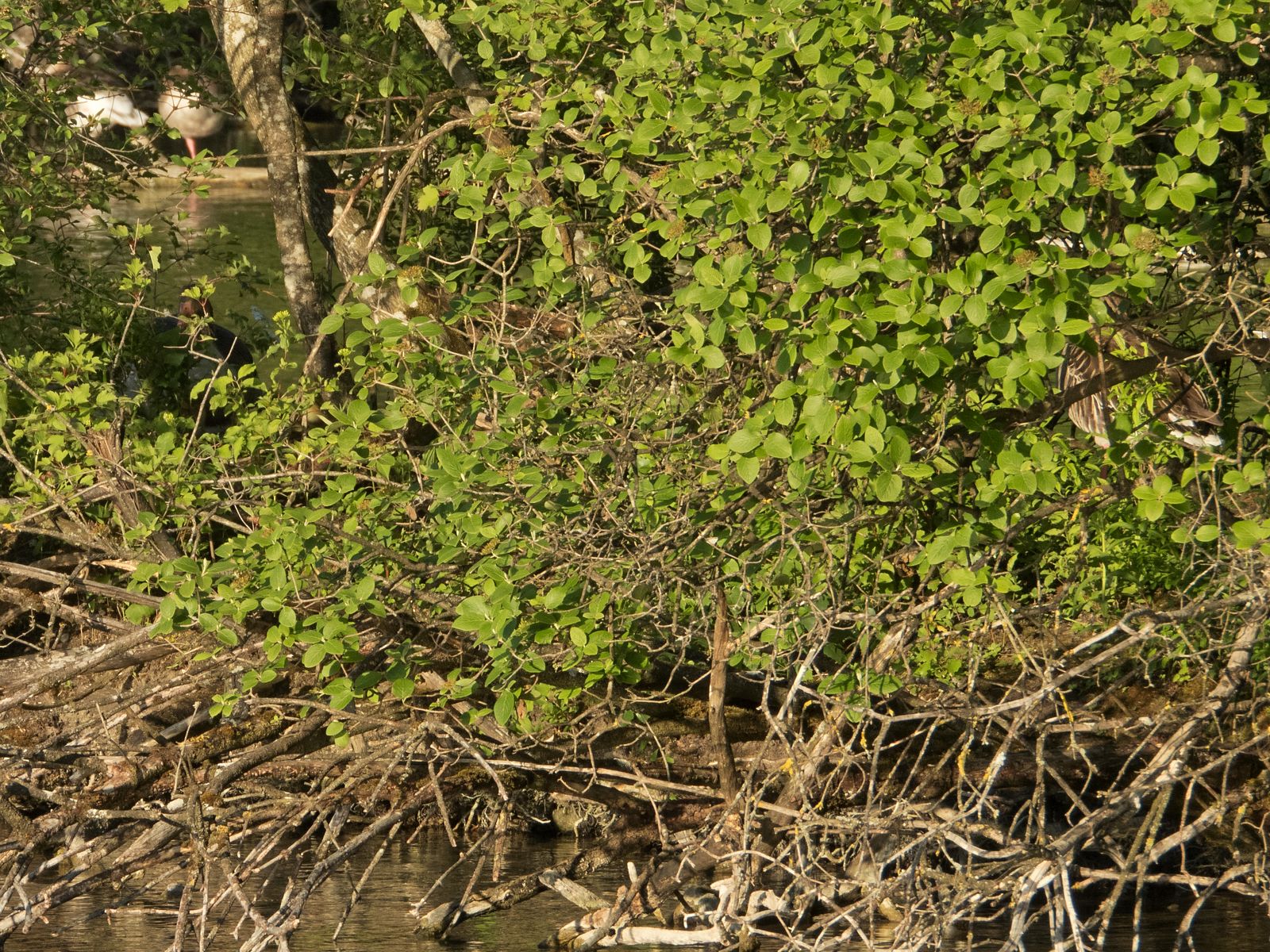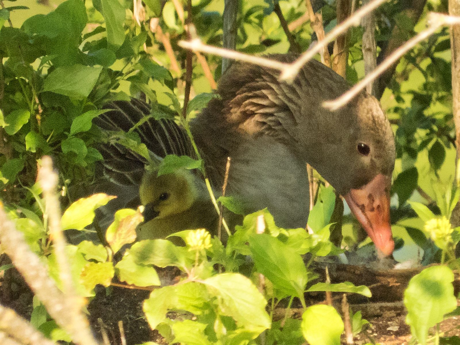 Zuletzt brütete nur noch eine einzige Graugans am Amperstausee. Die ersten Köpfchen sind nun unter der Mutter aufgetaucht. Heute oder gestern sind die Gössel wohl geschlüpft.