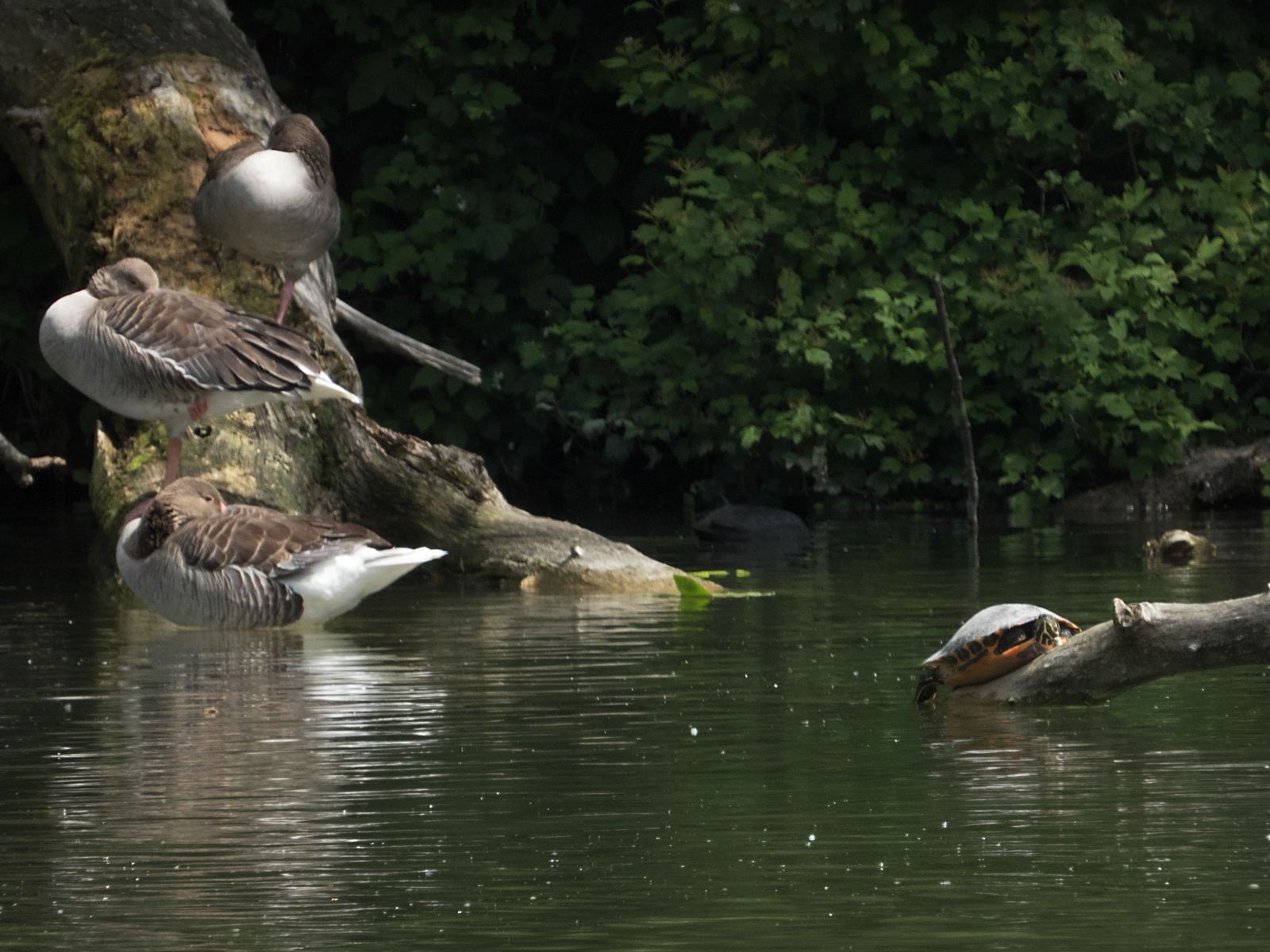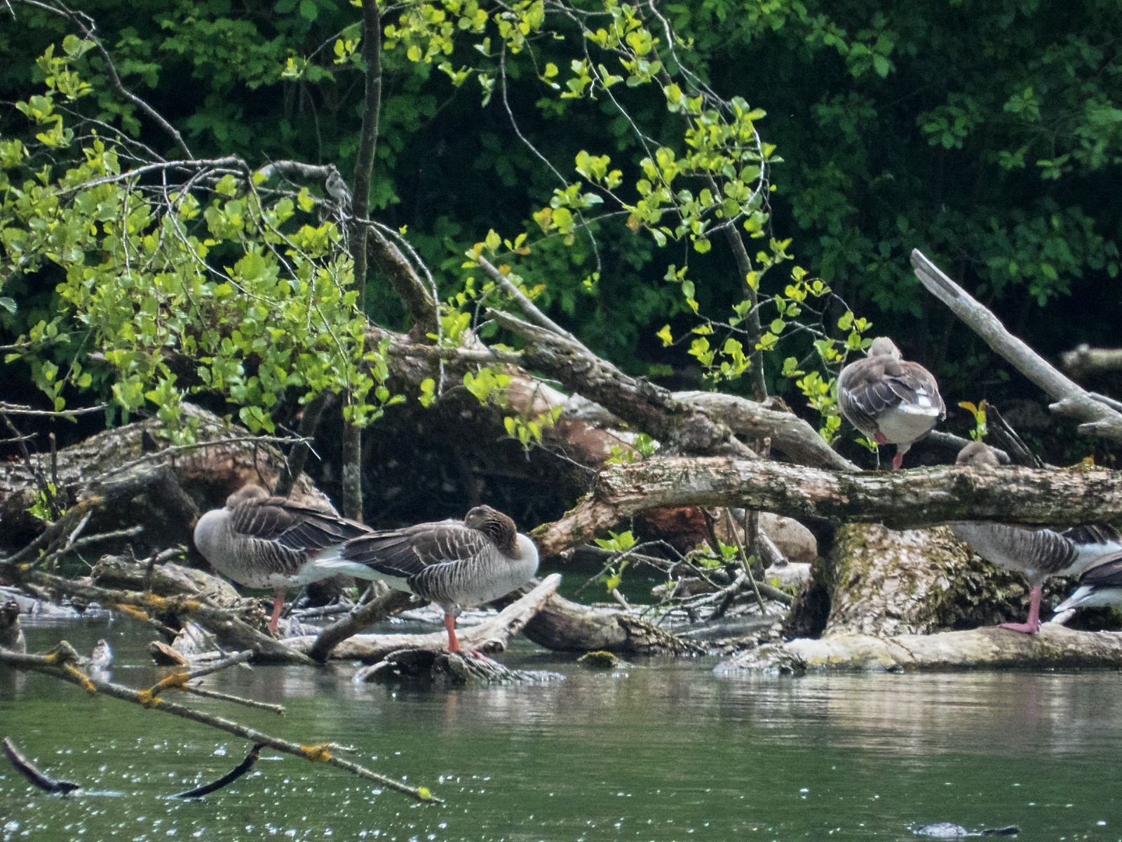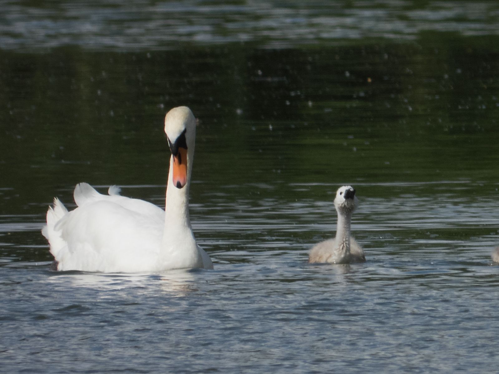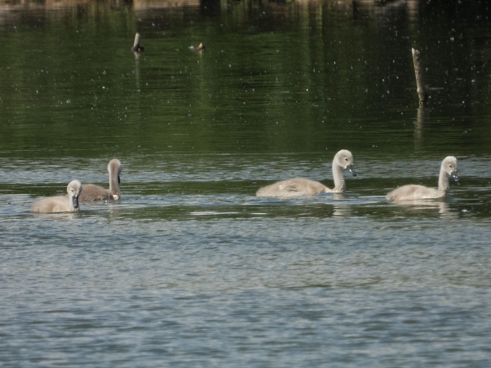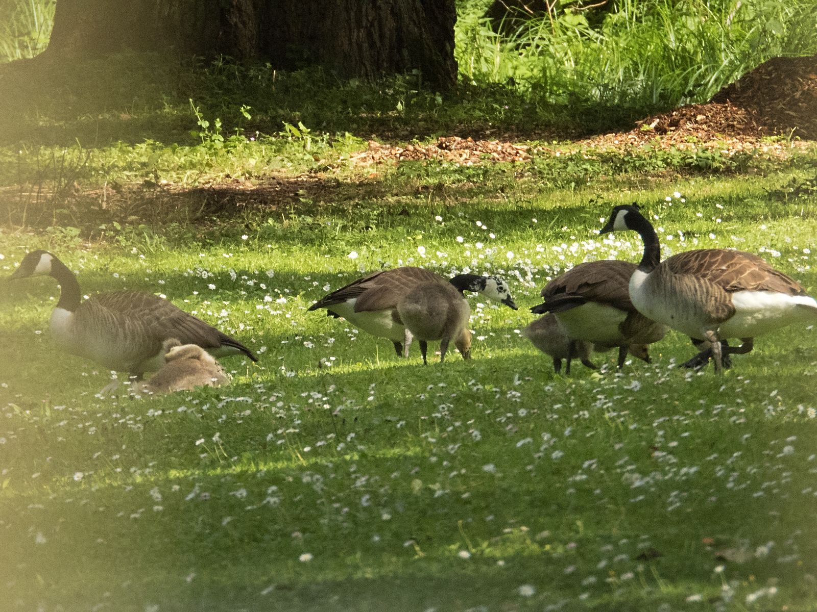 Am 6. Juni grasten noch vier Gössel im Fischteichgelände. Heute hielten sich sieben Kanadagänse dort auf: Vier Gänse, drei Gössel. Wobei es schwer zu erkennen ist, welches Gössel verloren ging: Das einzige (am 2. Mai geschlüpfte) Gössel der am Kopf weißgefleckten Kanadagans-Mutter oder ein Gössel der Familie mit zuletzt drei Gösseln, die etwa eine Woche später zur Welt kamen. Dem obigen Bild nach zu urteilen handelt es sich möglicherweise bei dem zweiten Gössel von rechts um das am 2. Mai geschlüpfte Gänsekind.