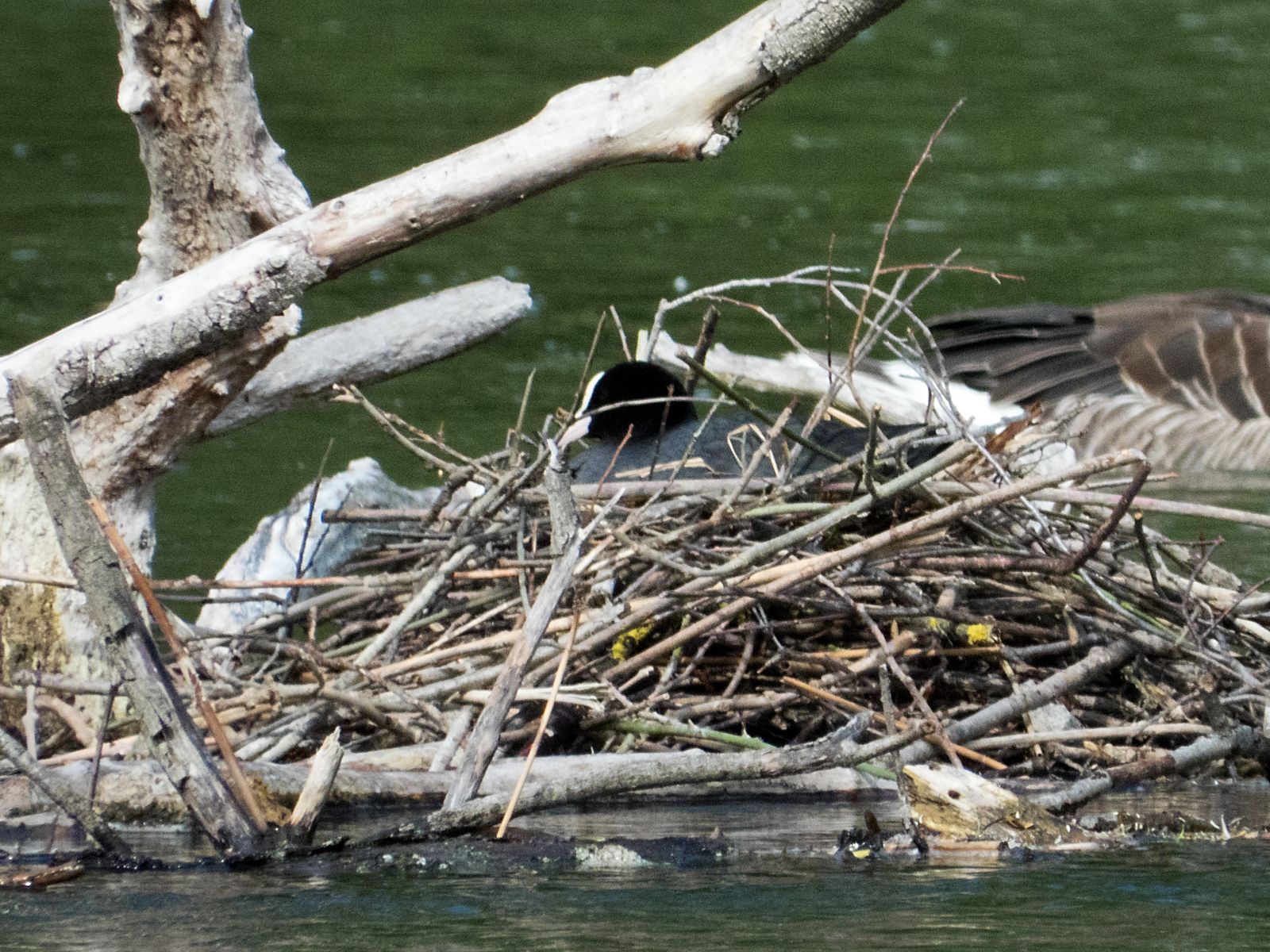 Brütendes Blesshuhn in einem ruhigen Seitenarm des Amperstausees