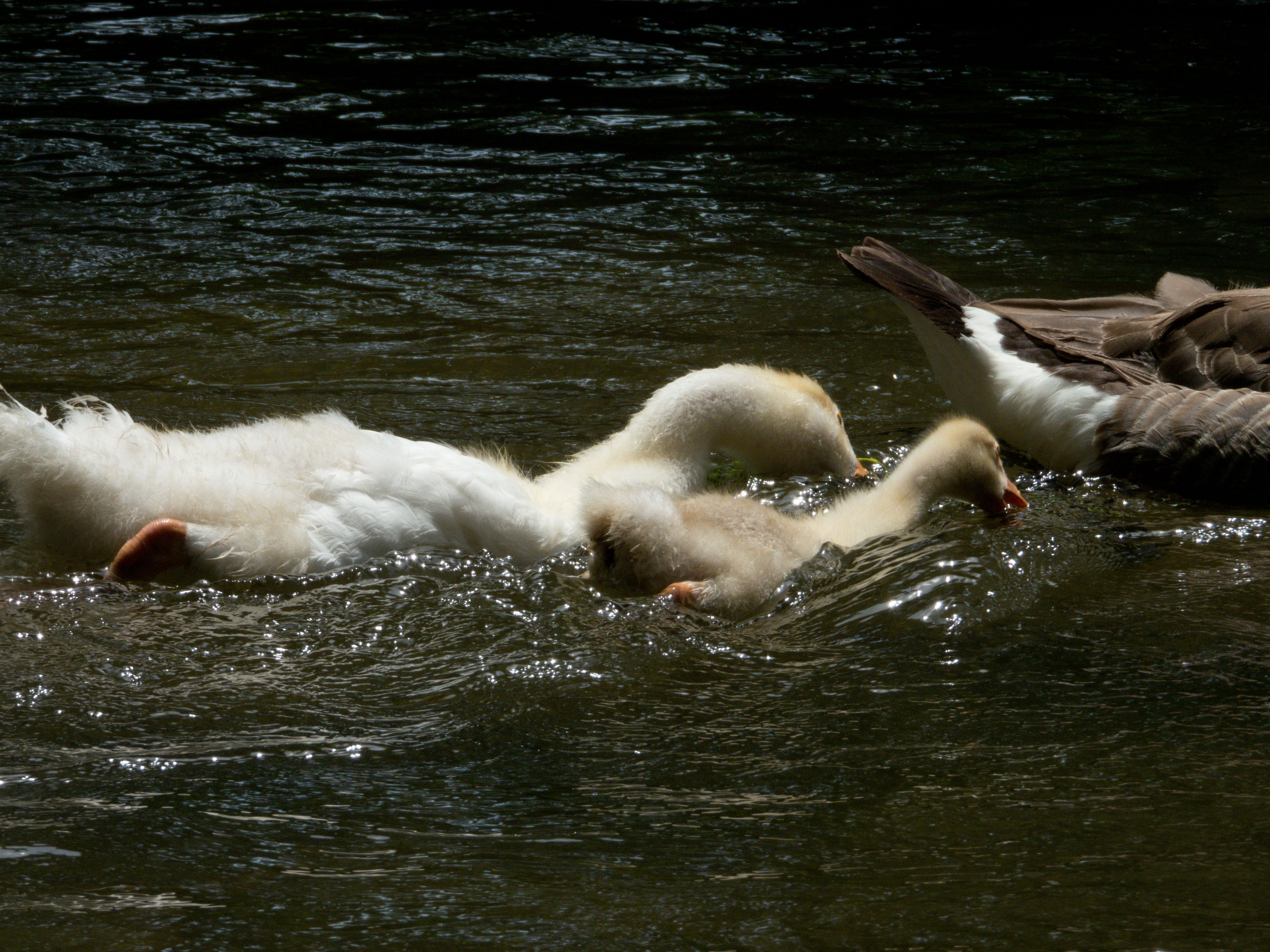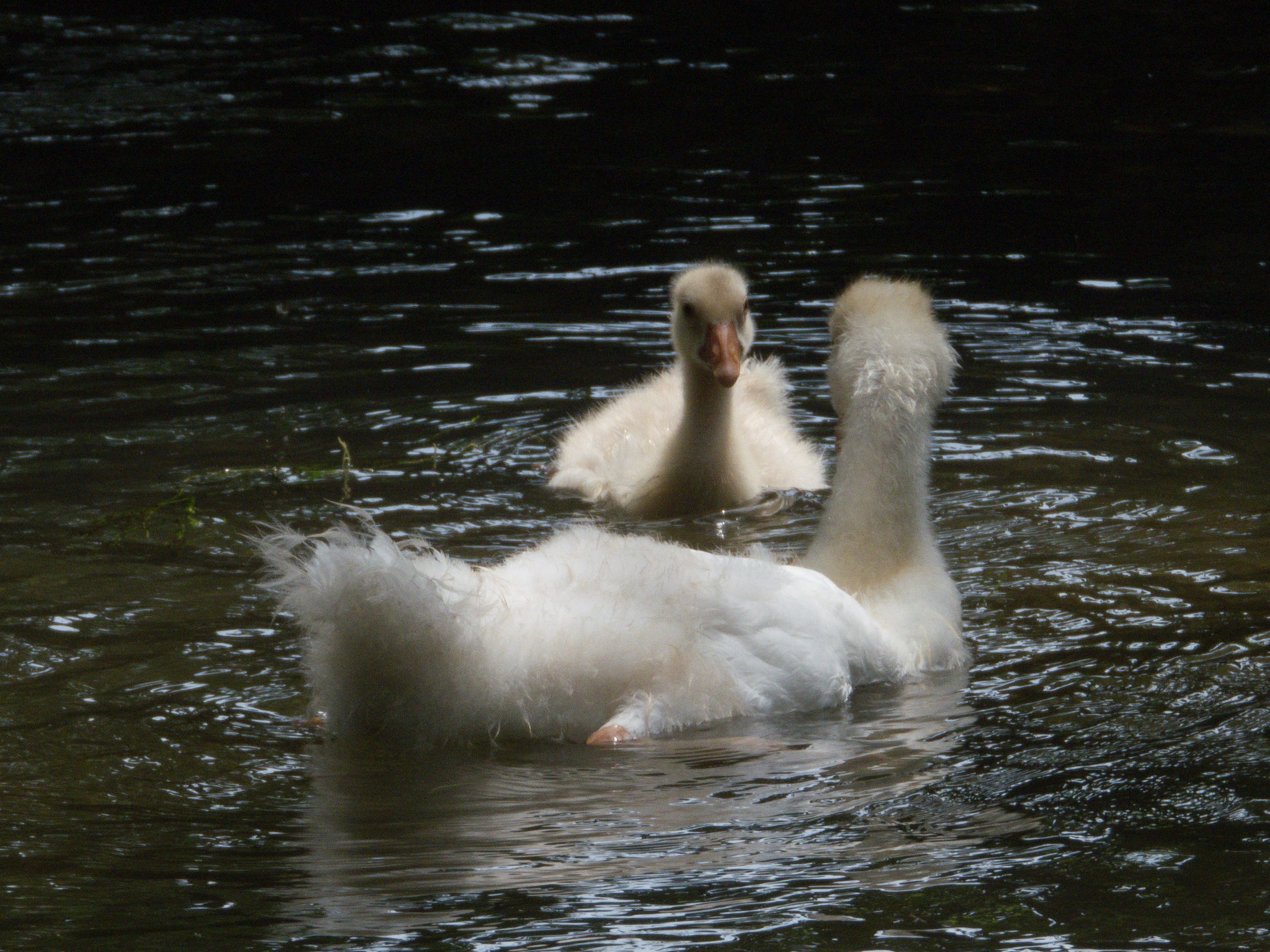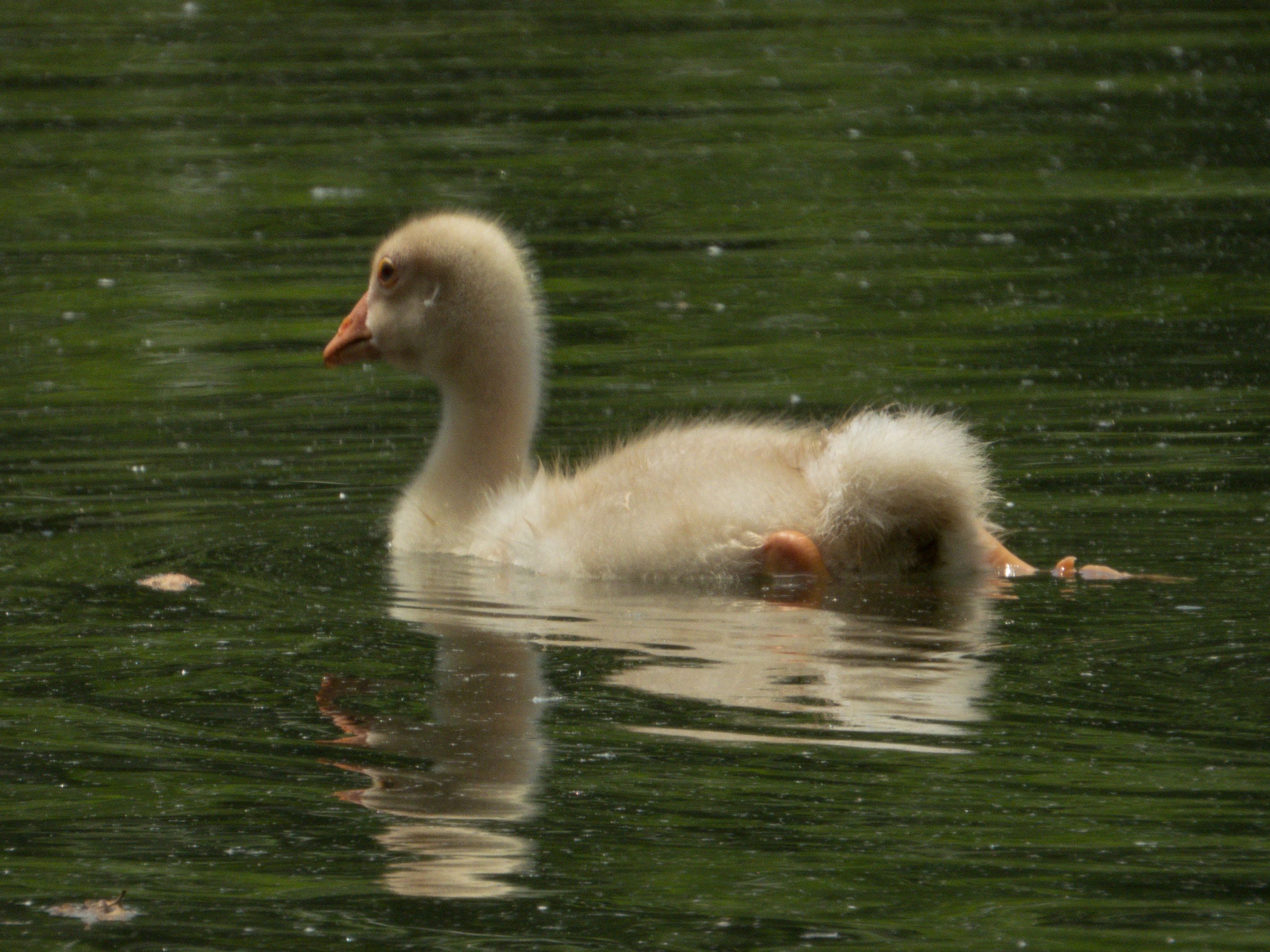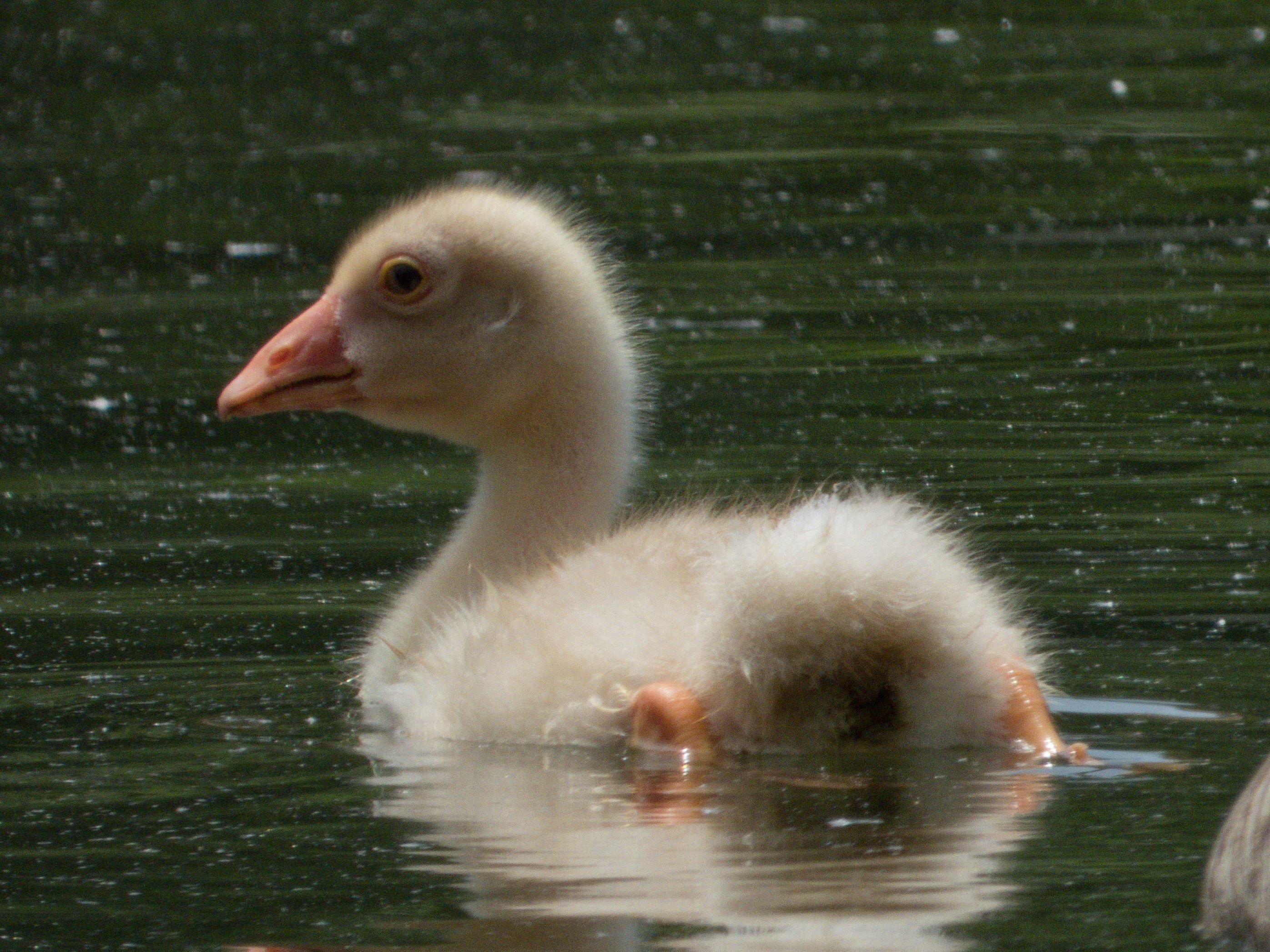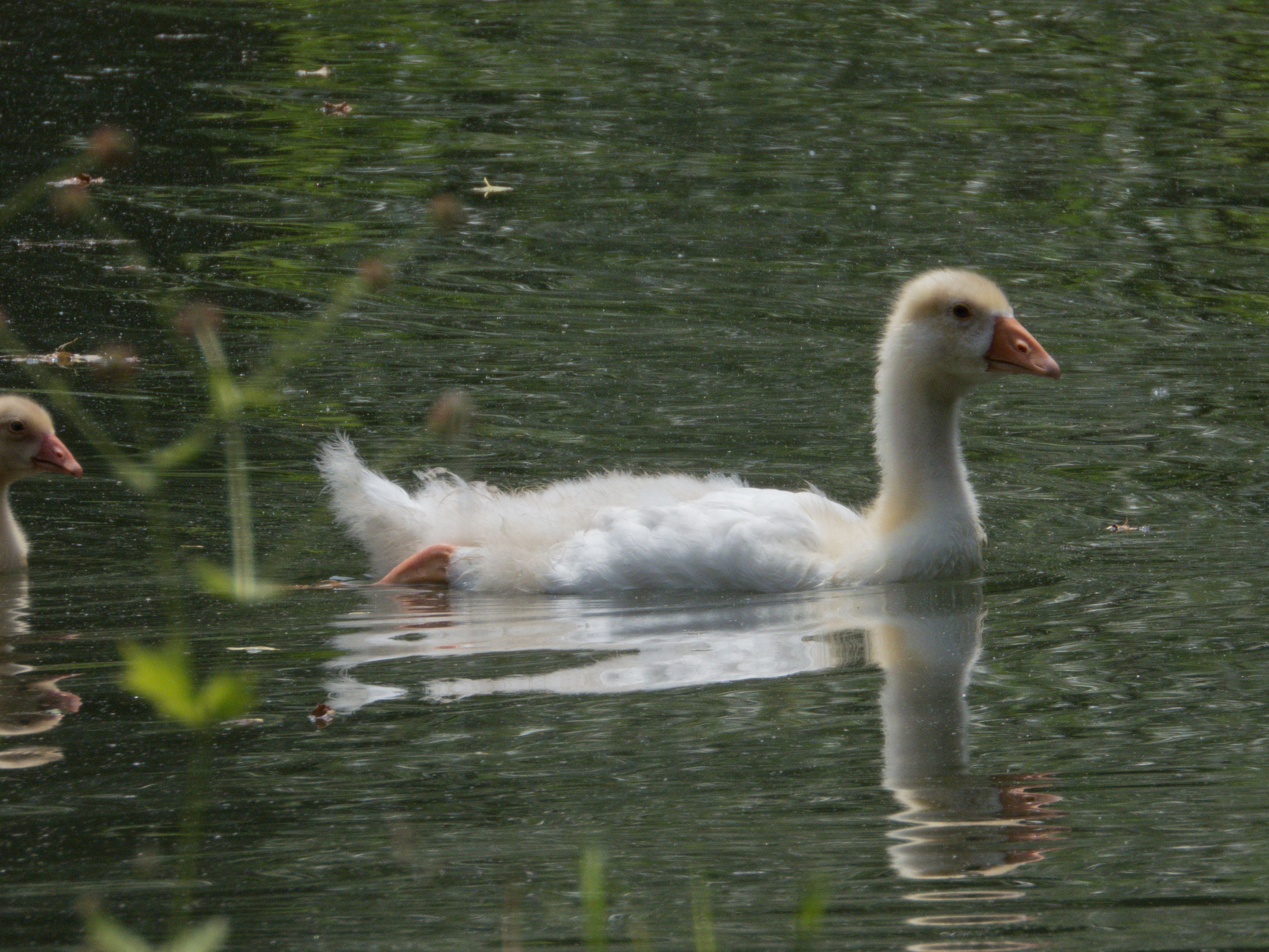 Die Gänsegruppe bog scharf rechts ab ins Wasser; das Gänschen hat den Anschluss verloren...