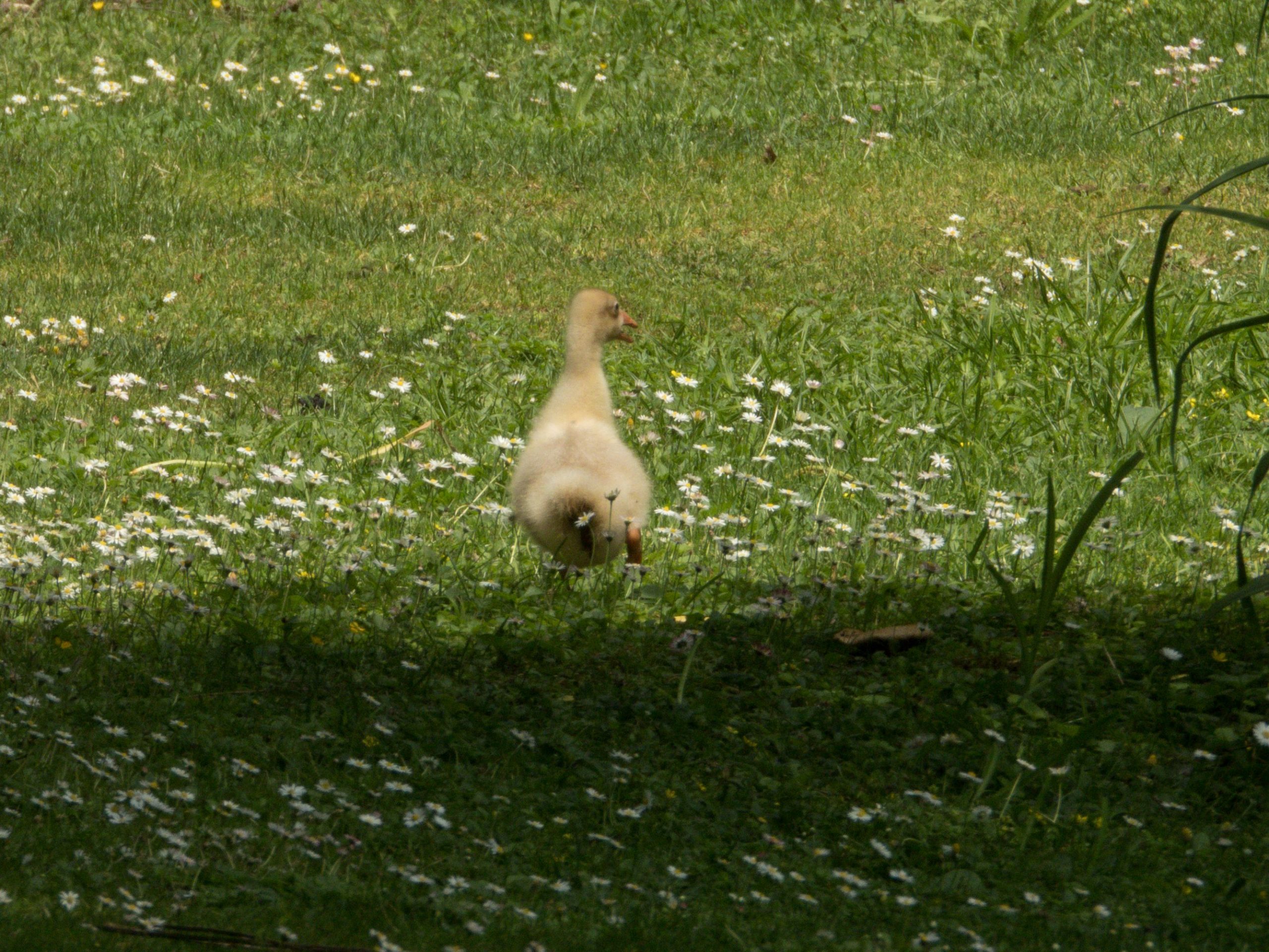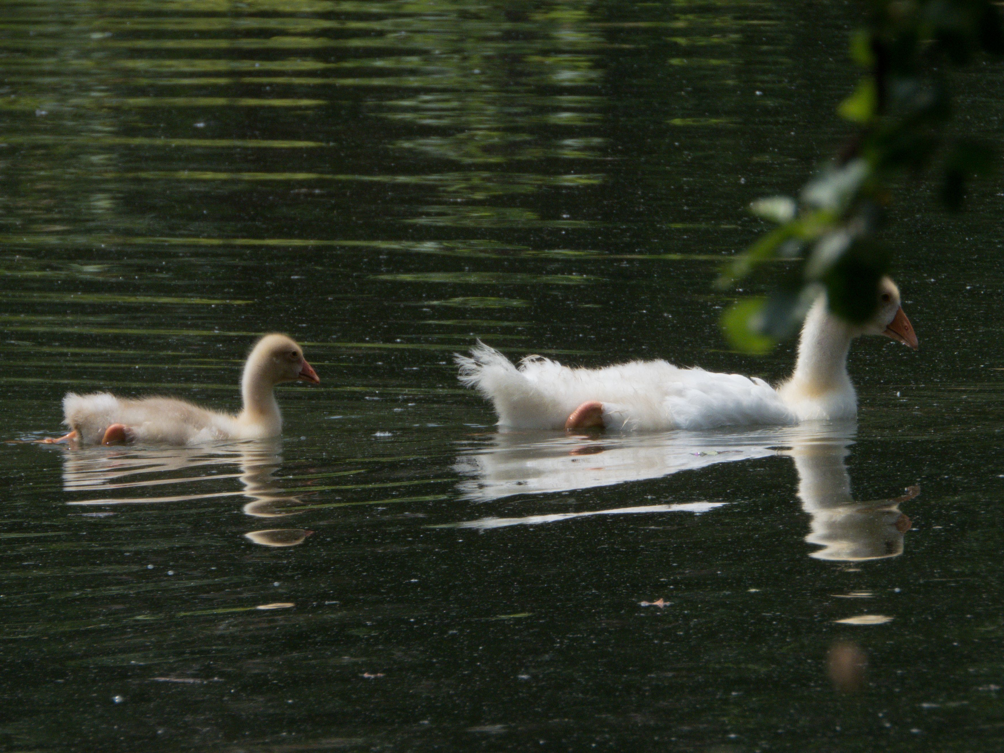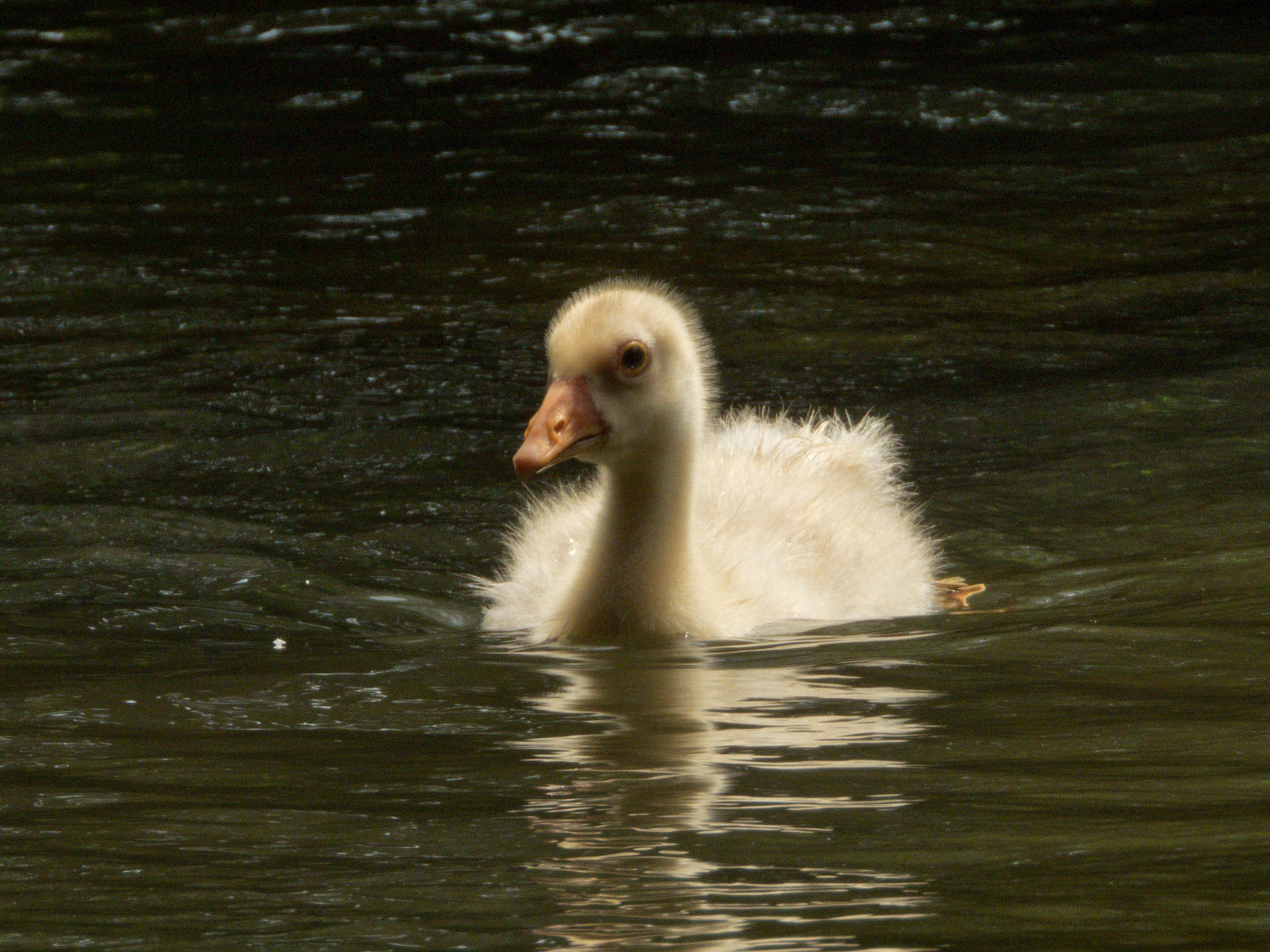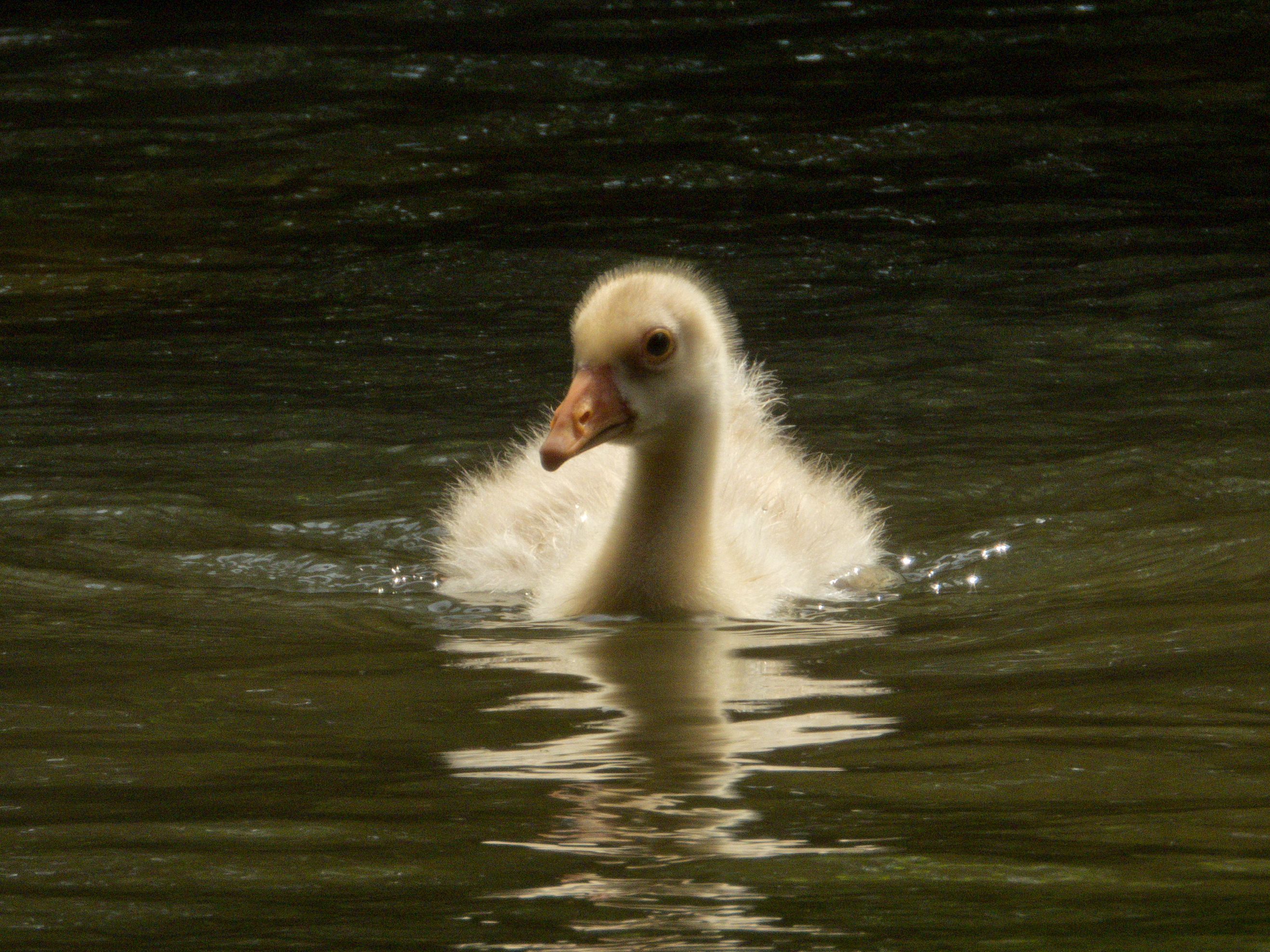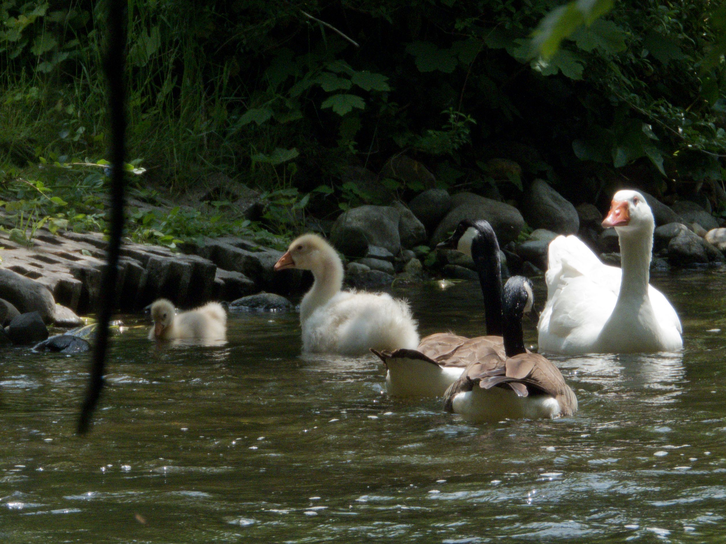 Die Gänsegruppe bog scharf rechts ab ins Wasser; das Gänschen hat den Anschluss verloren...