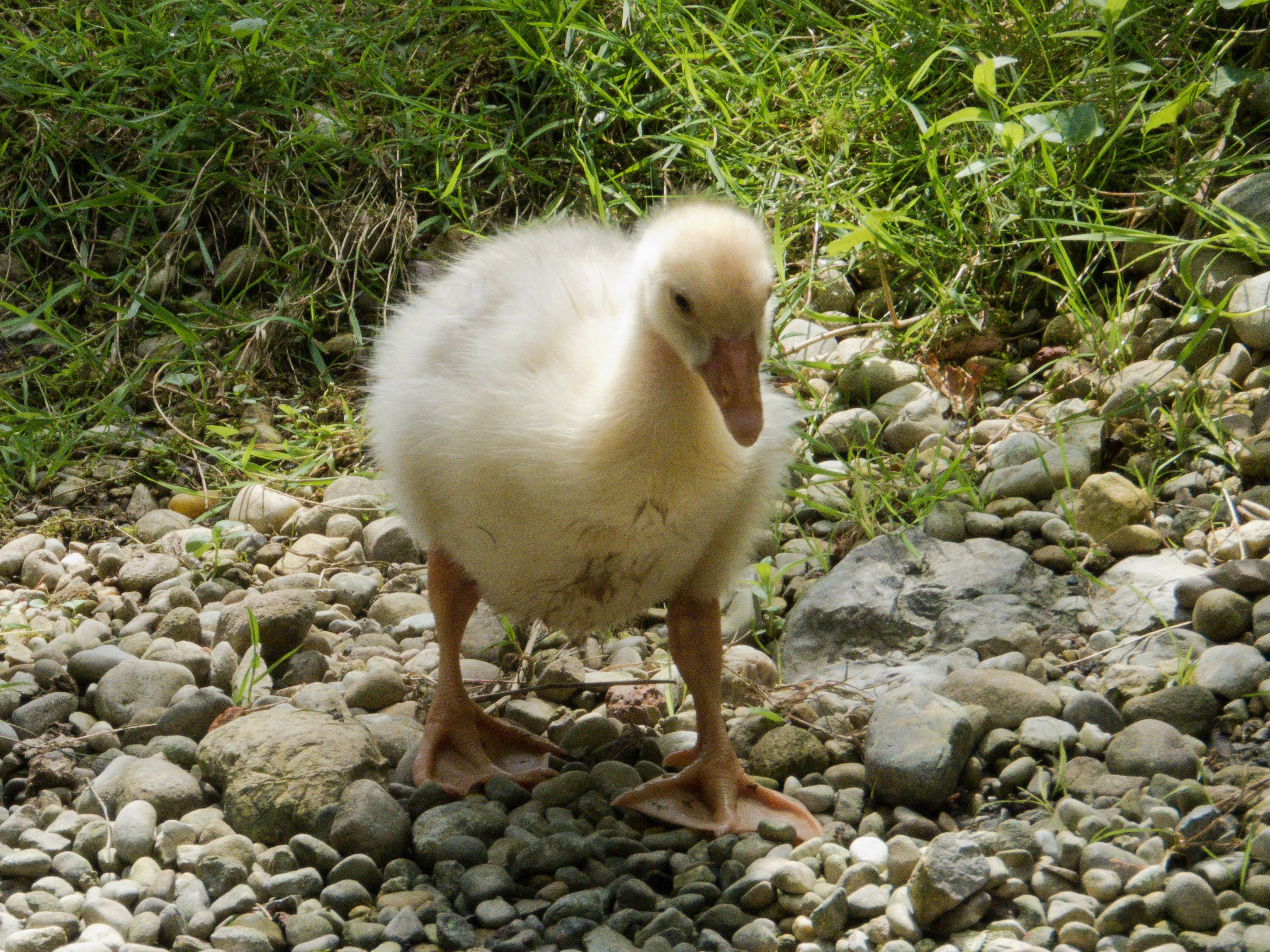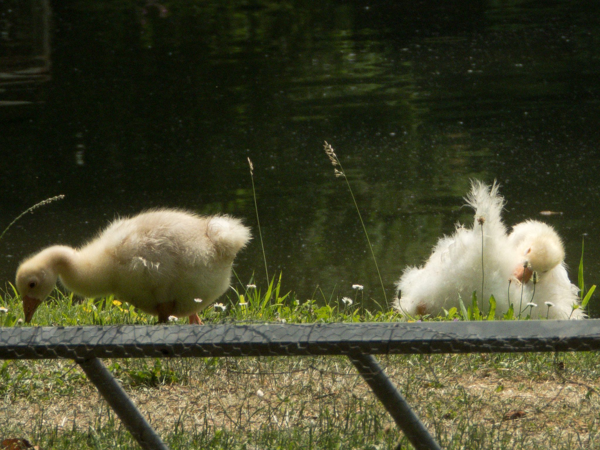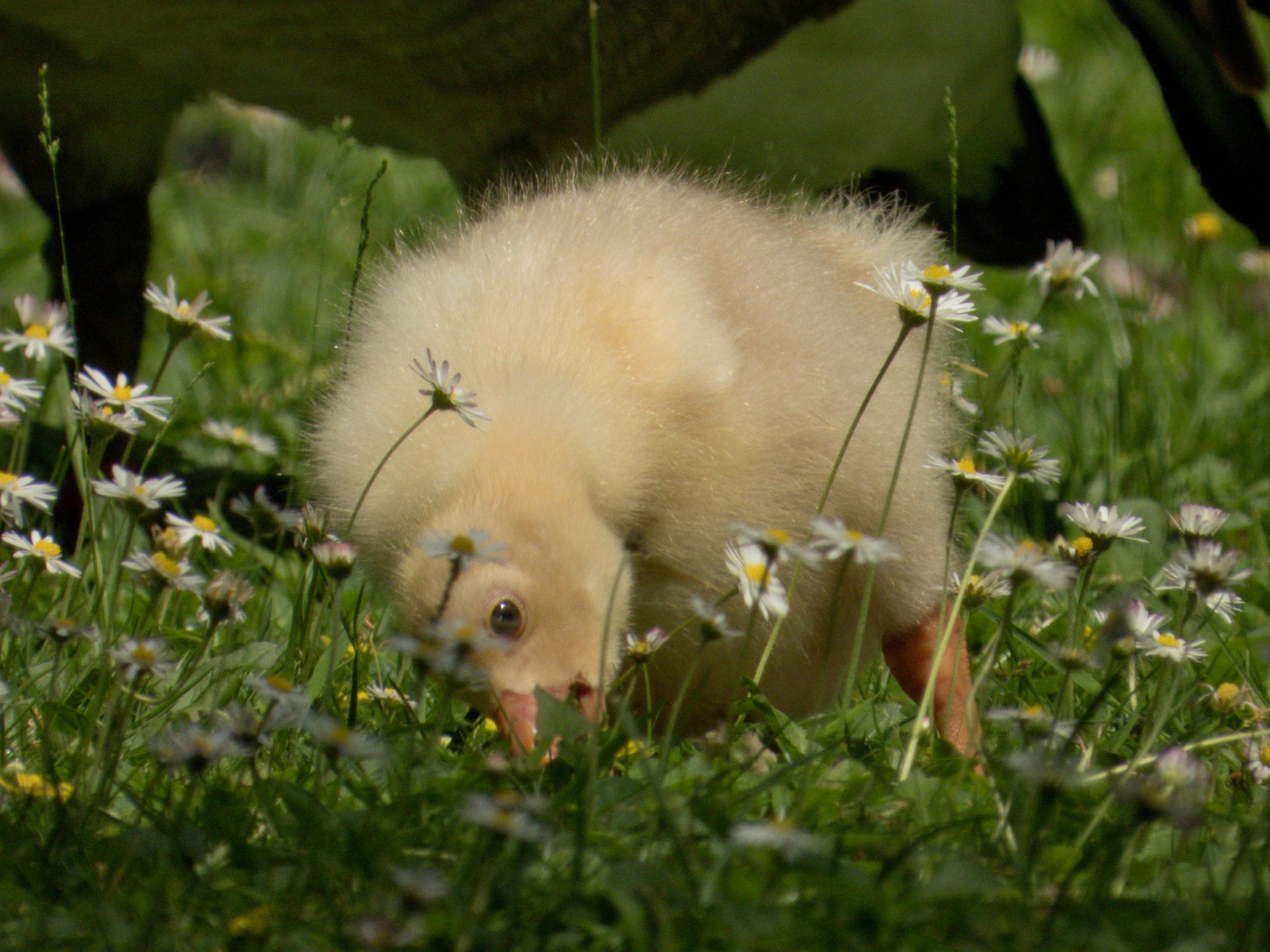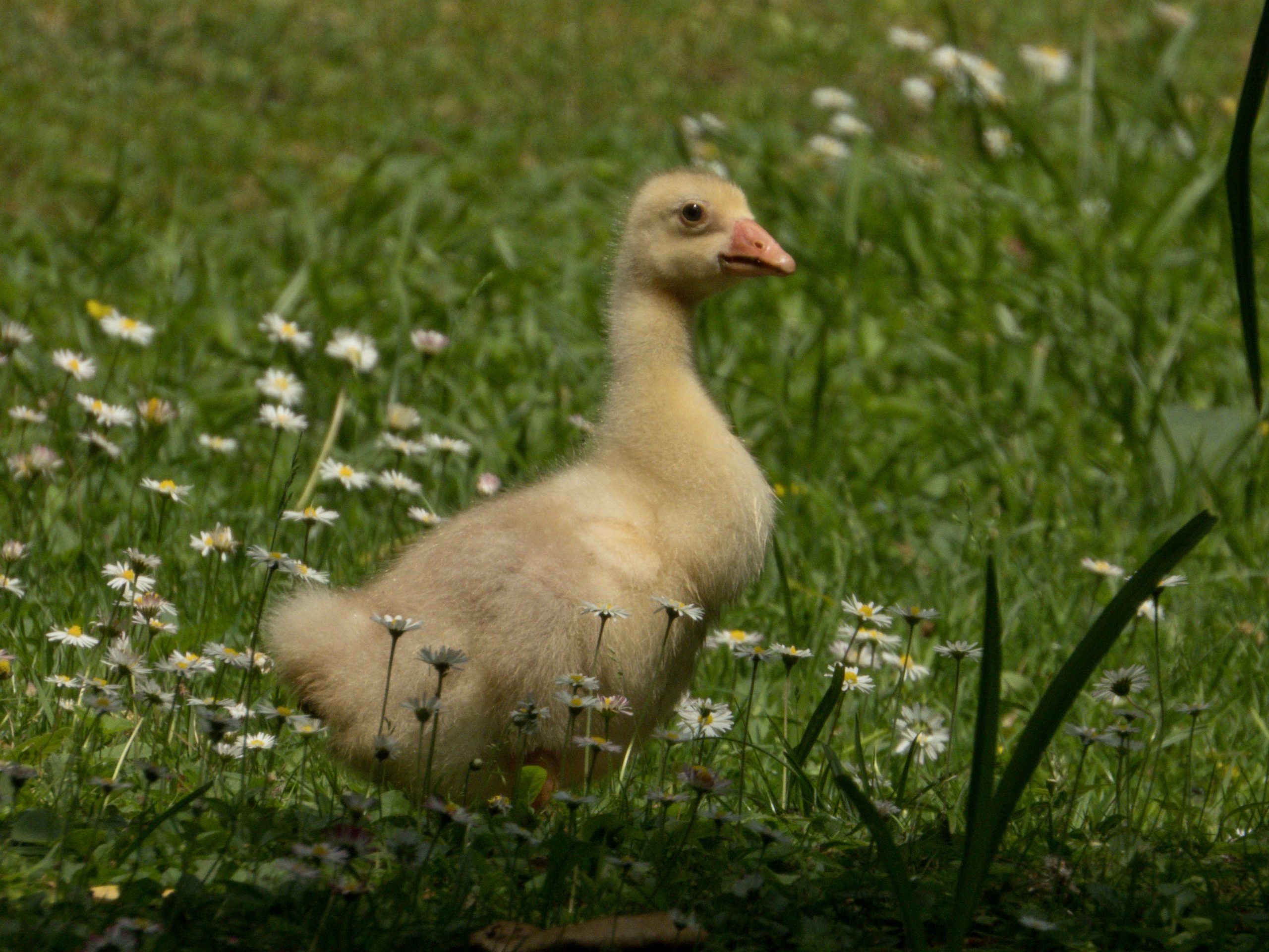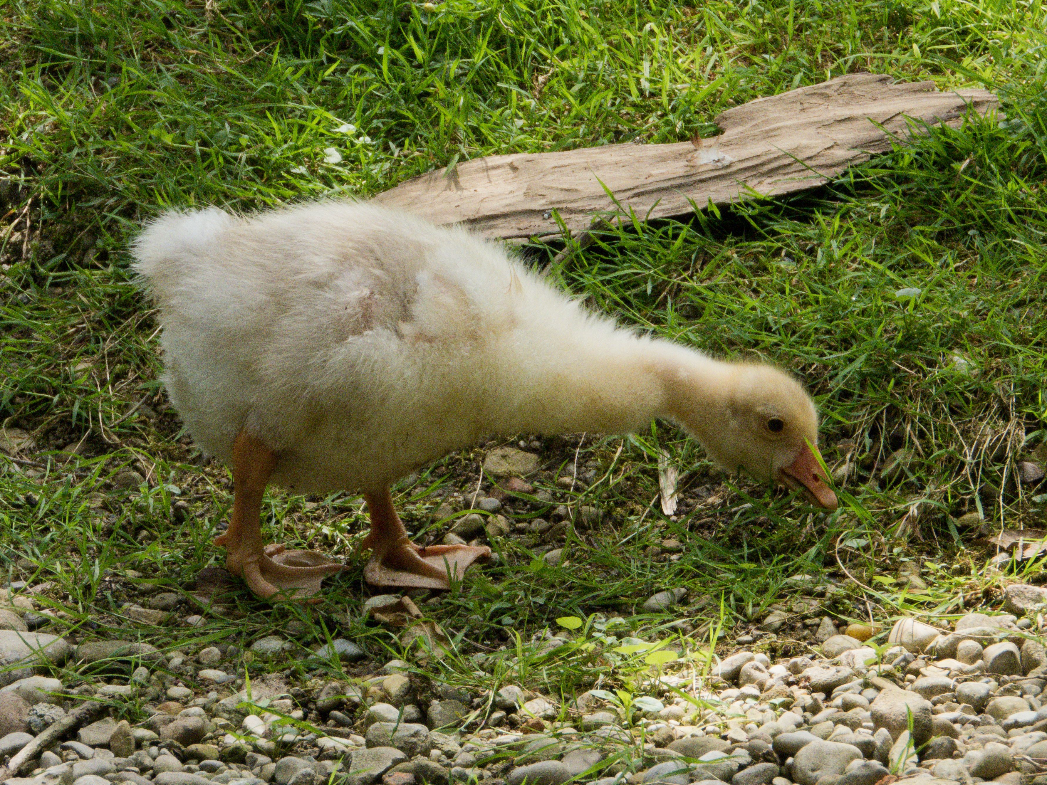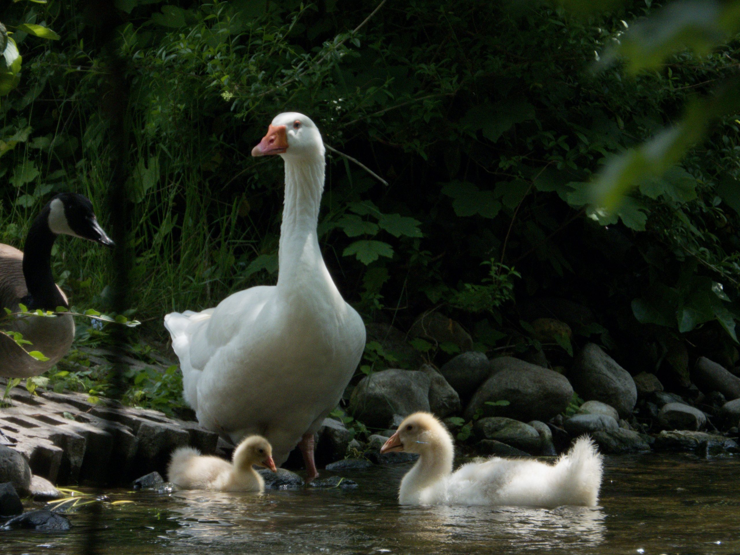 Die Gänsegruppe bog scharf rechts ab ins Wasser; das Gänschen hat den Anschluss verloren...