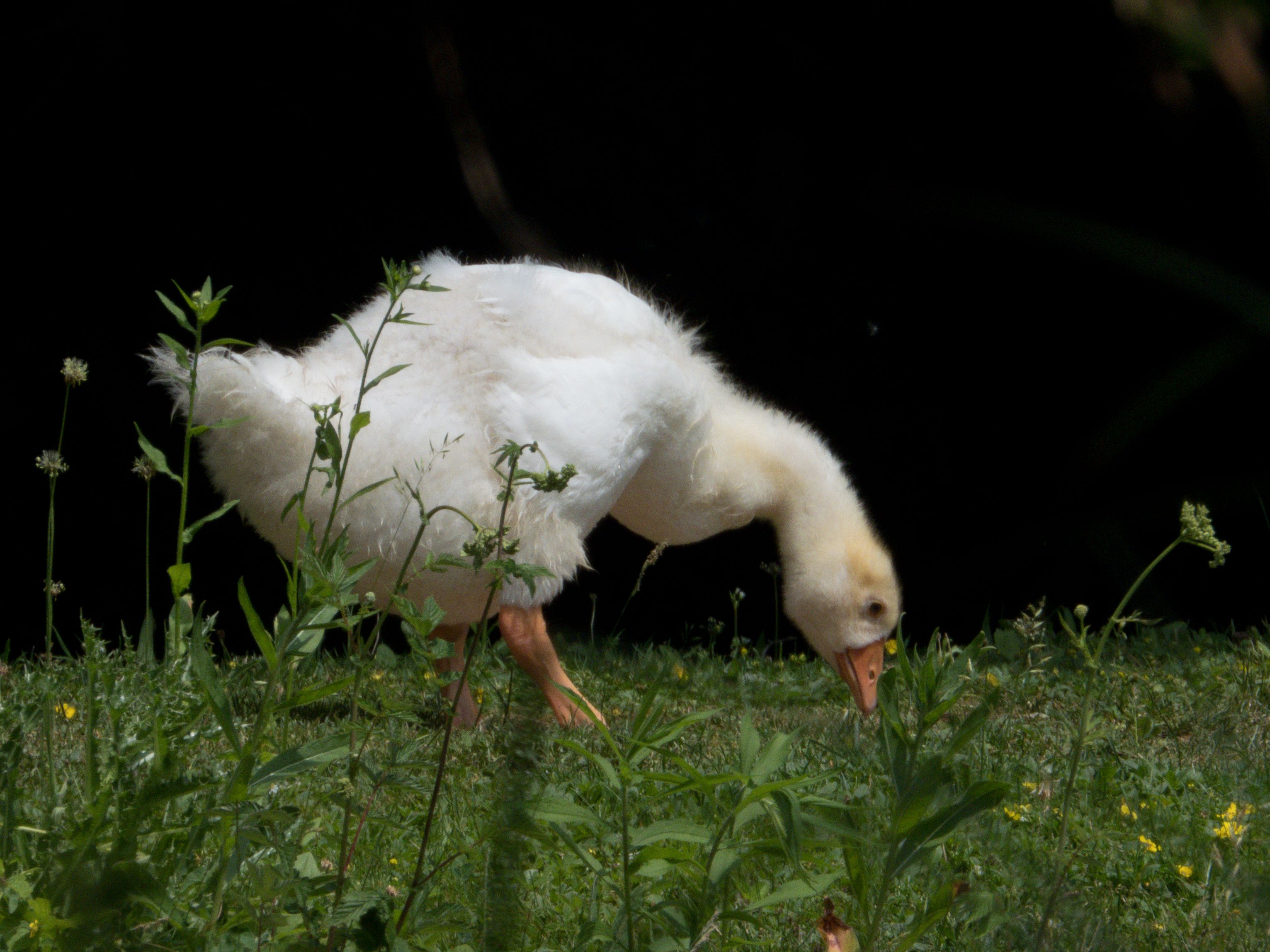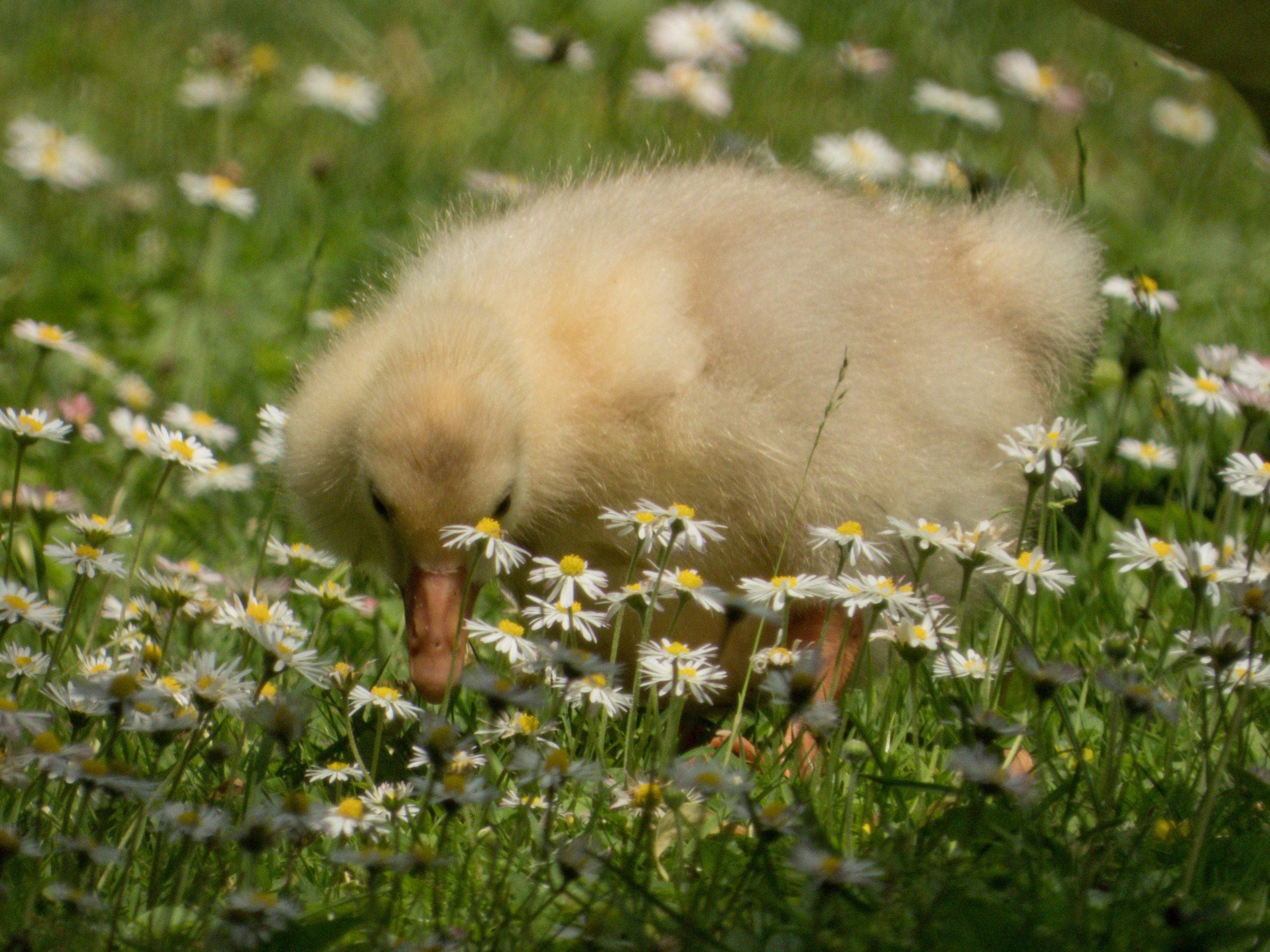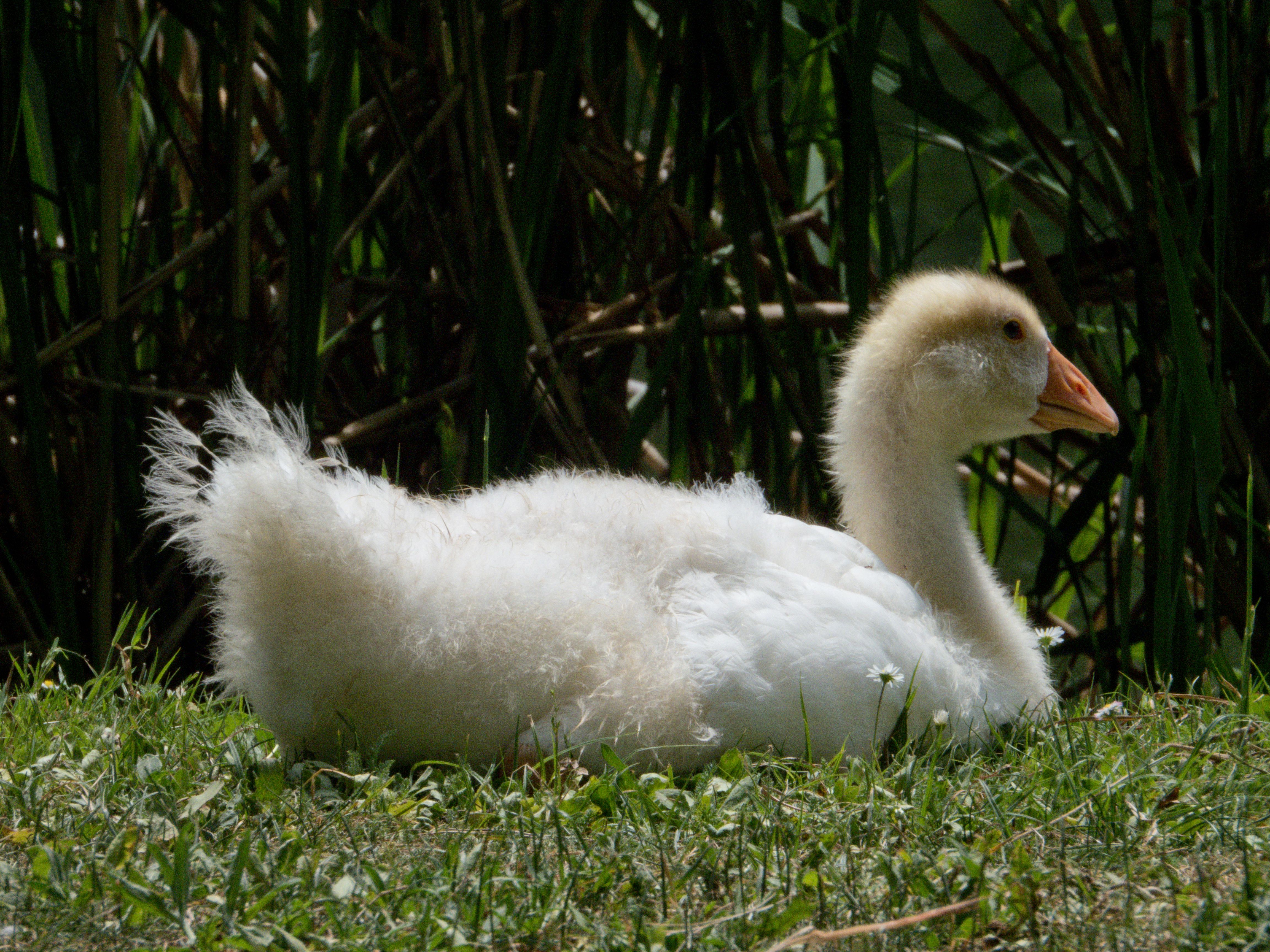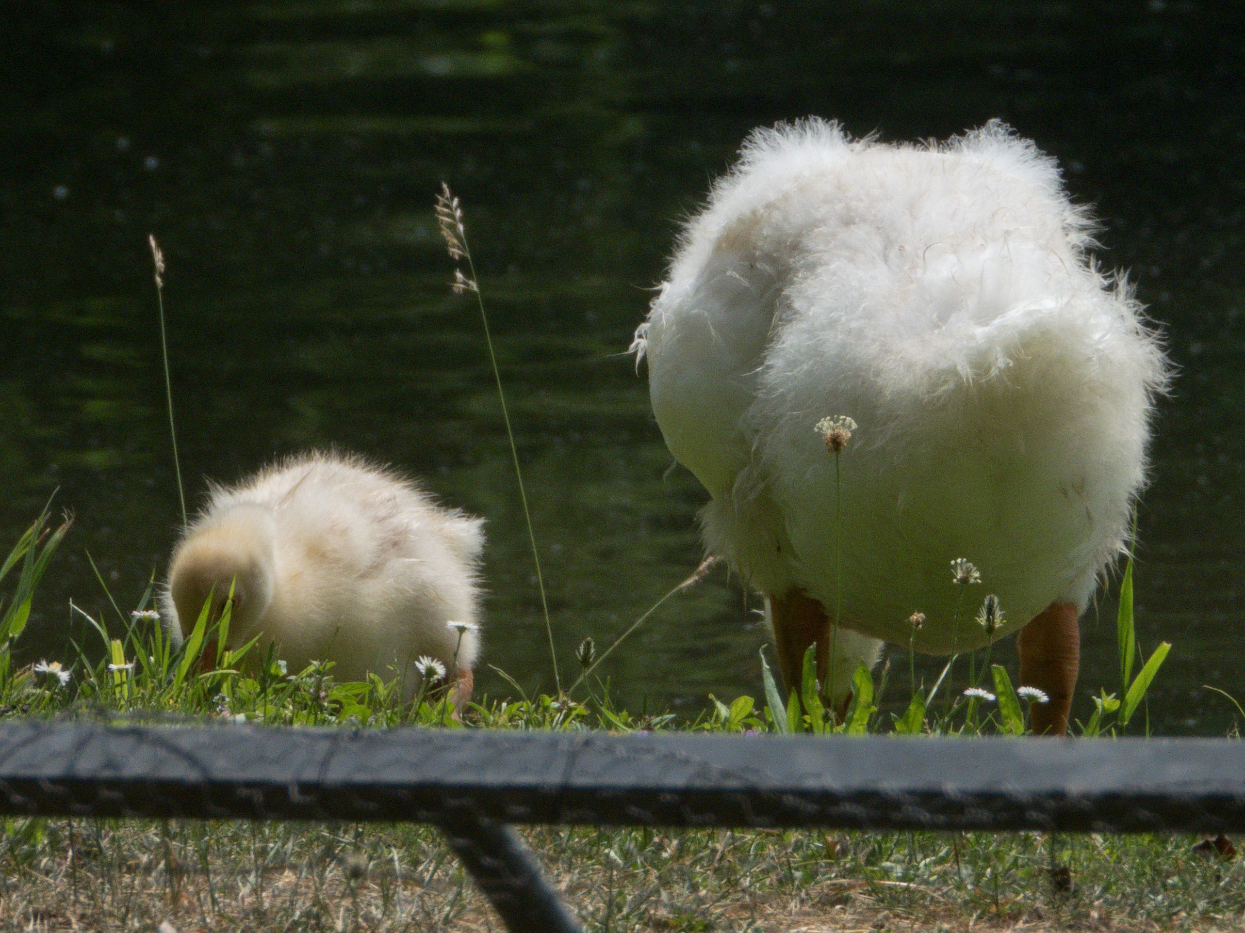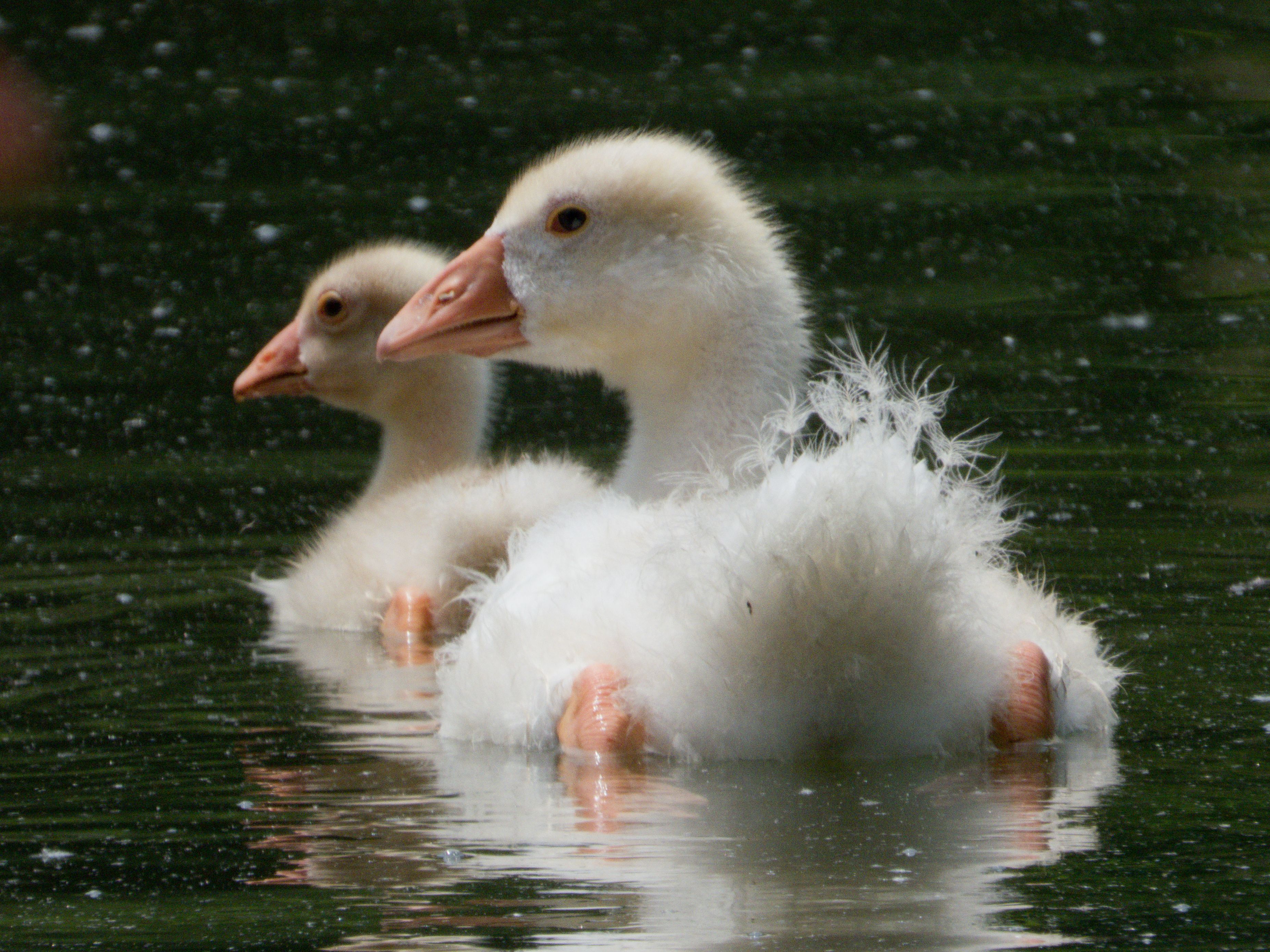 Die Gänsegruppe bog scharf rechts ab ins Wasser; das Gänschen hat den Anschluss verloren...
