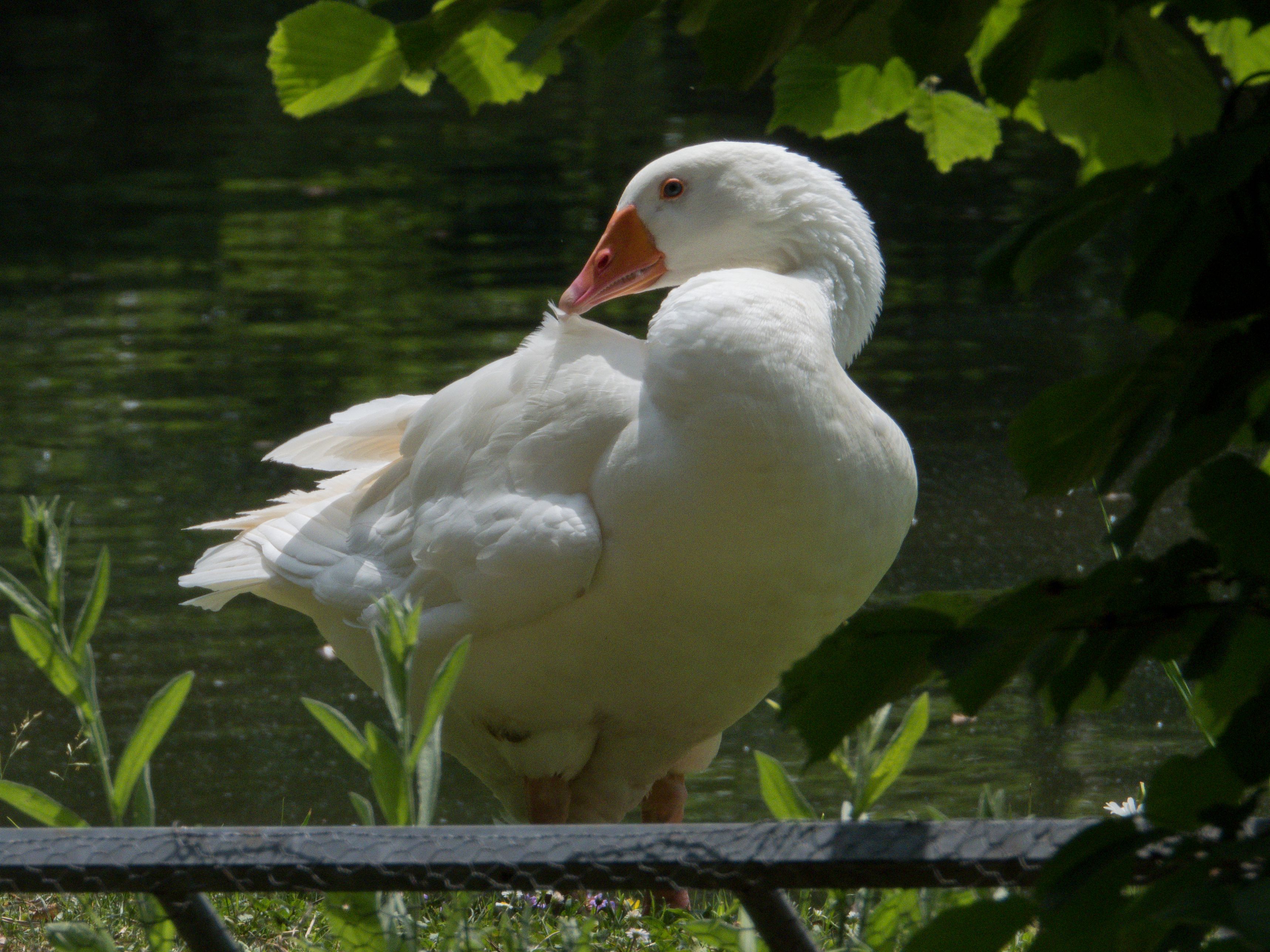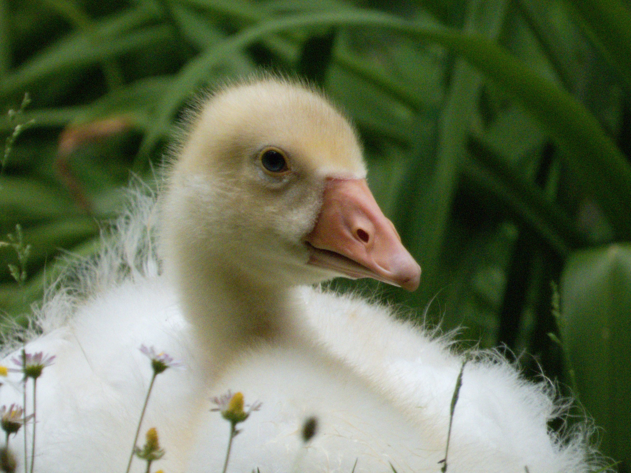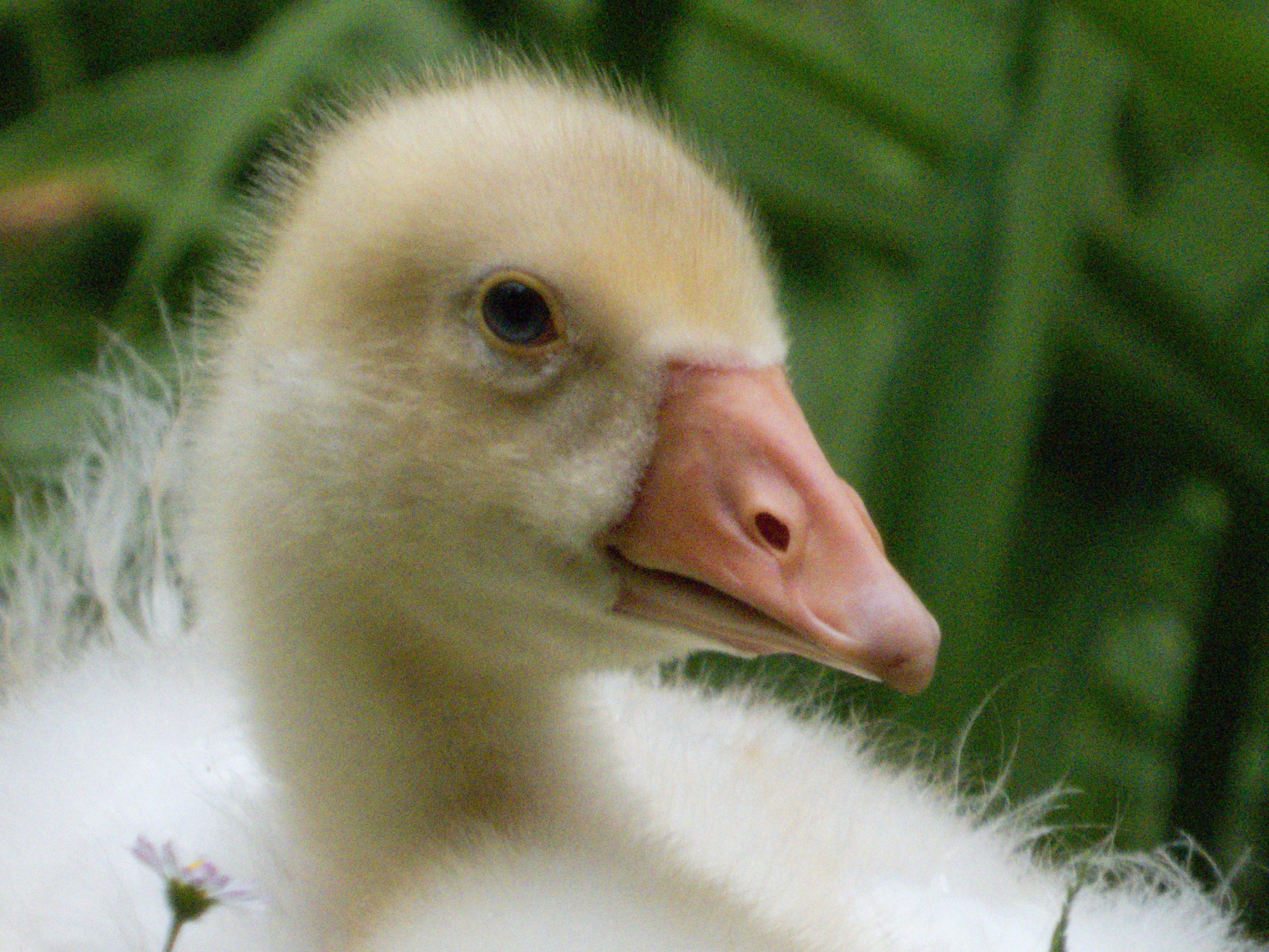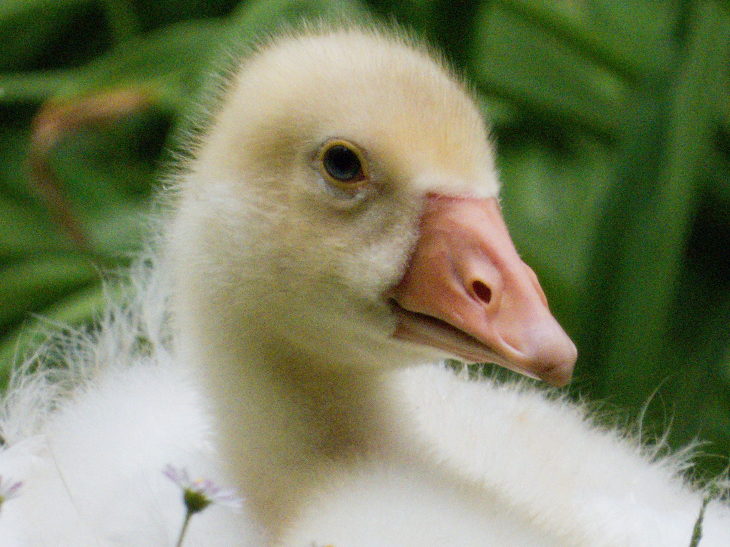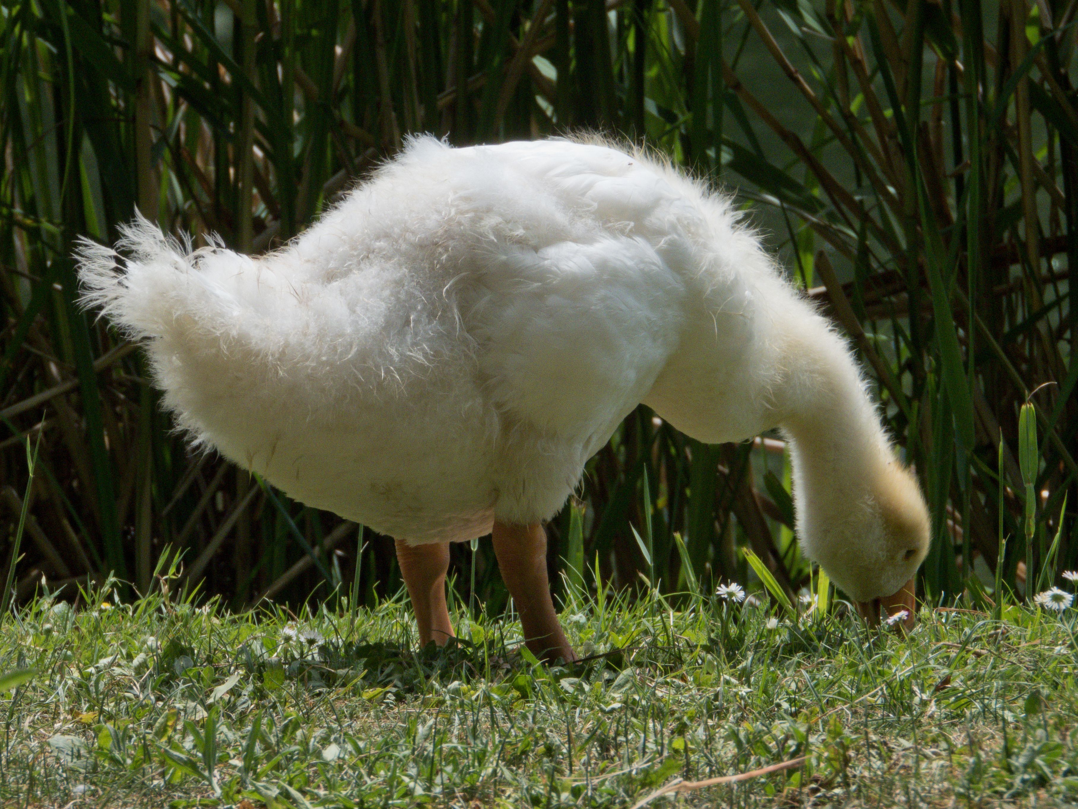 Die Gänsegruppe bog scharf rechts ab ins Wasser; das Gänschen hat den Anschluss verloren...